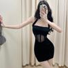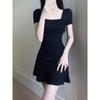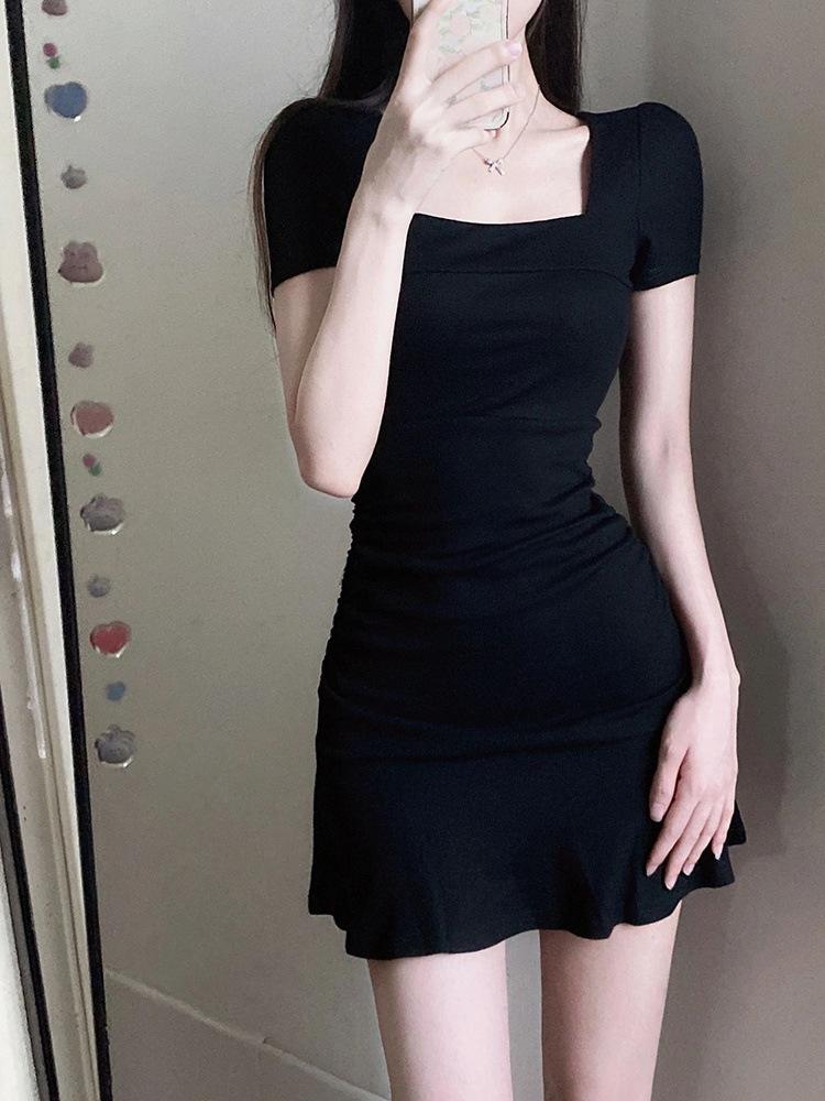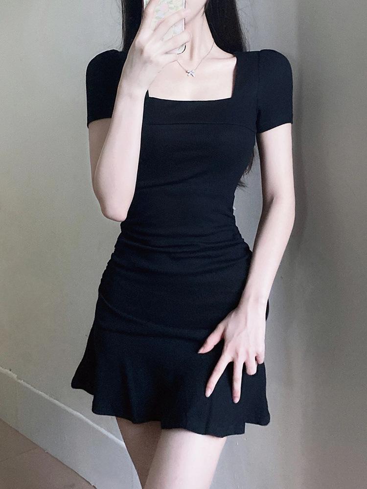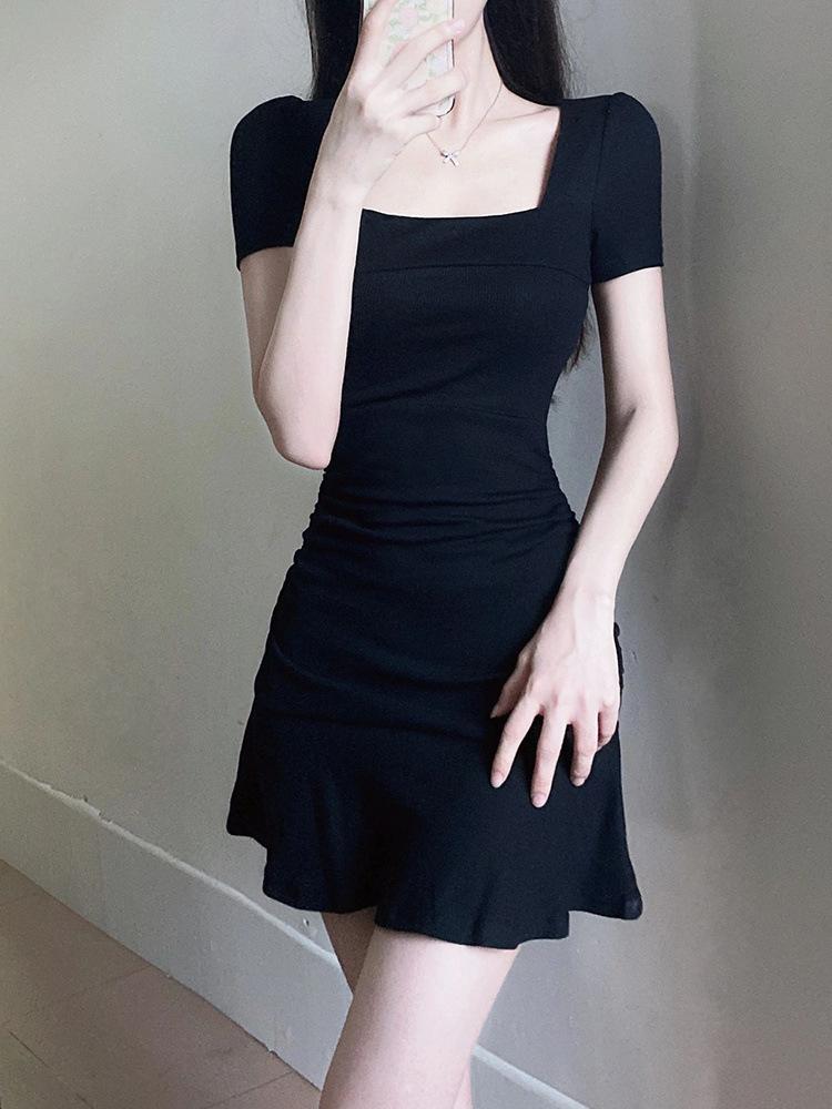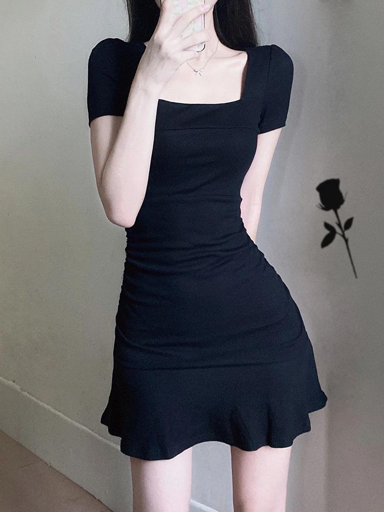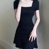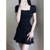 Vestido de verano con cuello cuadrado y cola de pez, estilo Spice Girl, nuevo estilo francés, cintura ajustada, falda negra ajustada, falda corta para mujer