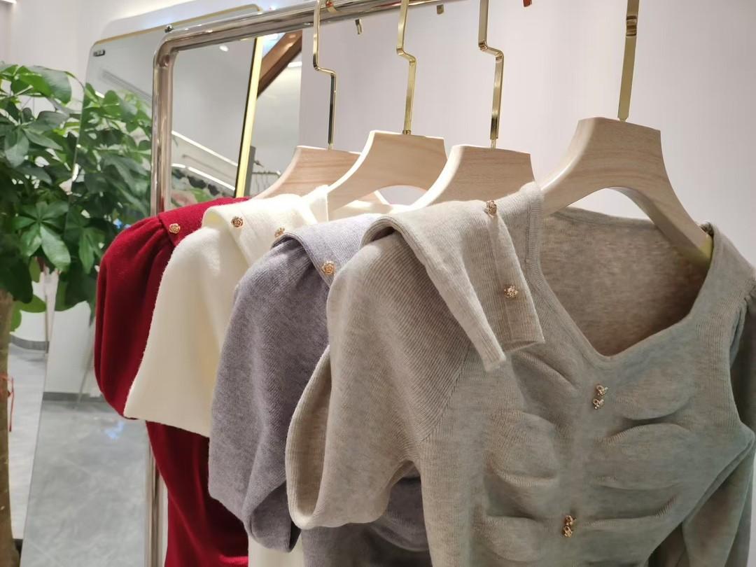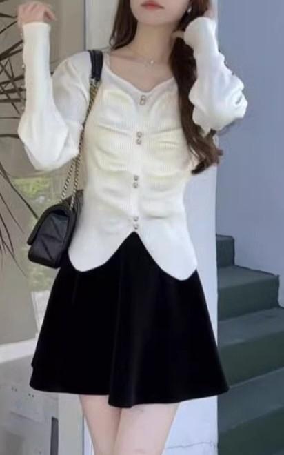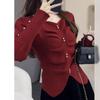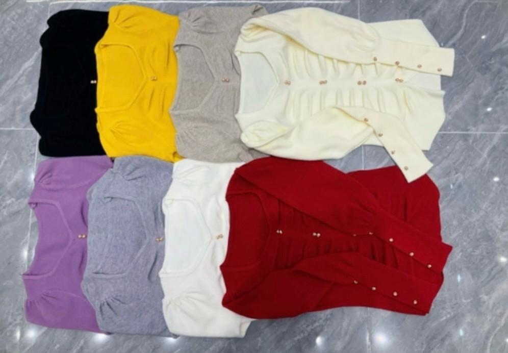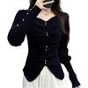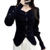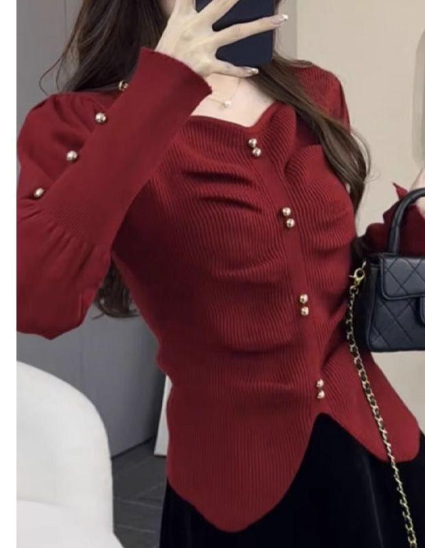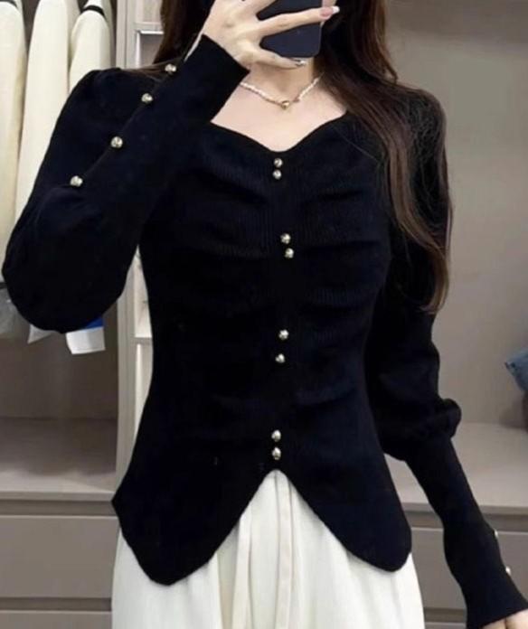 Camiseta de Punto con Pliegues y Cuello Cuadrado para Mujer en Otoño e Invierno con Mangas Abullonadas, Chic, Hermosa y a la Moda Top de Punto Interior