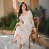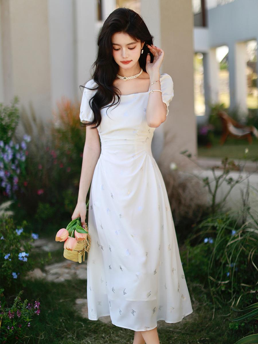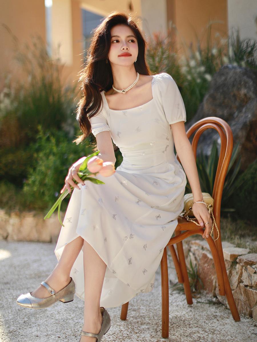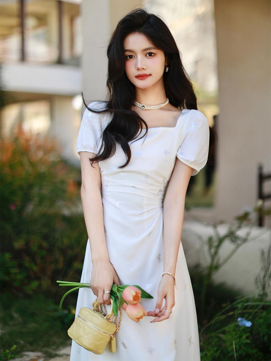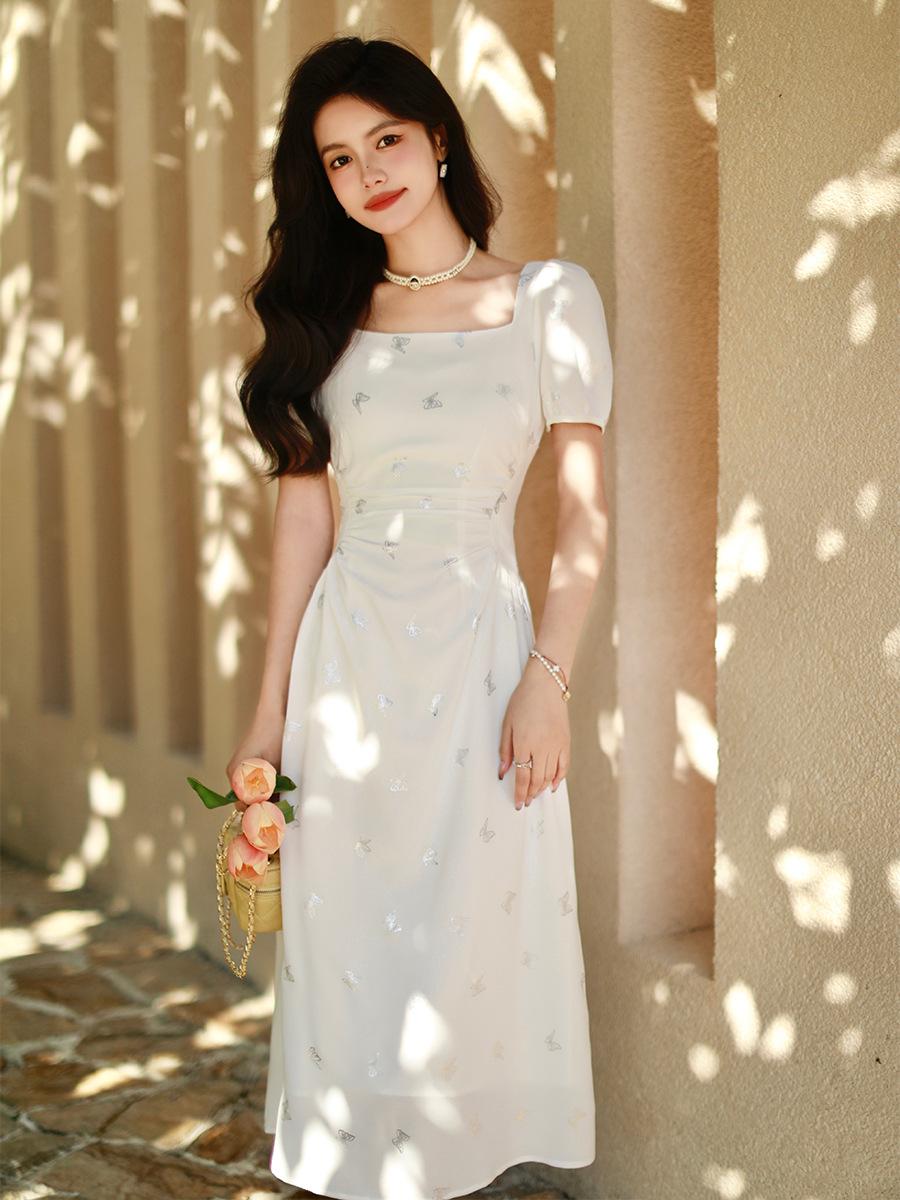 Vestido elegante francés blanco con cuello cuadrado para mujer, novedad de verano 2024, vestido largo ajustado de alta gama.
