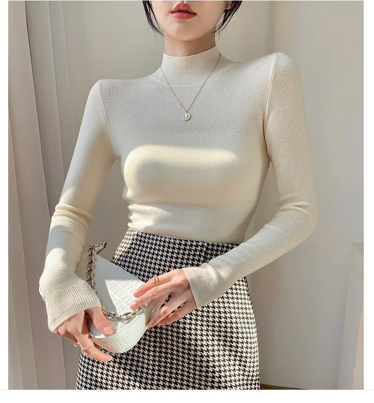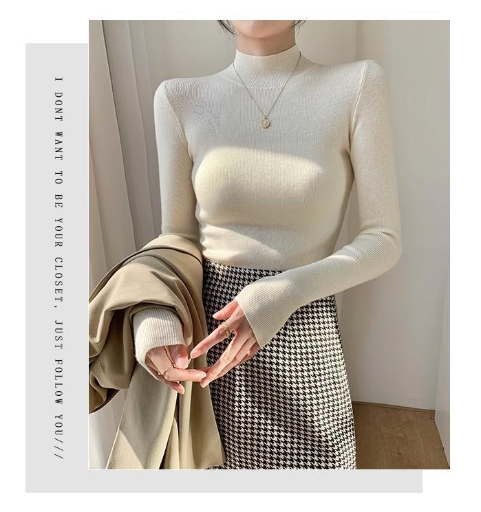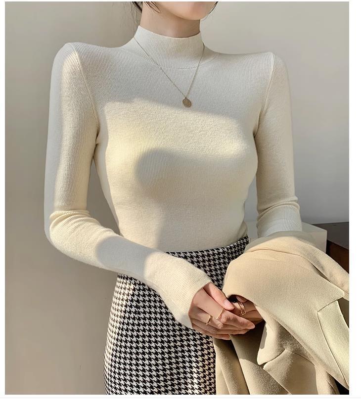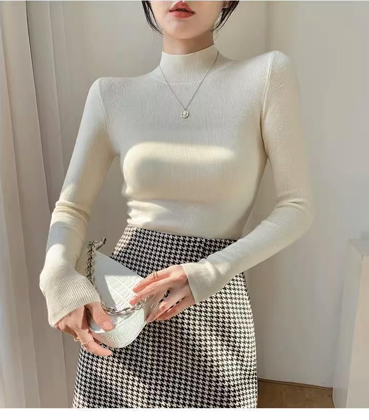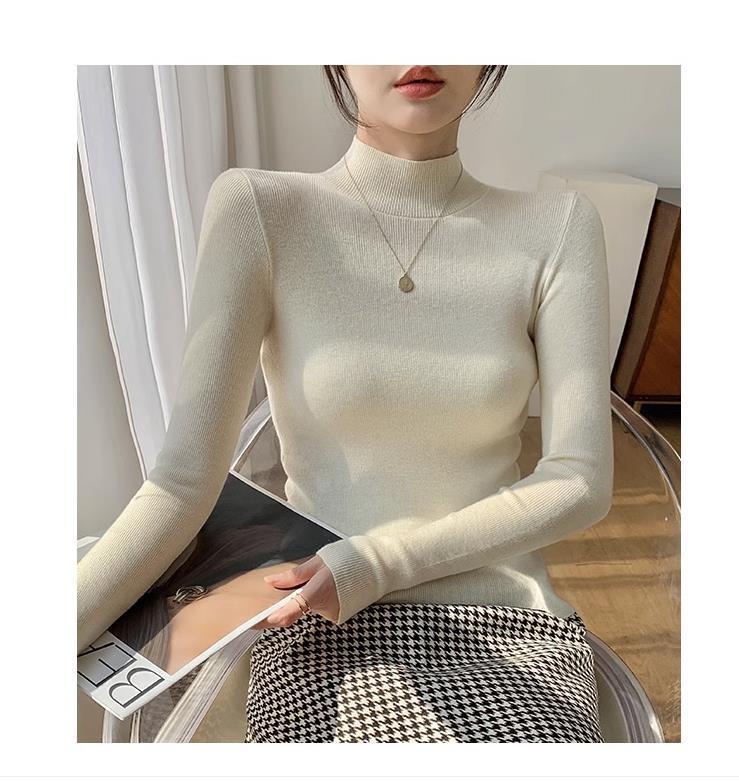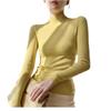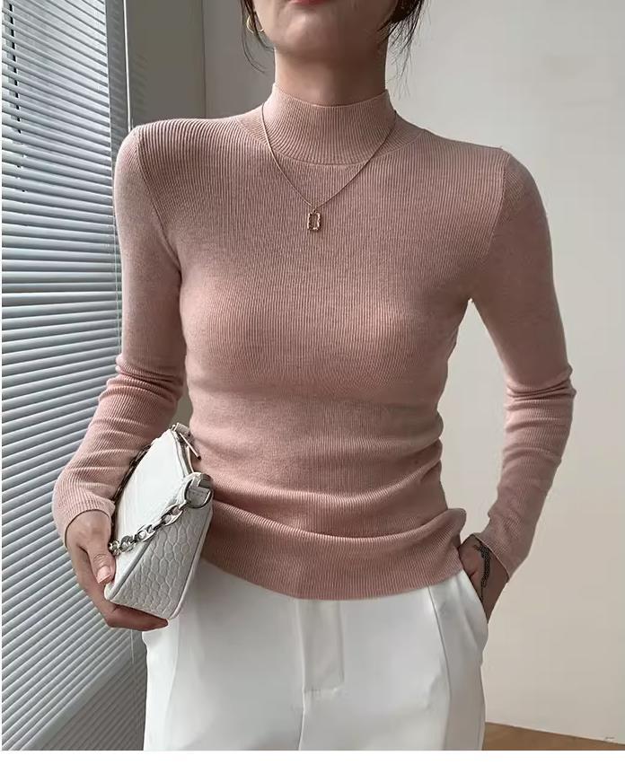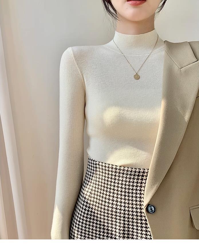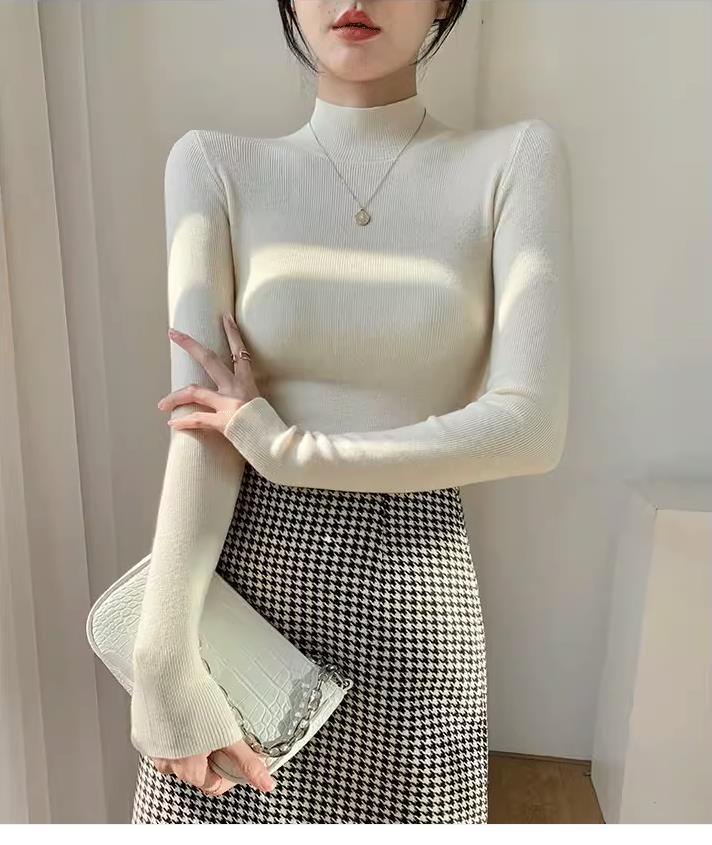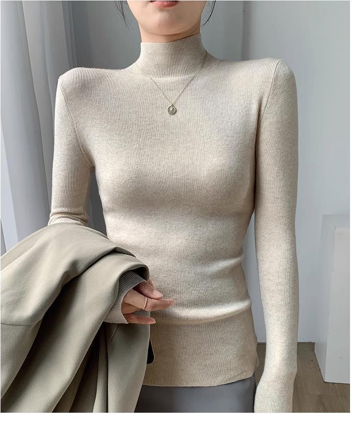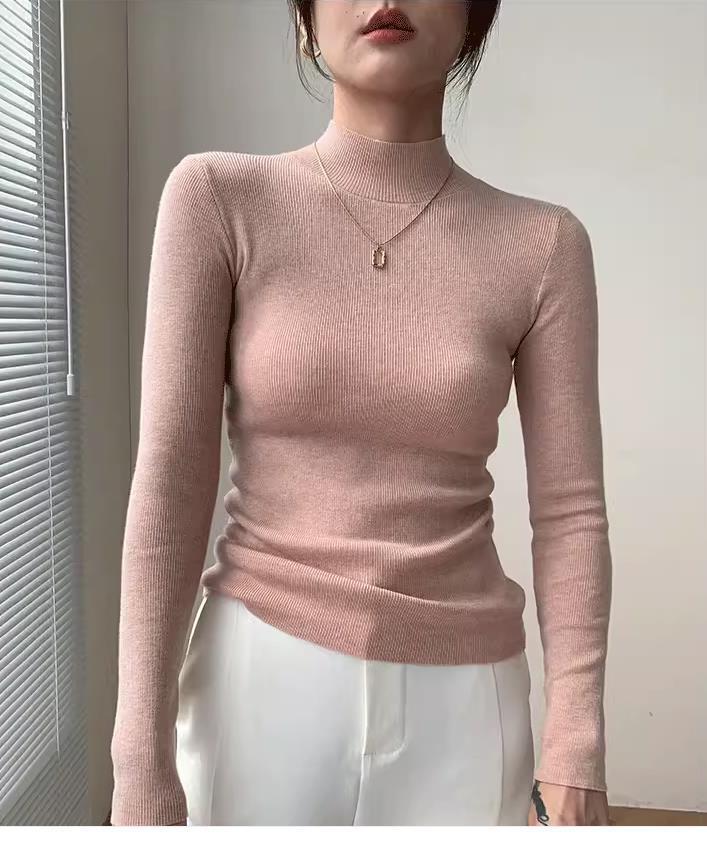 Suéter de cuello semialto color albaricoque para mujer, otoño e invierno 2024, nuevo, corte entallado, adelgazante, temperamento interior, camisa de manga larga para mujer