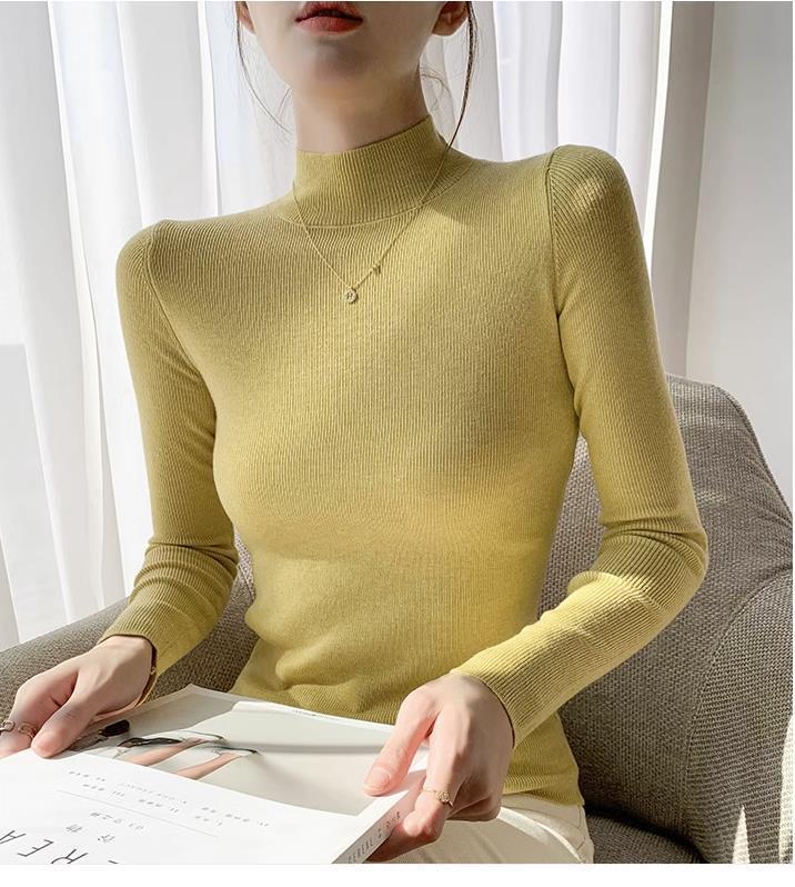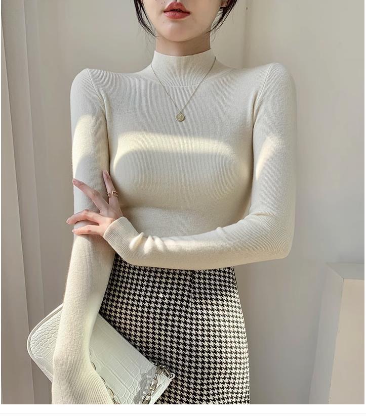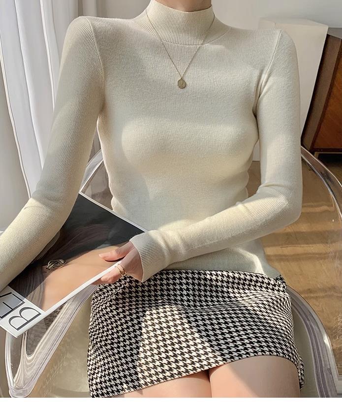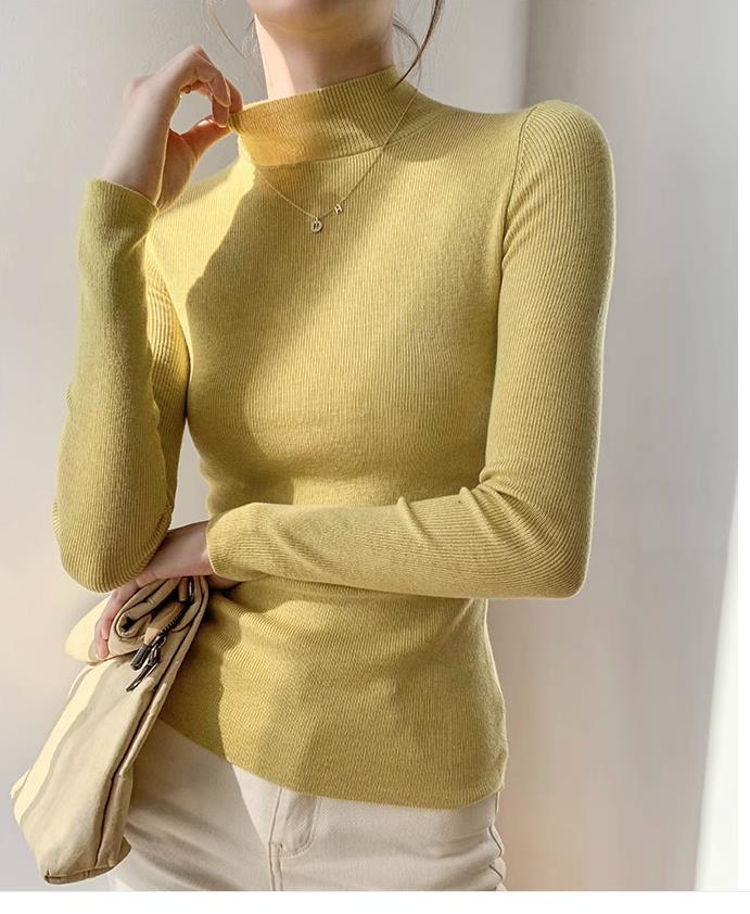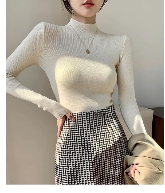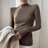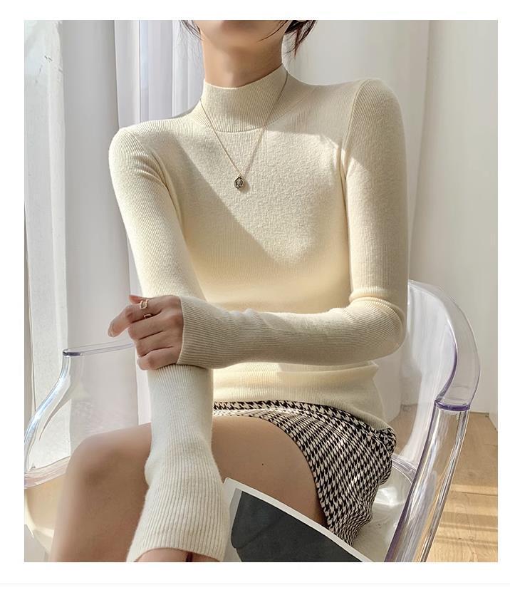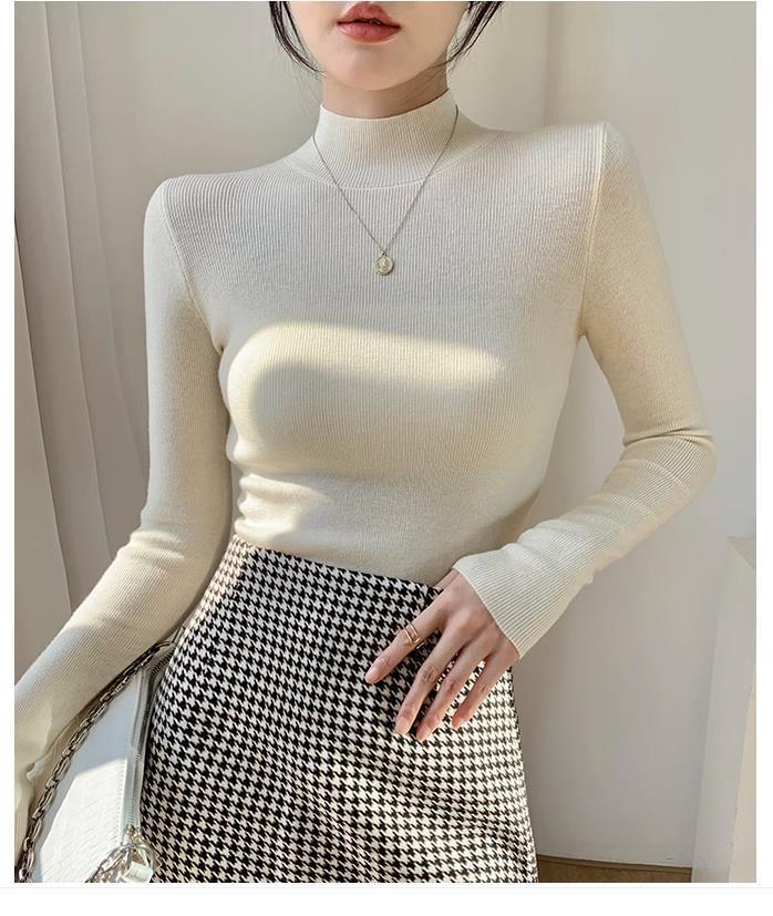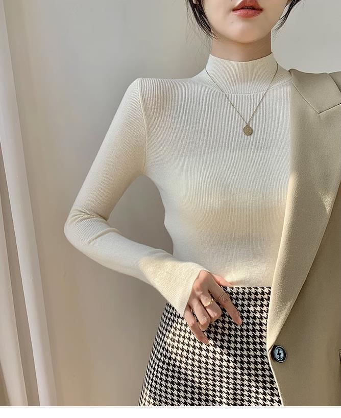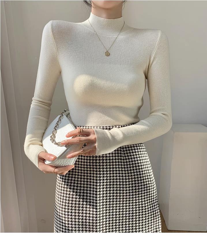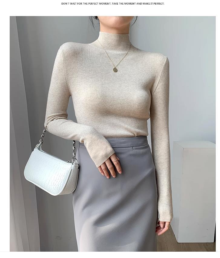 Suéter de cuello semialto color albaricoque para mujer, otoño e invierno 2024, nuevo, corte entallado, adelgazante, temperamento interior, camisa de manga larga para mujer