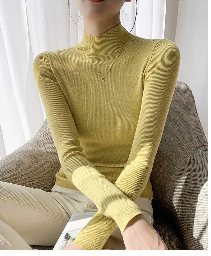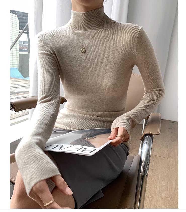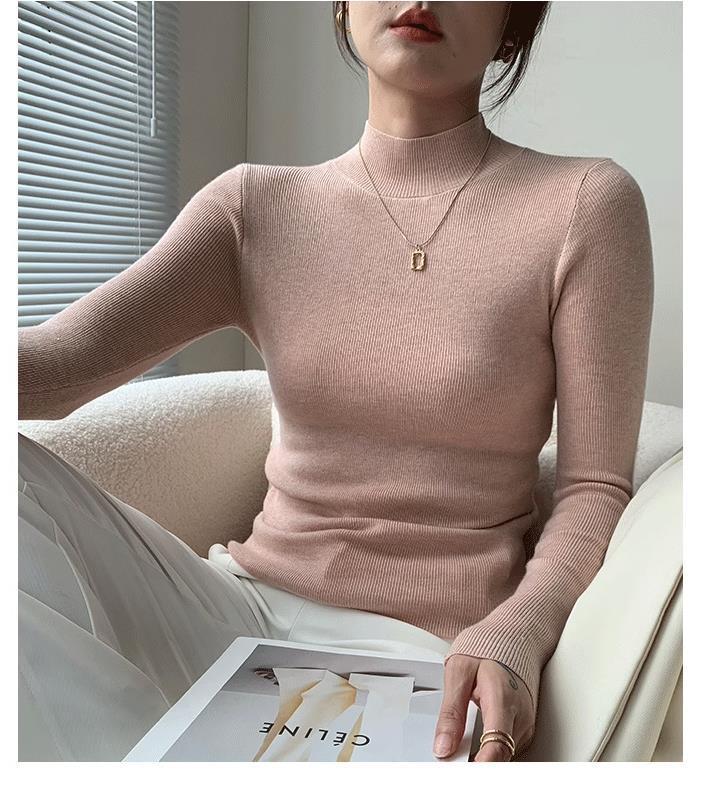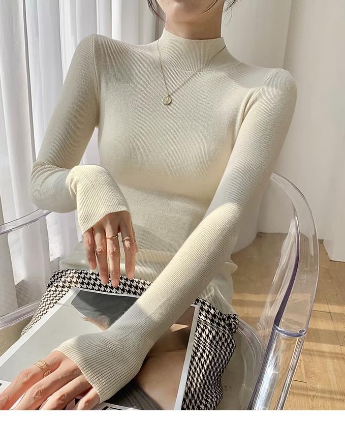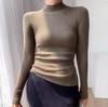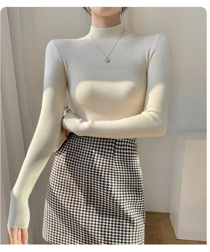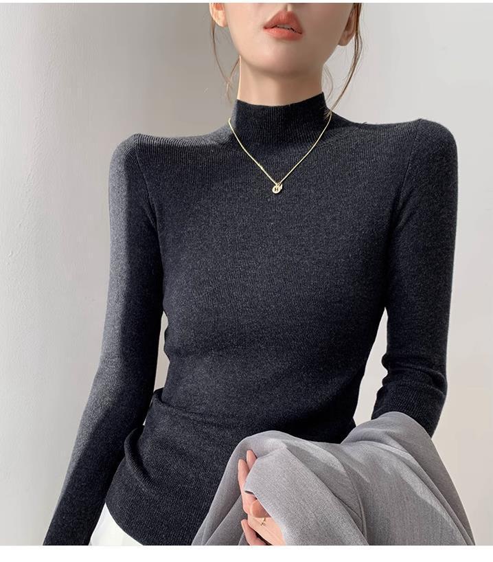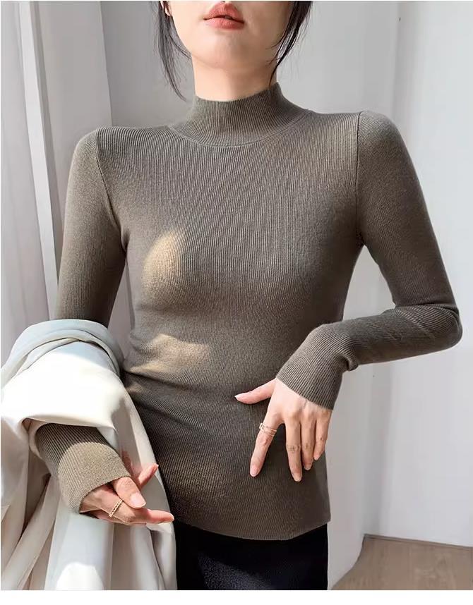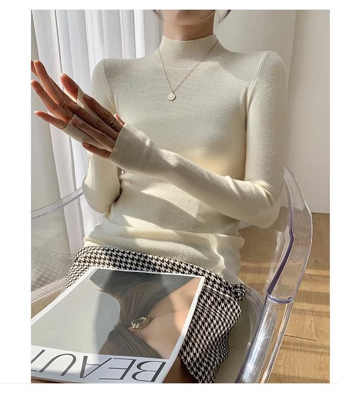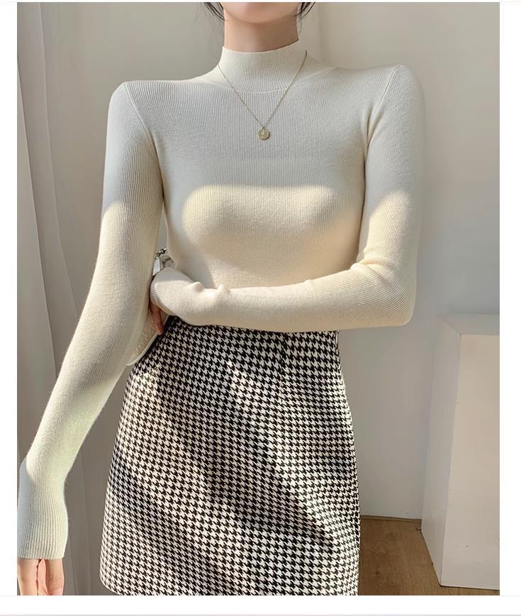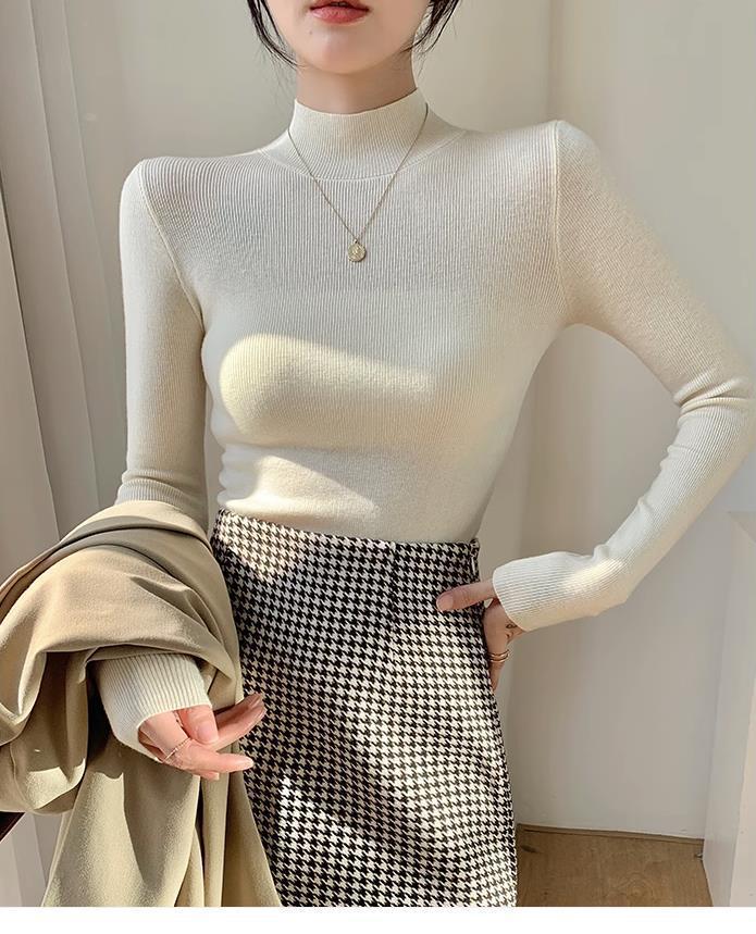 Suéter de cuello semialto color albaricoque para mujer, otoño e invierno 2024, nuevo, corte entallado, adelgazante, temperamento interior, camisa de manga larga para mujer