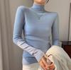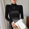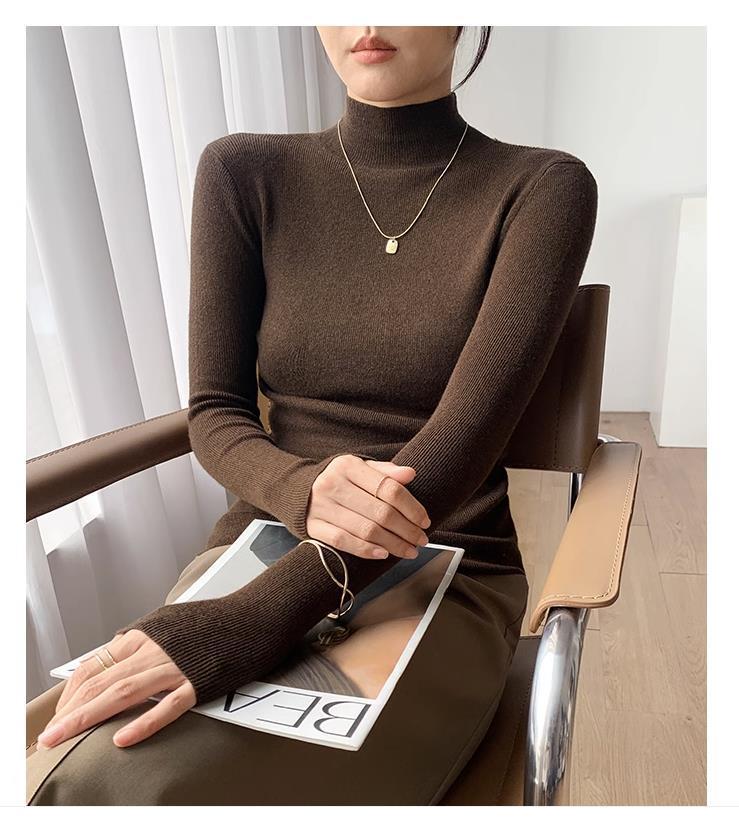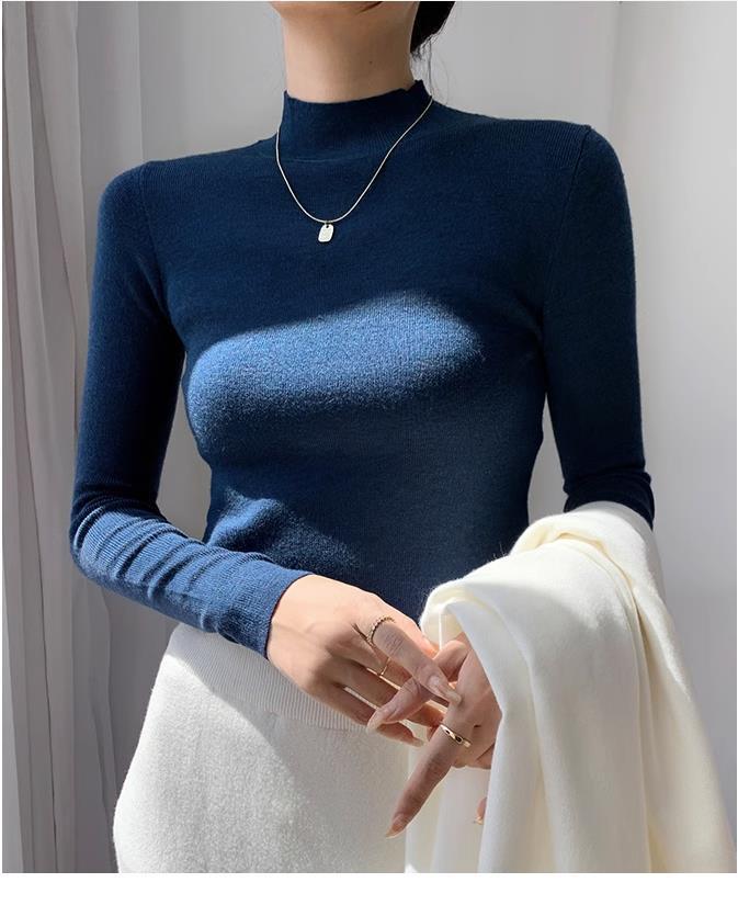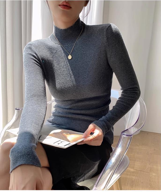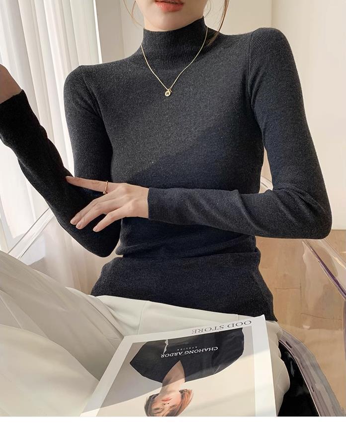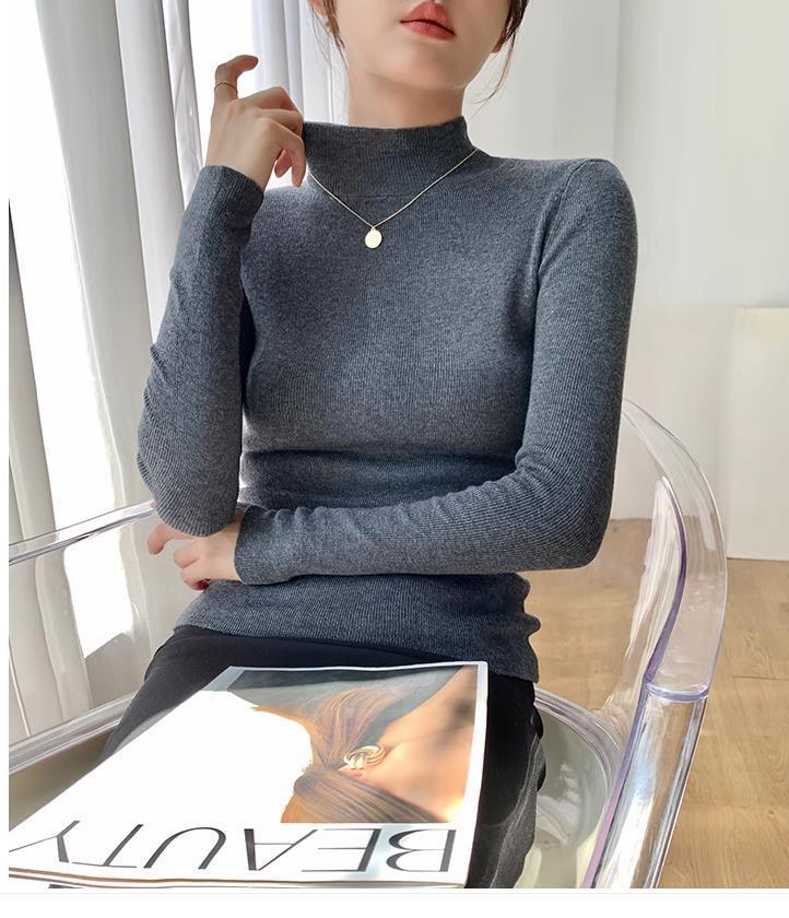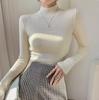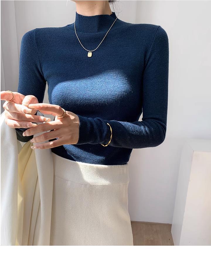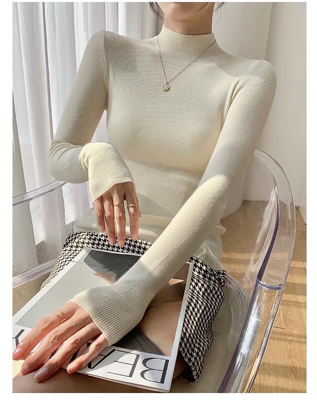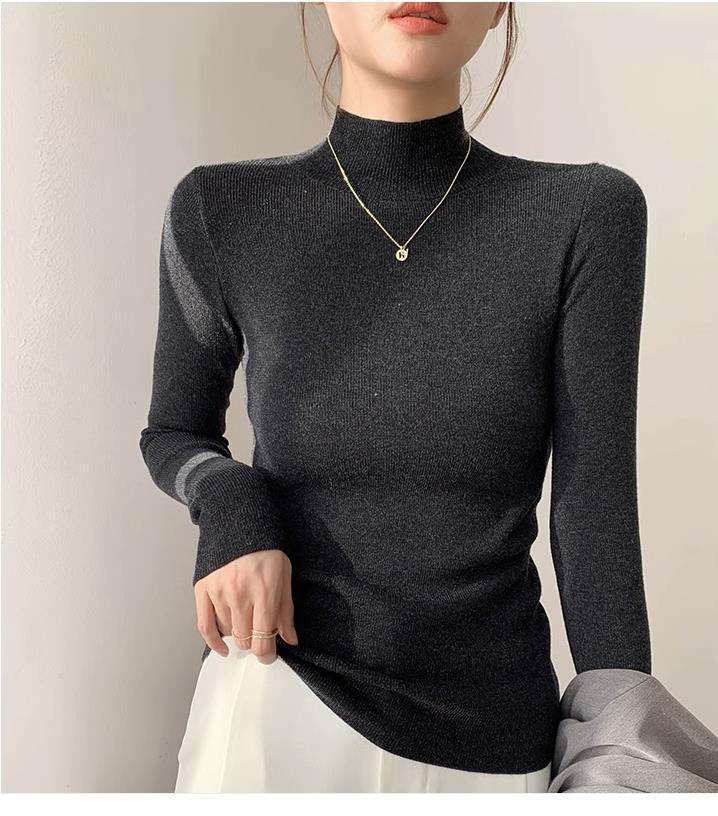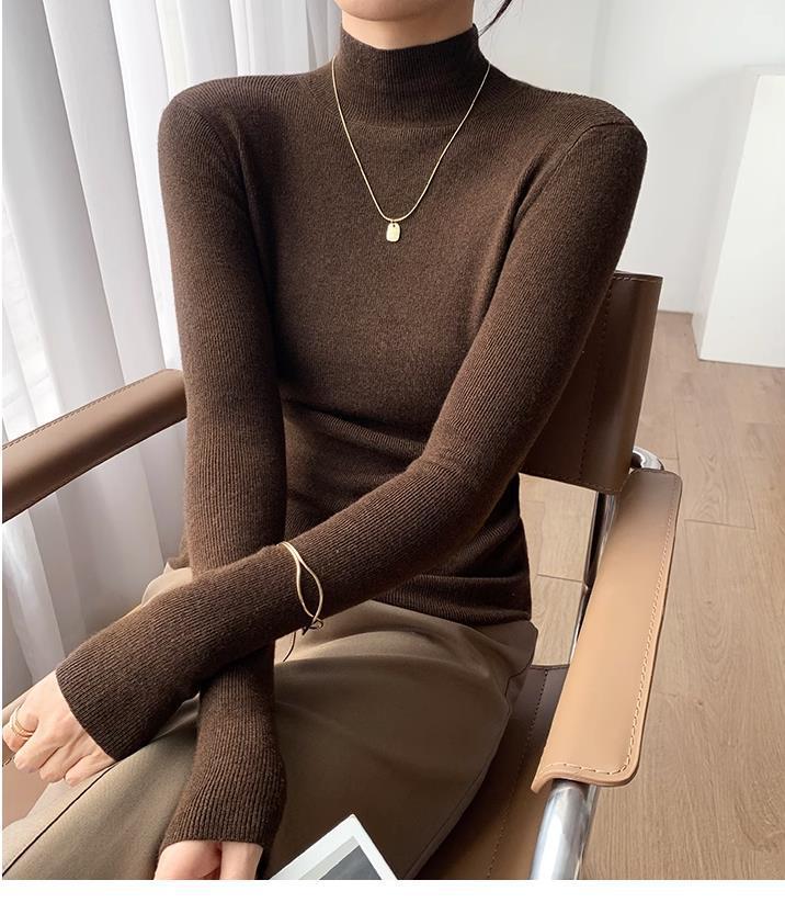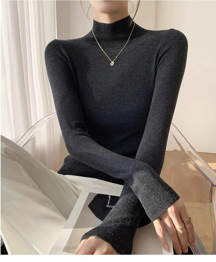 Suéter de cuello semialto color albaricoque para mujer, otoño e invierno 2024, nuevo, corte entallado, adelgazante, temperamento interior, camisa de manga larga para mujer