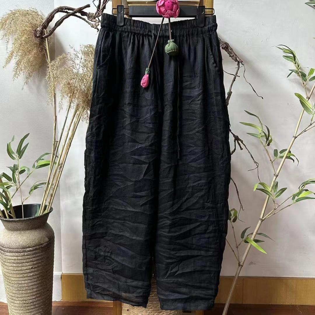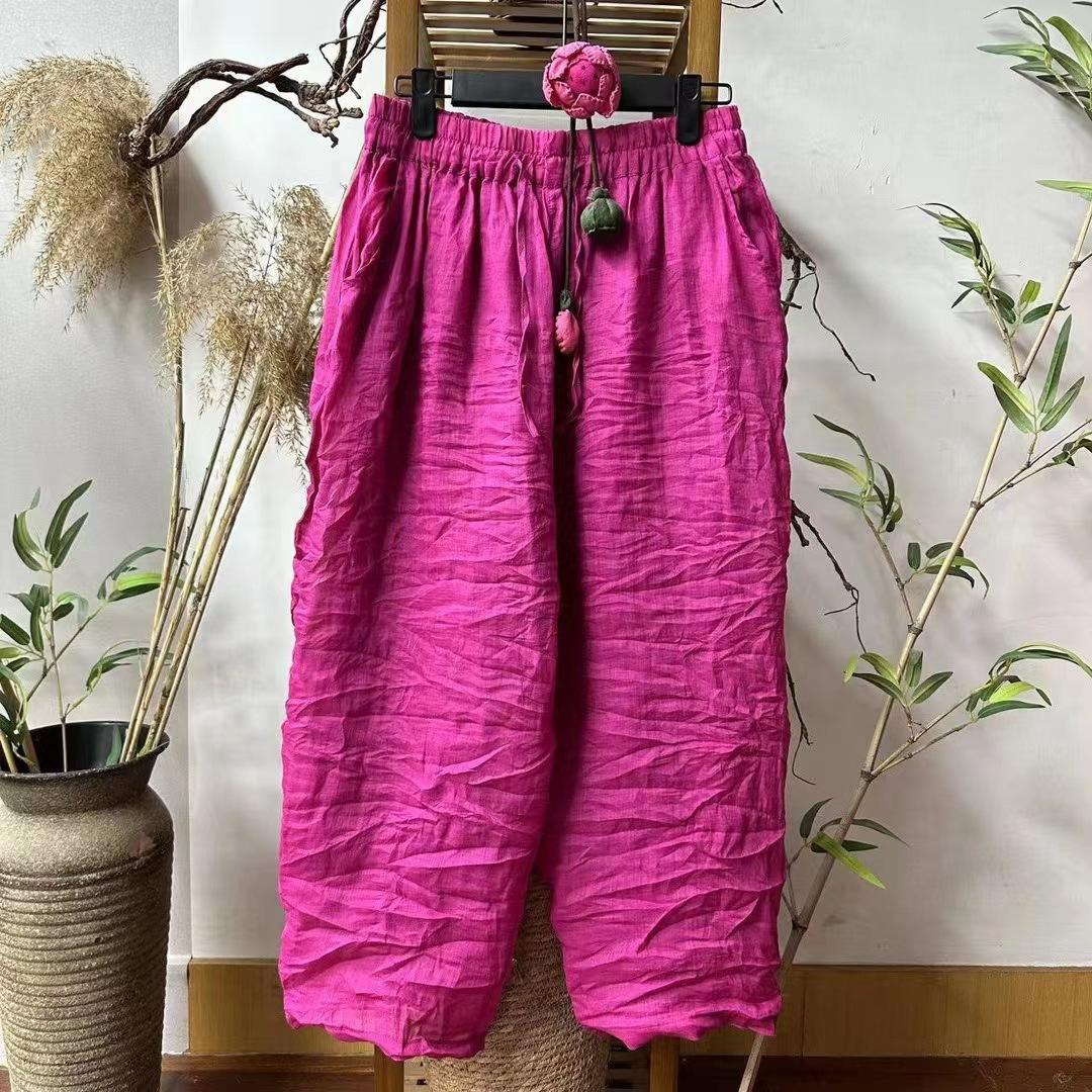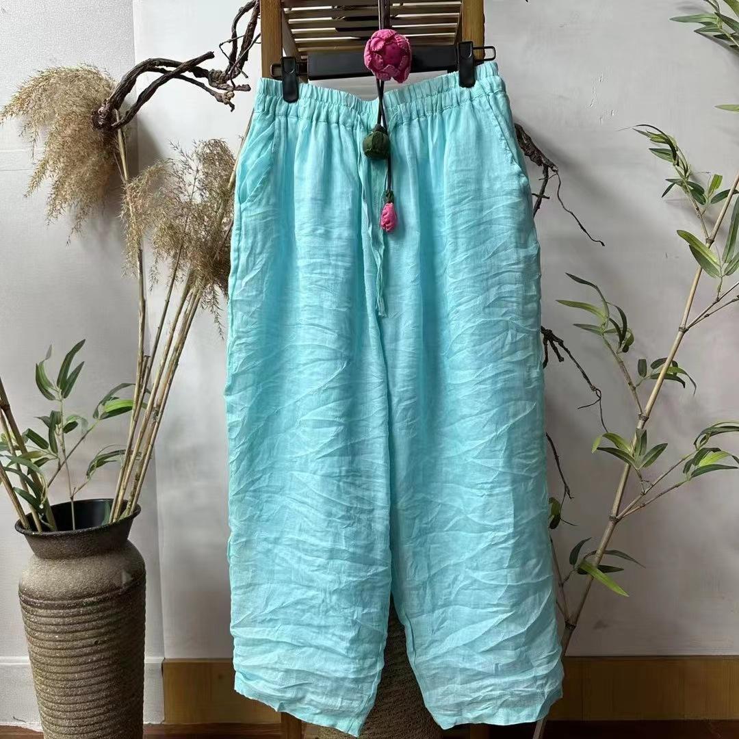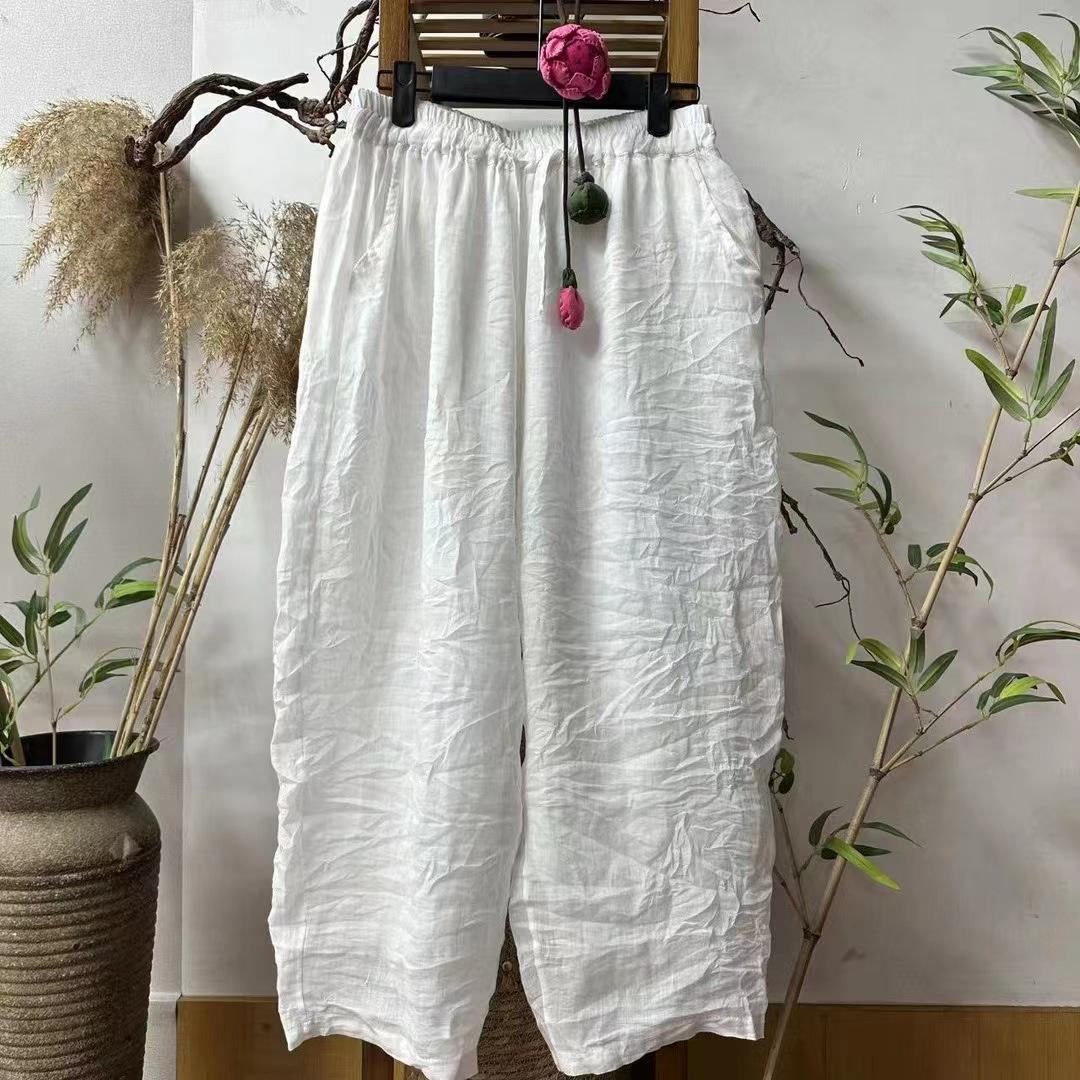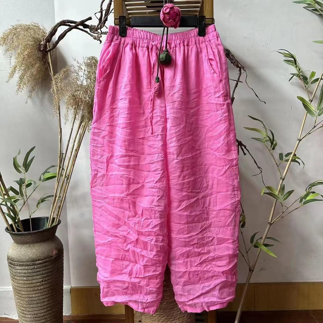 Pantalones casuales de cintura elástica con doble ramio, estilo literario, ajustados, novedad de verano de 2024