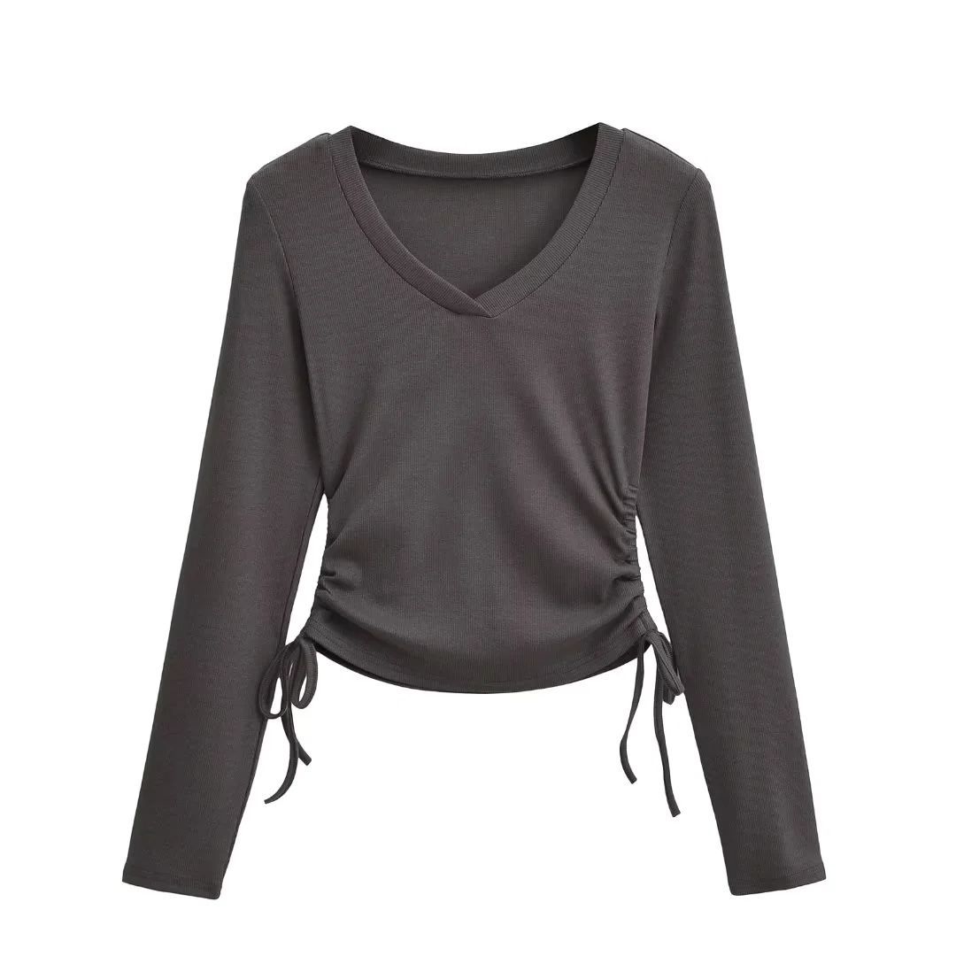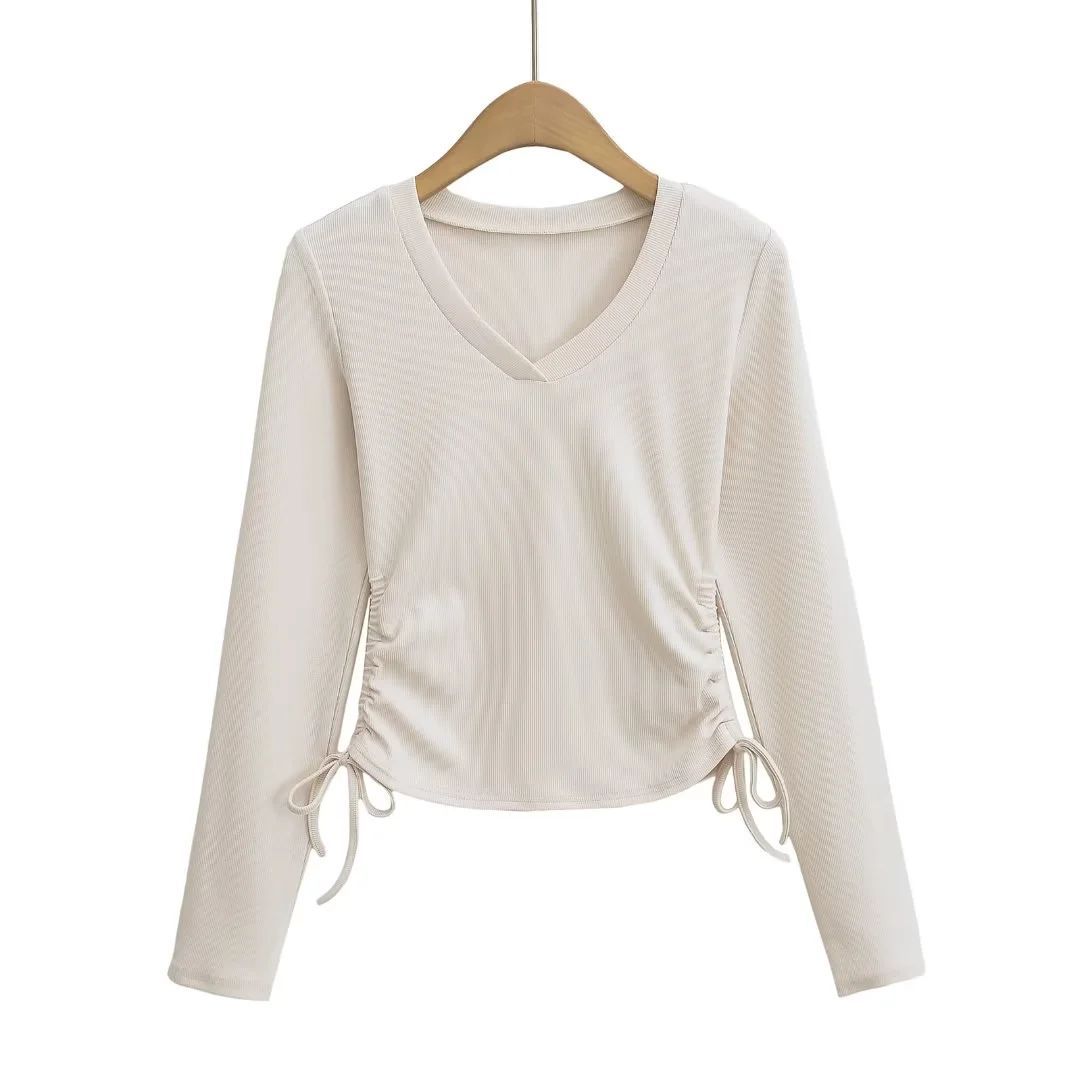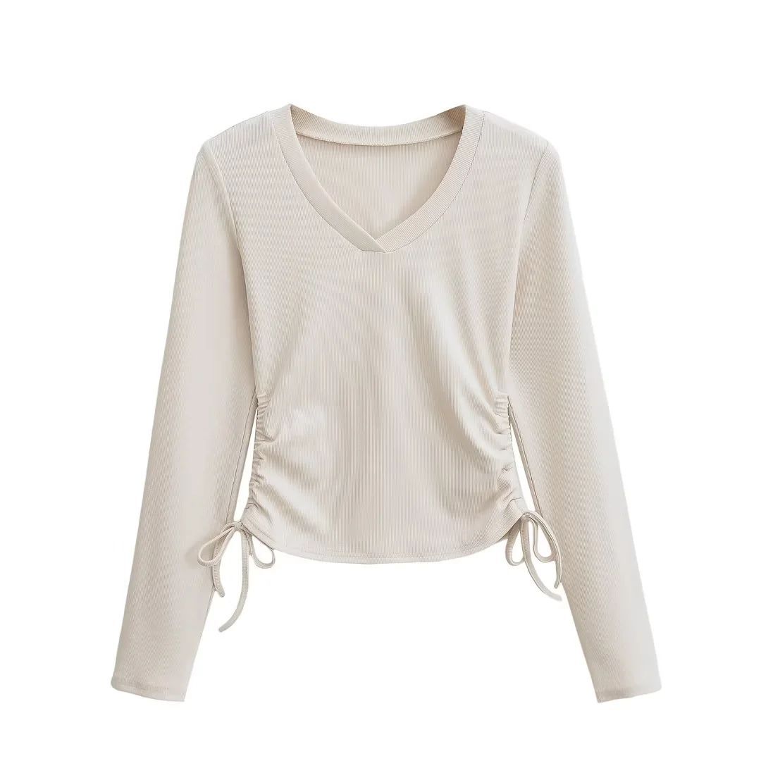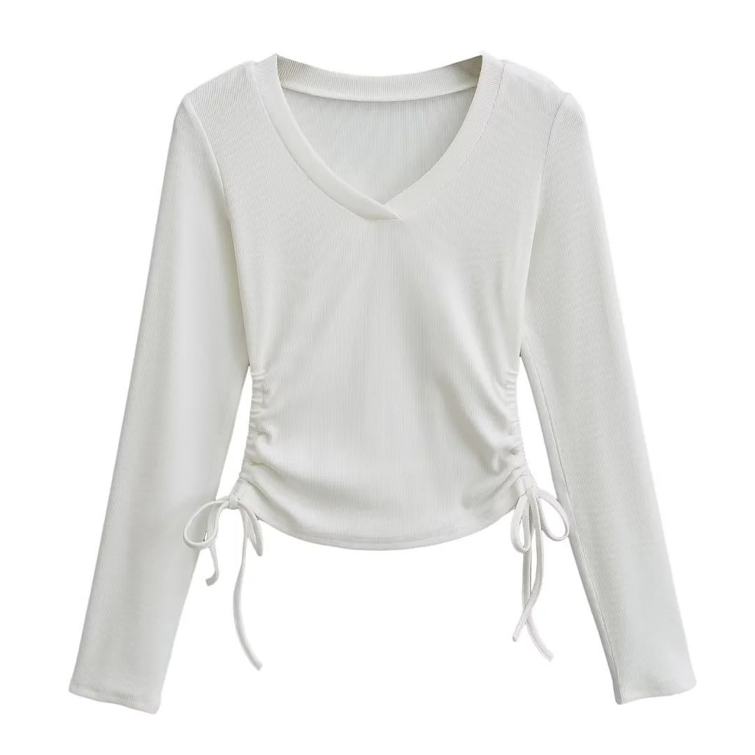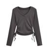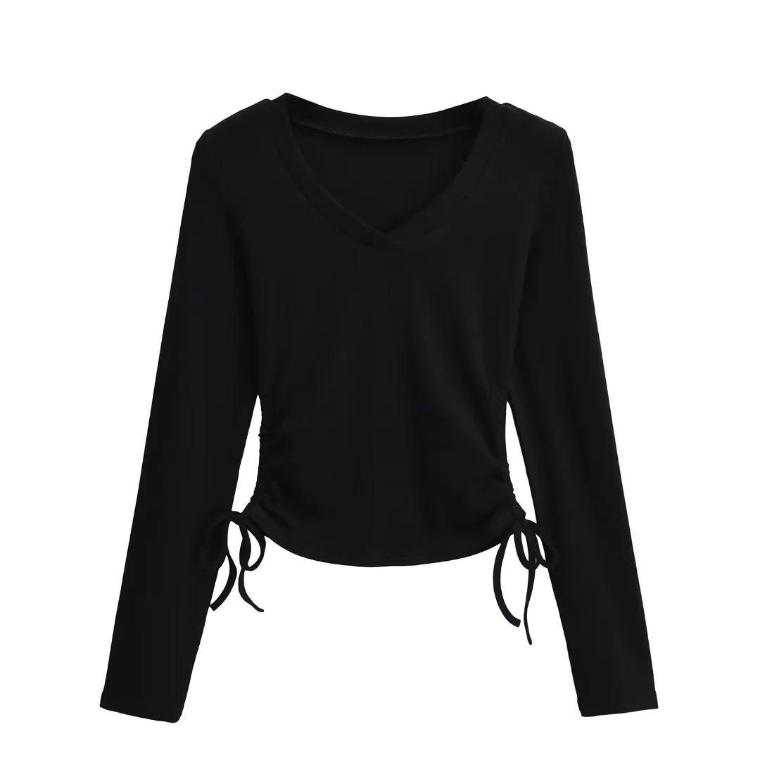 Top sexy de manga larga con cuello en V y color liso para mujer, diseño de Spice Girl, con pliegues laterales, ajustado y con cordones, para otoño
