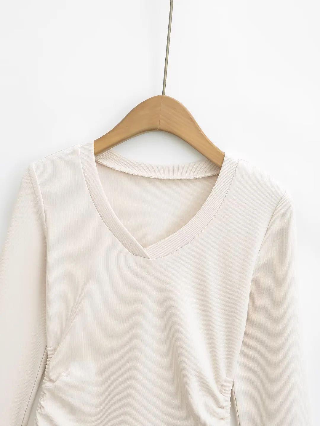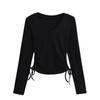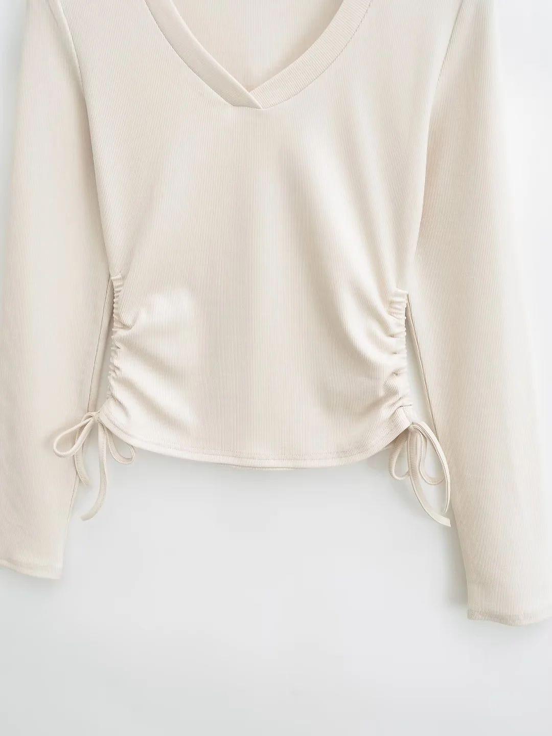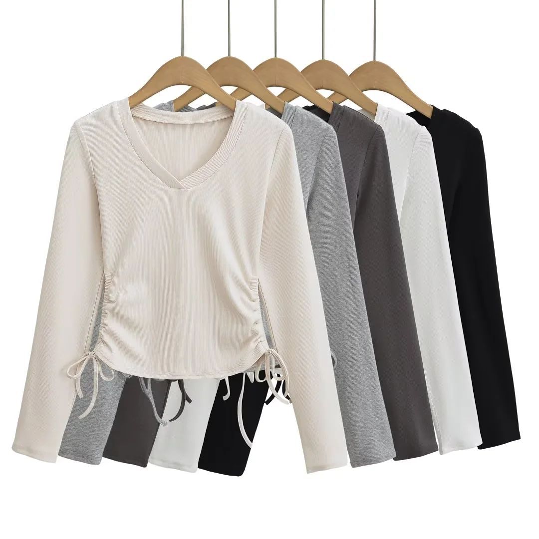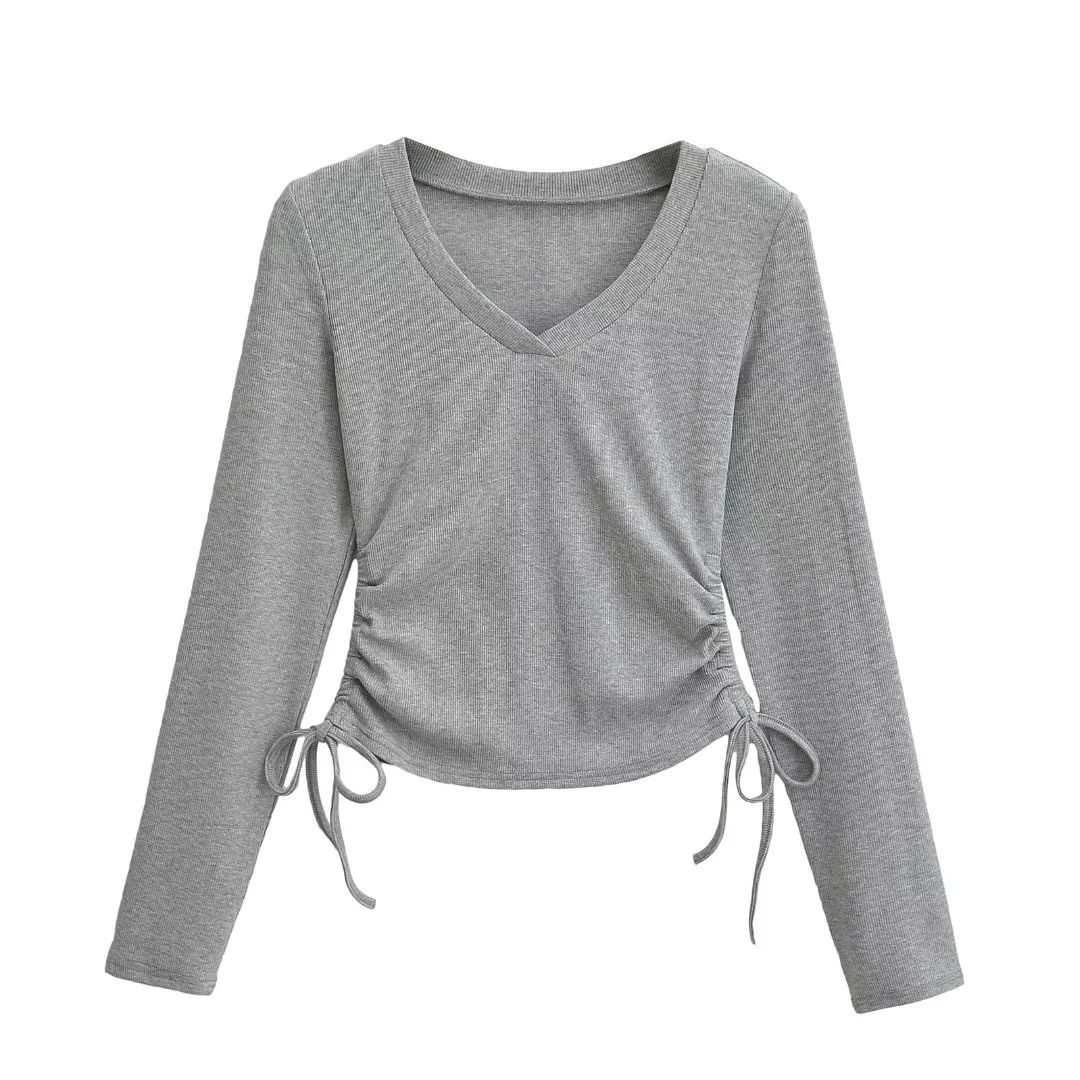 Top sexy de manga larga con cuello en V y color liso para mujer, diseño de Spice Girl, con pliegues laterales, ajustado y con cordones, para otoño