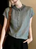 Camisa Chic de Manga Corta con Cuello Peter Pan Retro para Mujer, Estilo Artístico de Verano, Corte Holgado Casual con Mangas Ligeramente Volantes