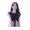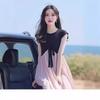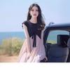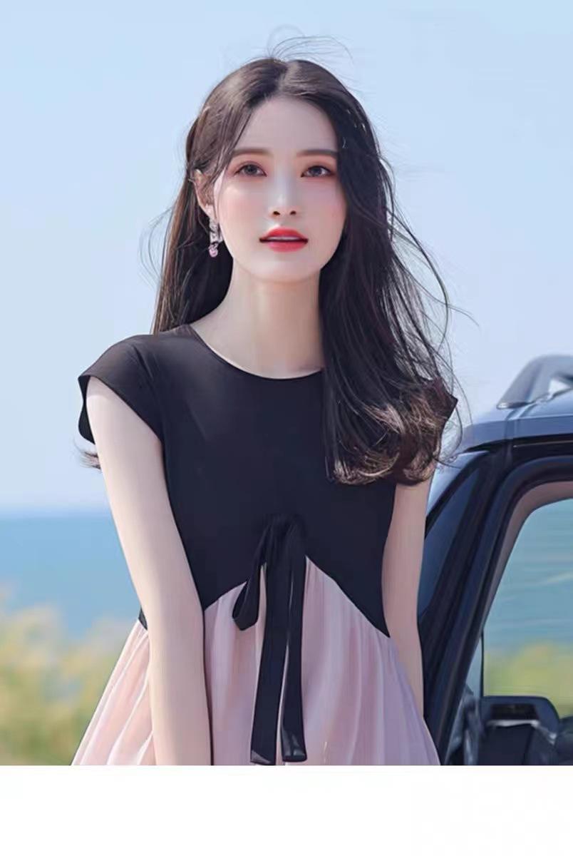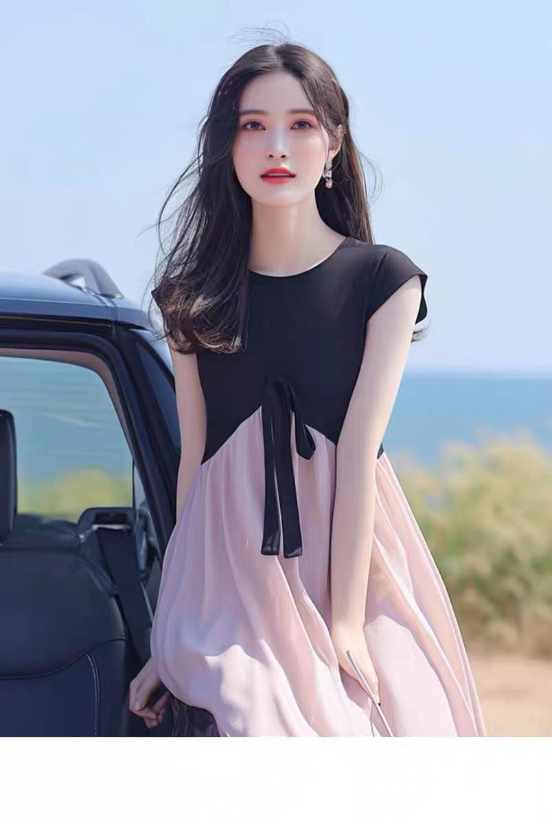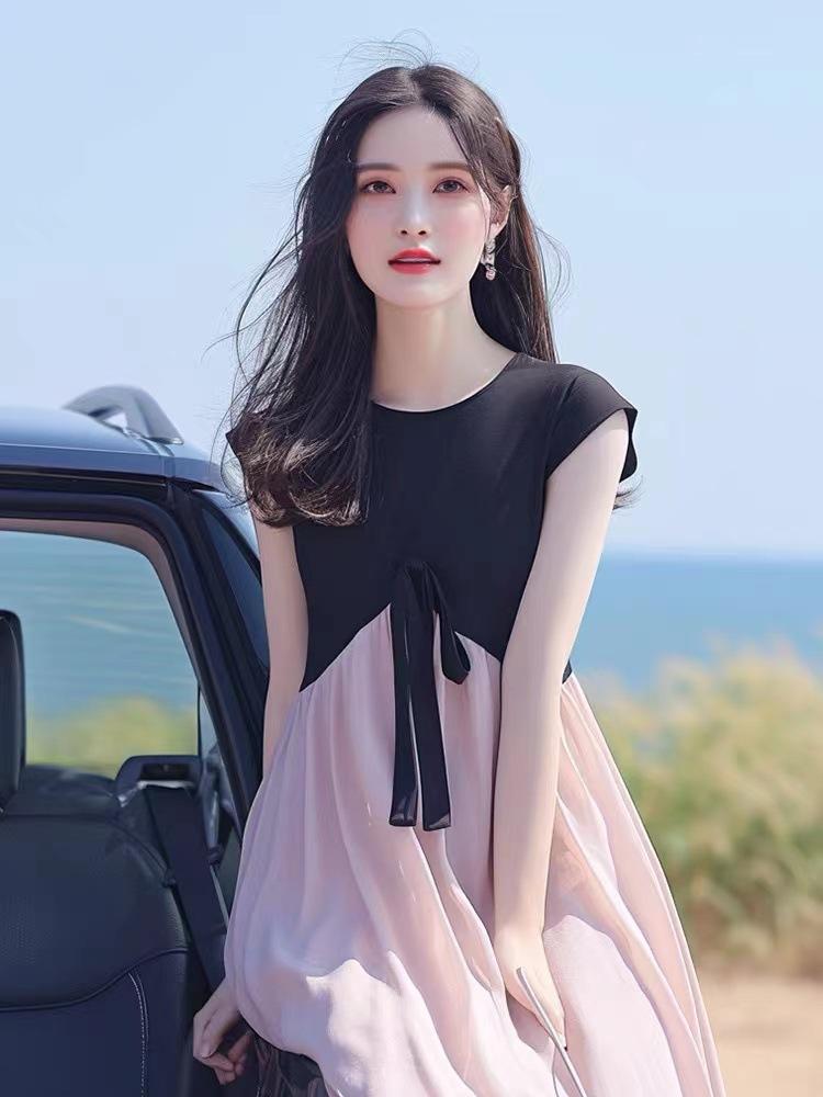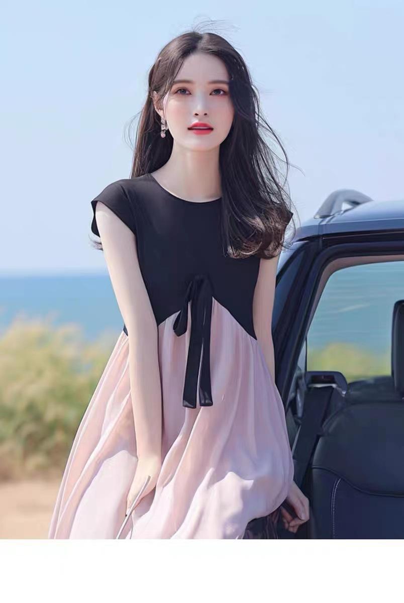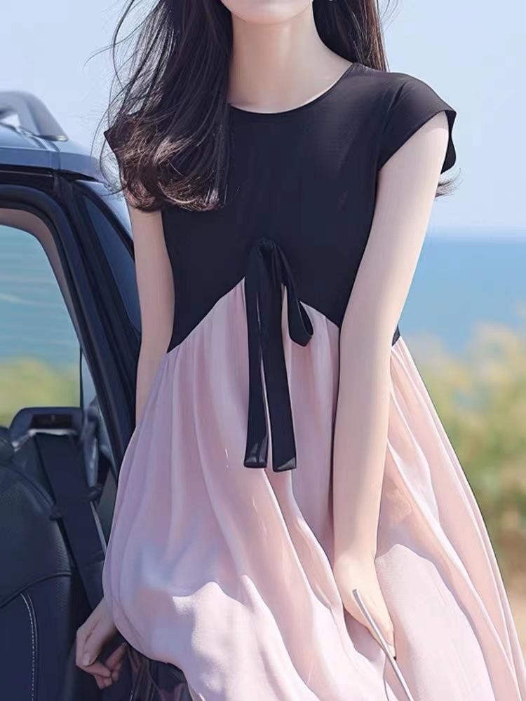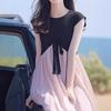 Vestido de gasa con viento suave para mujer, vestido rosa sin mangas con costuras a la moda de verano 2024 para vacaciones en la playa