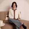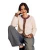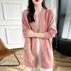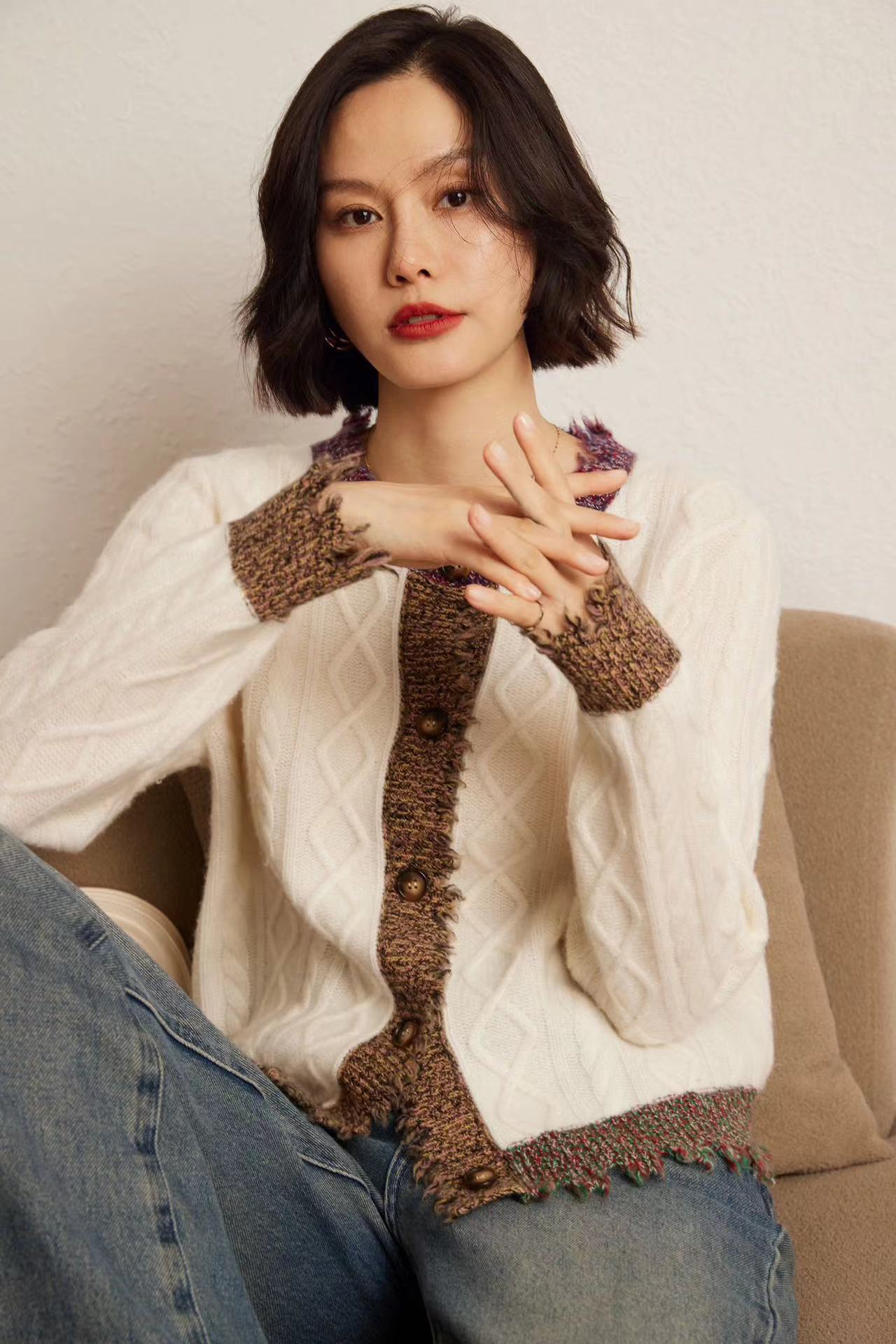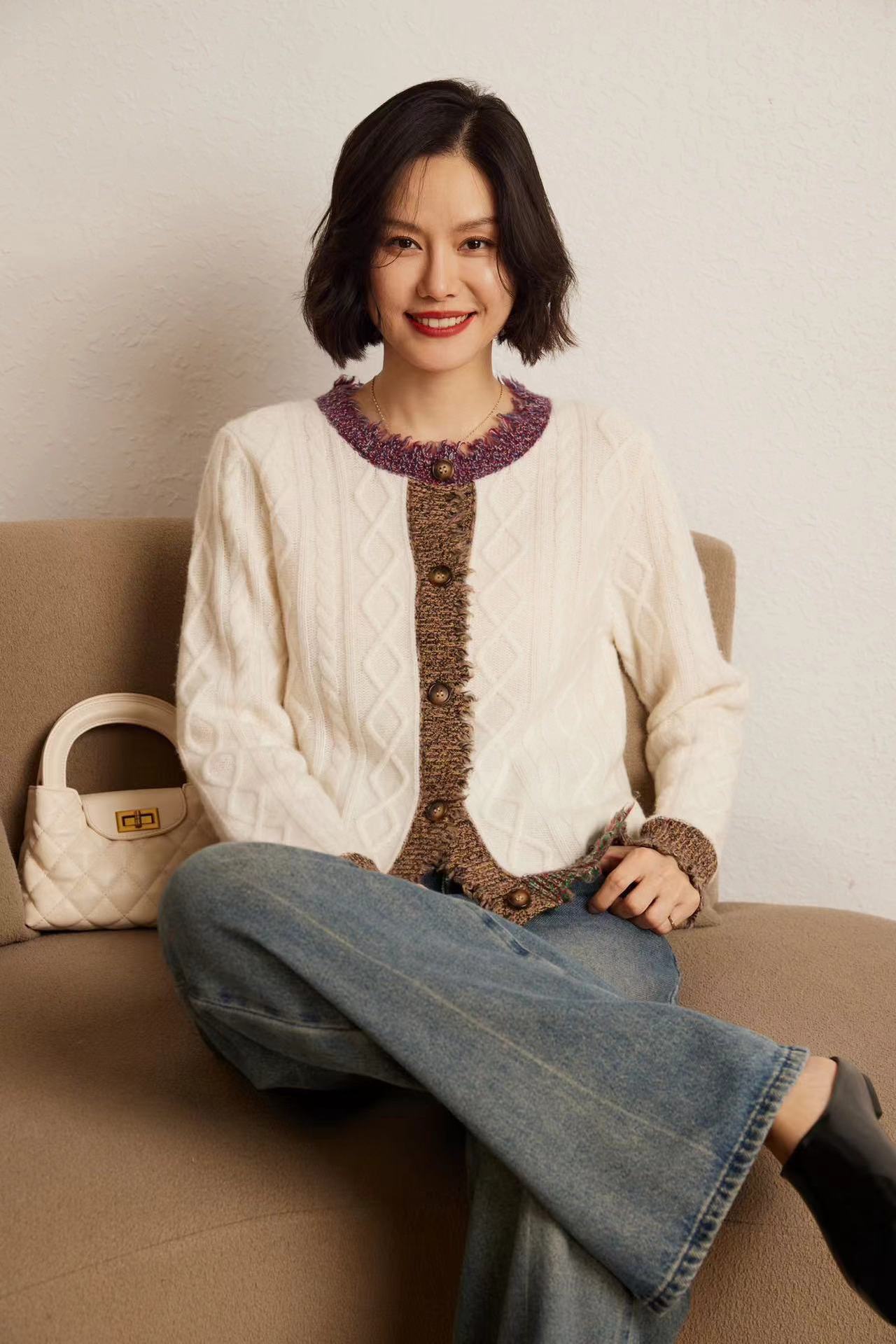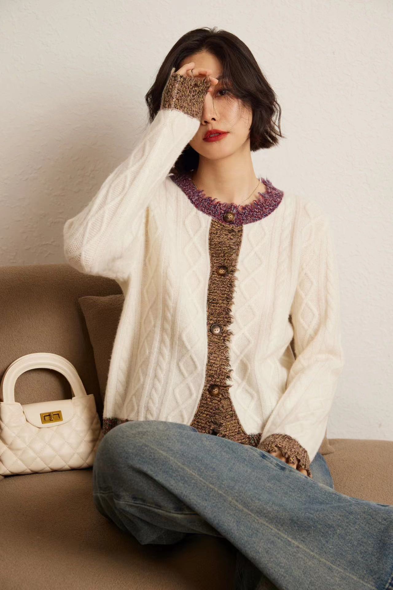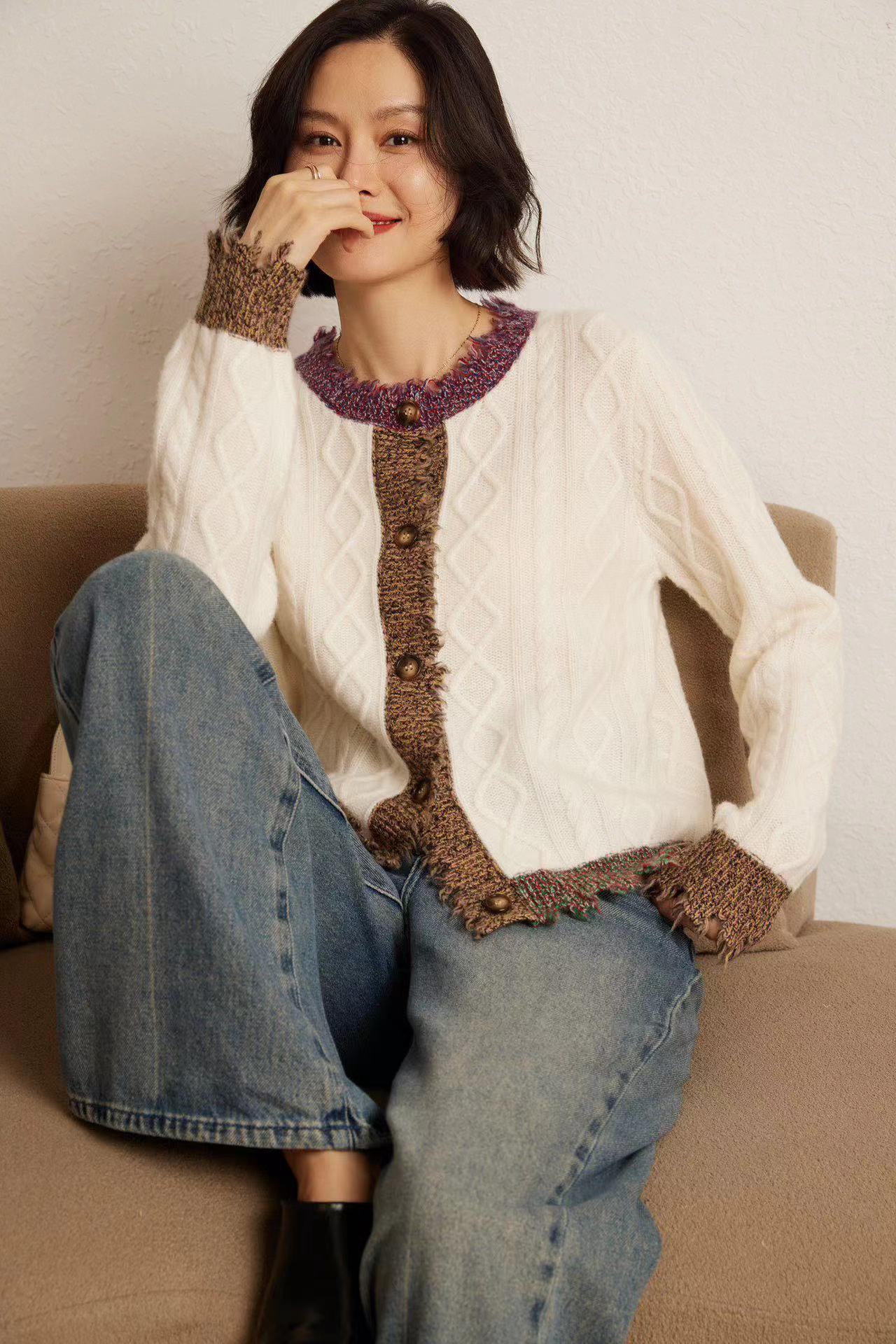 Chaqueta Casual de Punto de Lana Gruesa de Cachemira para Mujer con Borlas Vintage, Cuello Redondo, Bordes Crudos e Hilo Floral Colorido