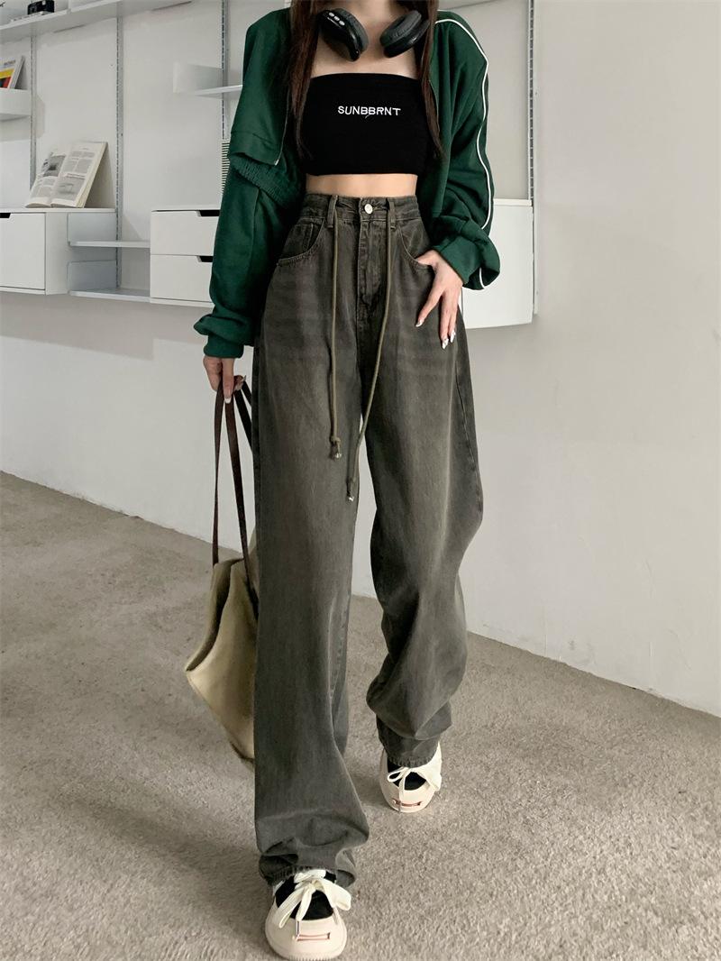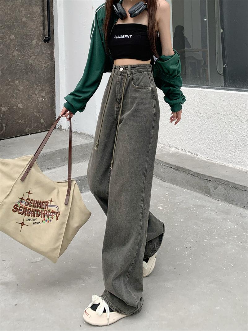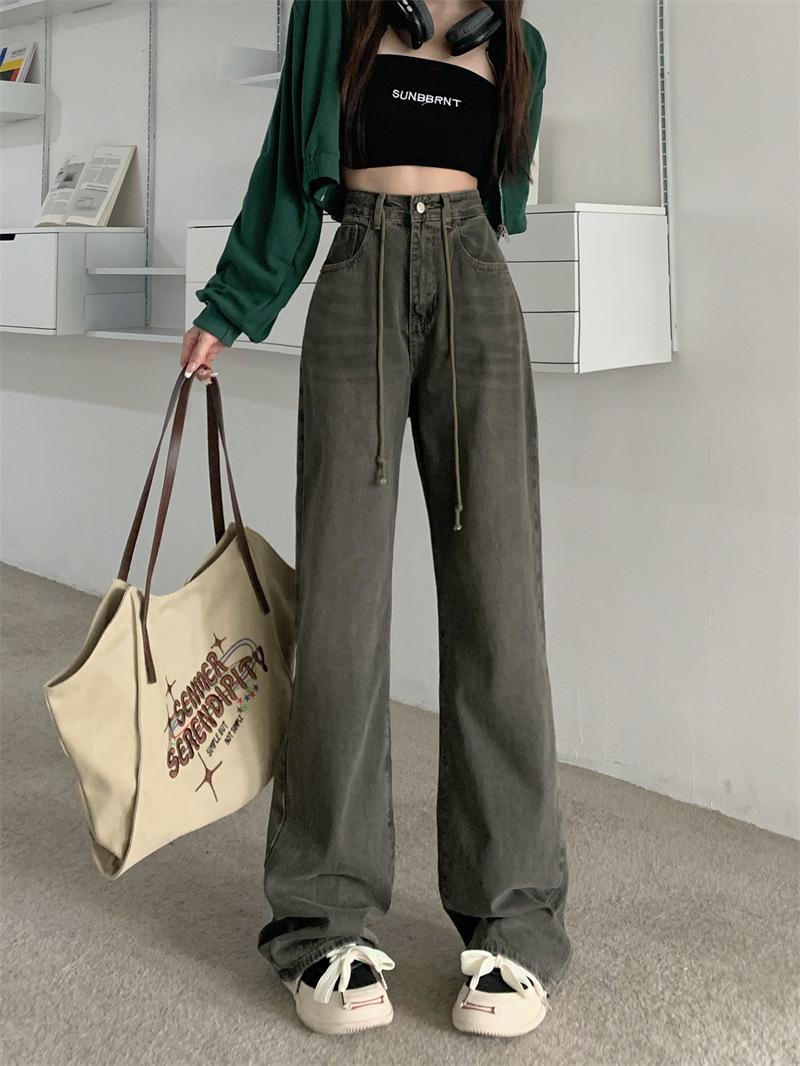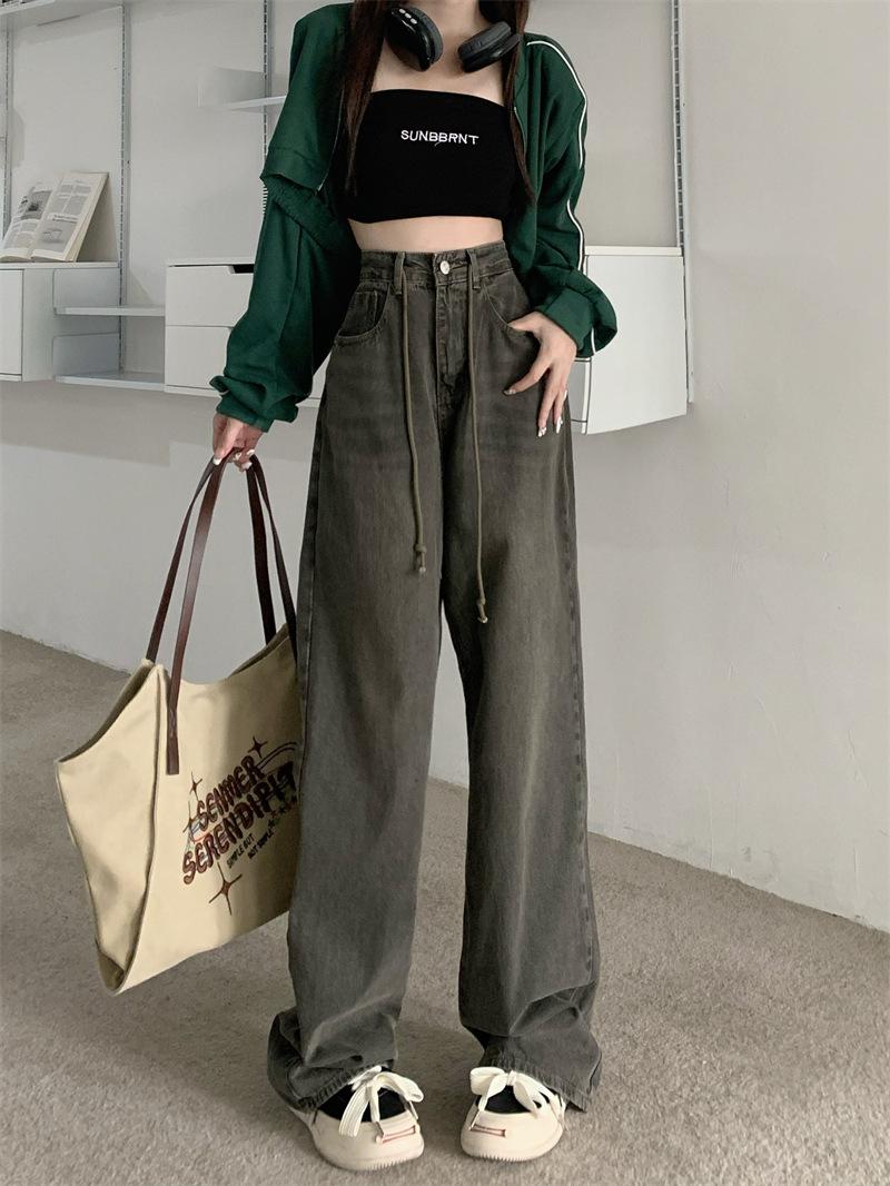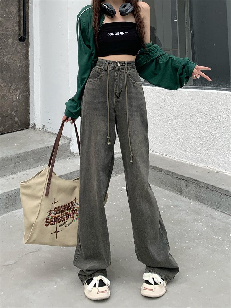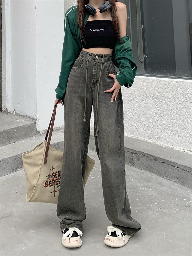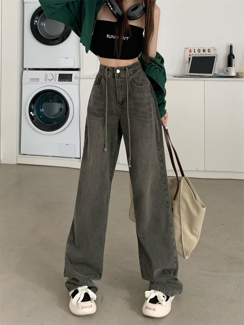 Jeans Retro Americanos Mujer Primavera Temprana 2024 Nuevos Pantalones Anchos Holgados con Cordón de Cintura Alta