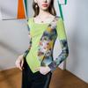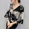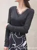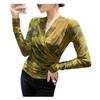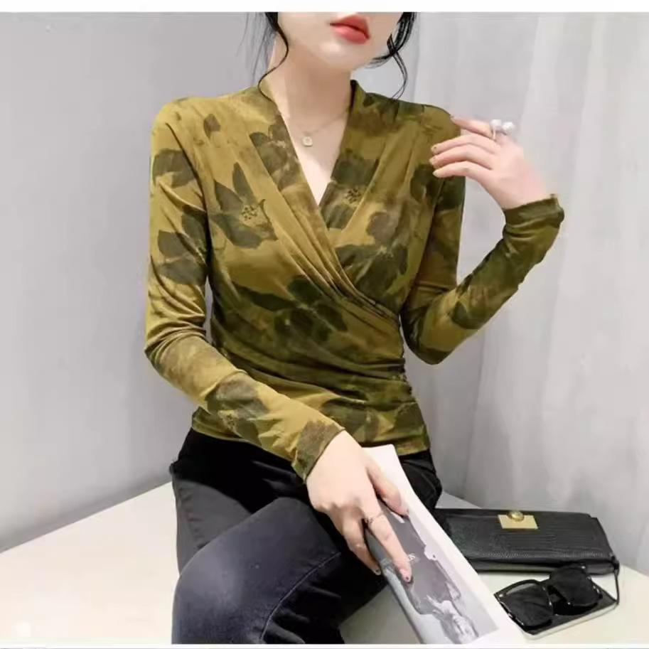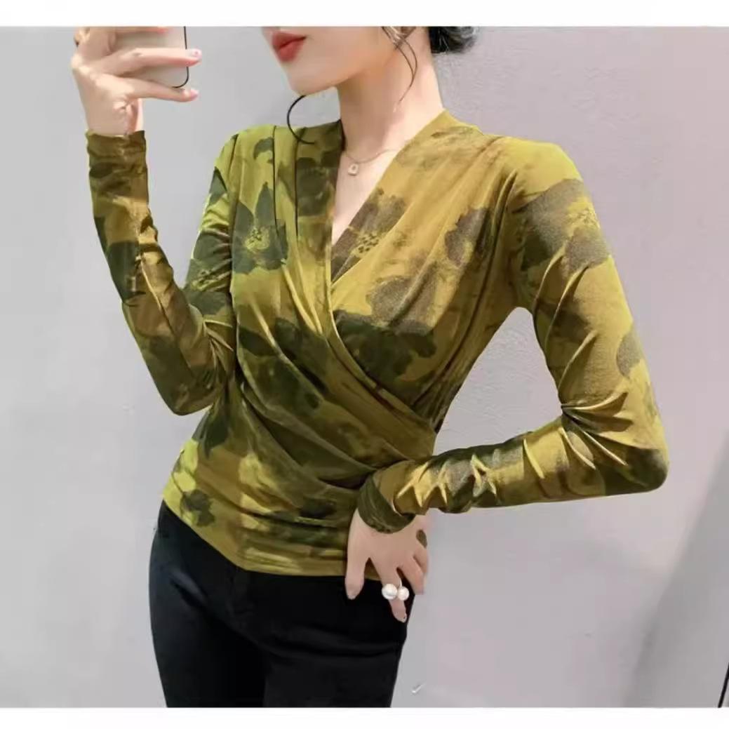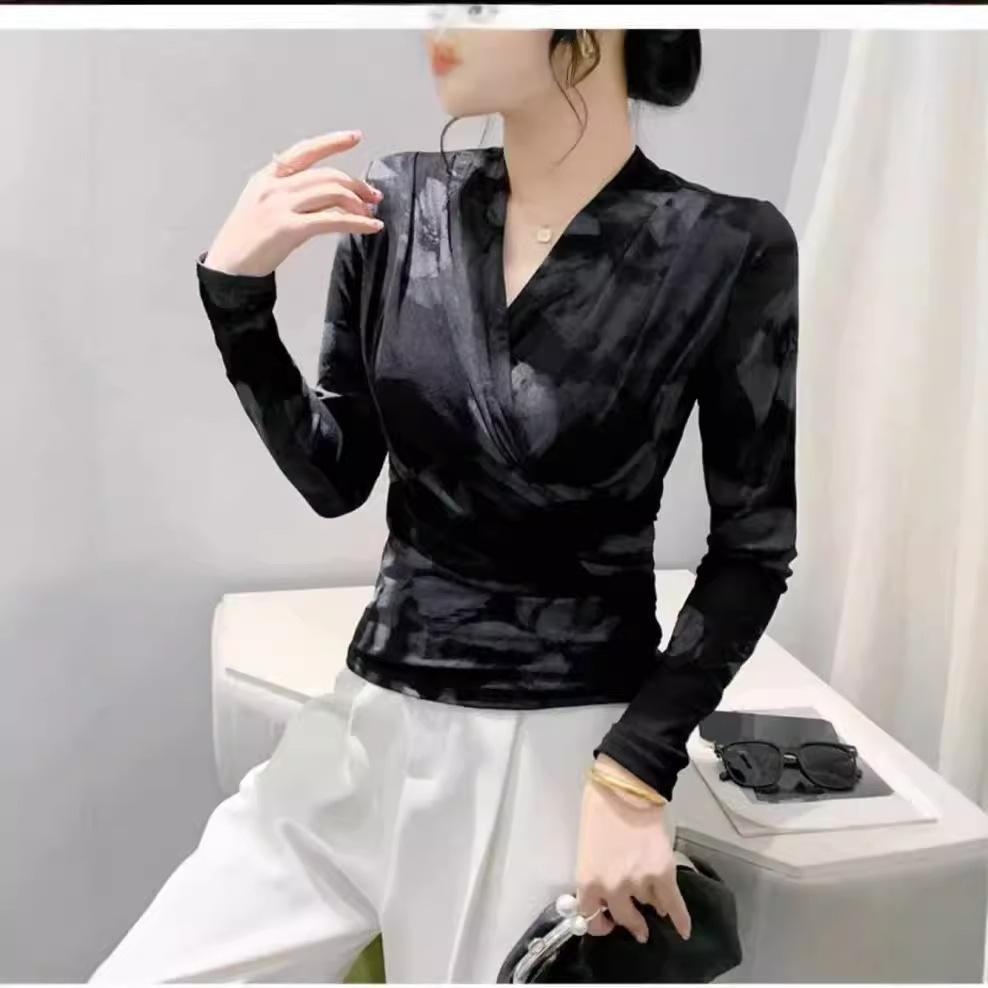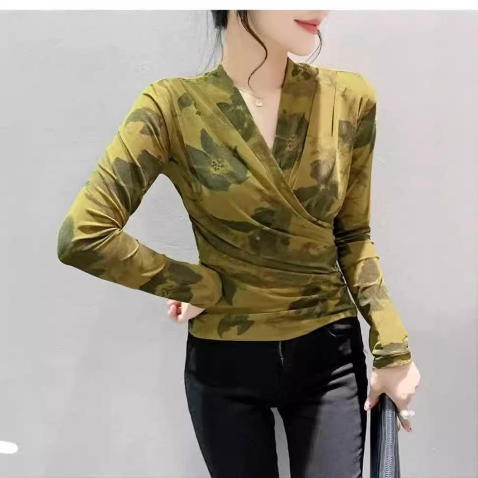 Otoño 2024 Nuevo estilo Camisa para mujer Cuello en V Estampado Elástico Ajuste Delgado Plisado Camiseta de Manga Larga Top Casual de Malla para Mujer