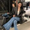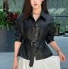 Abrigo de cuero Haining 2023, nuevo, para mujer, corto, de piel de oveja encerada con aceite, chaqueta de cuero con solapa informal pequeña