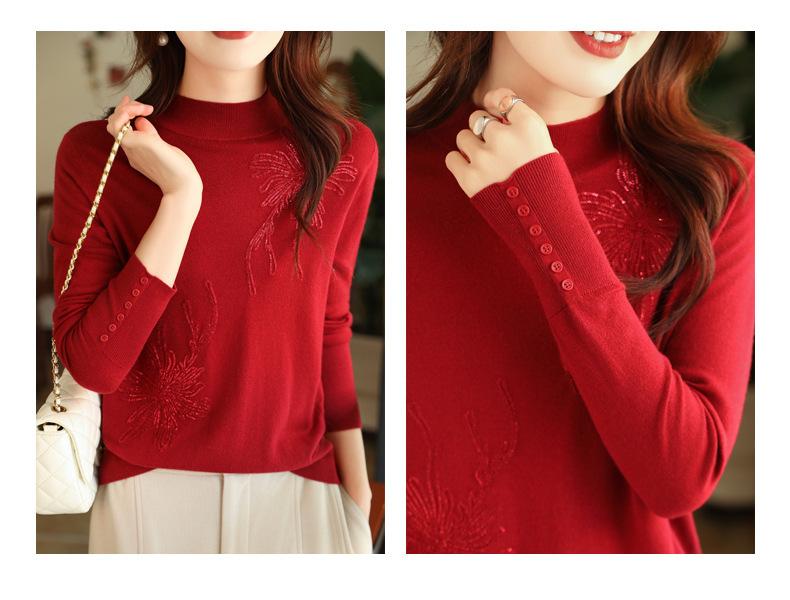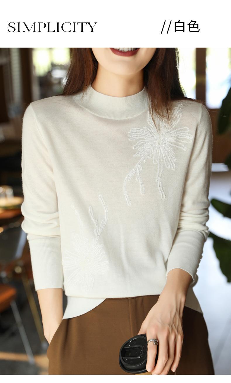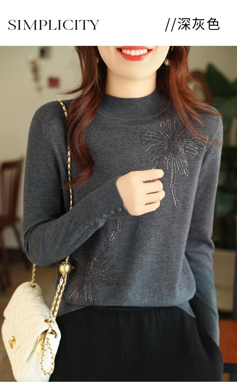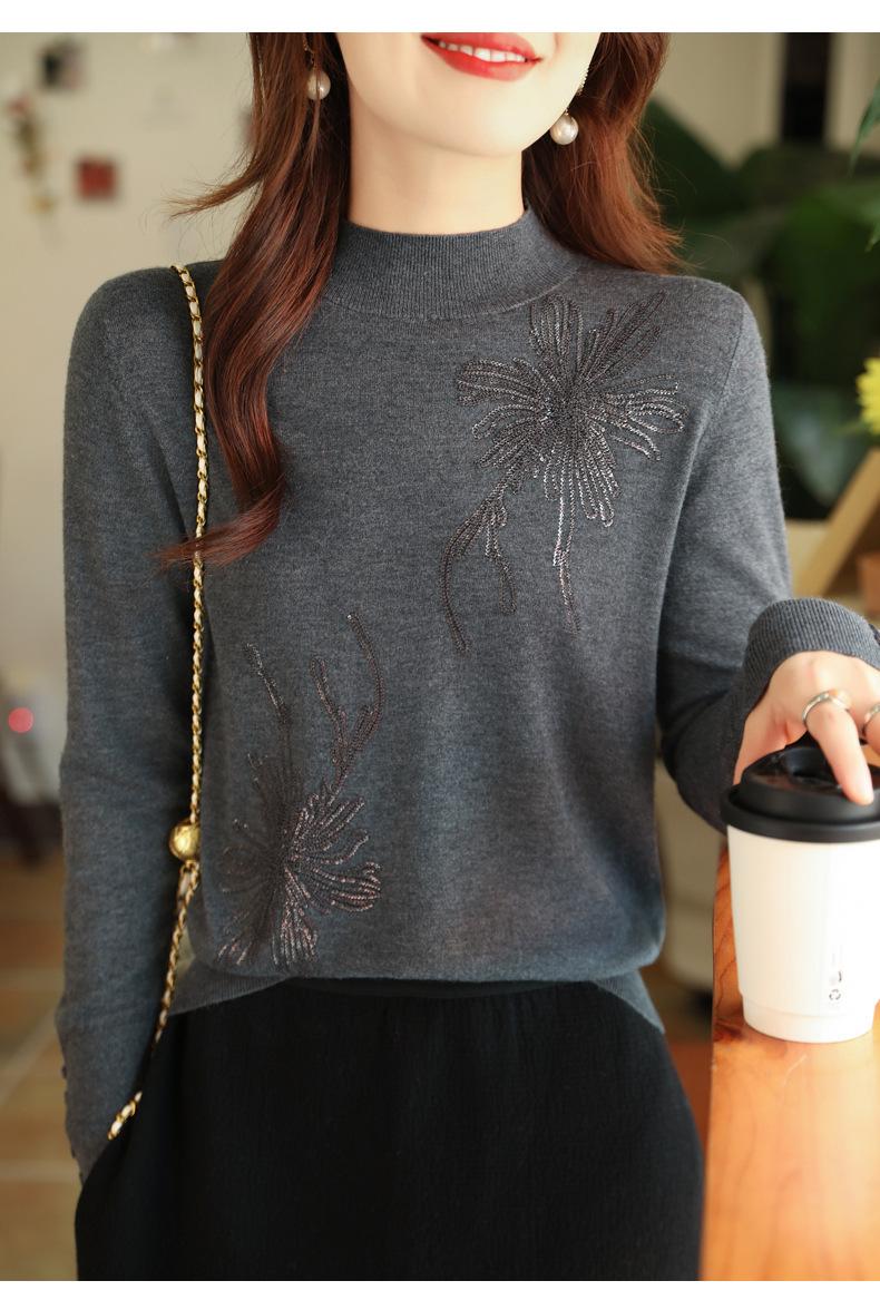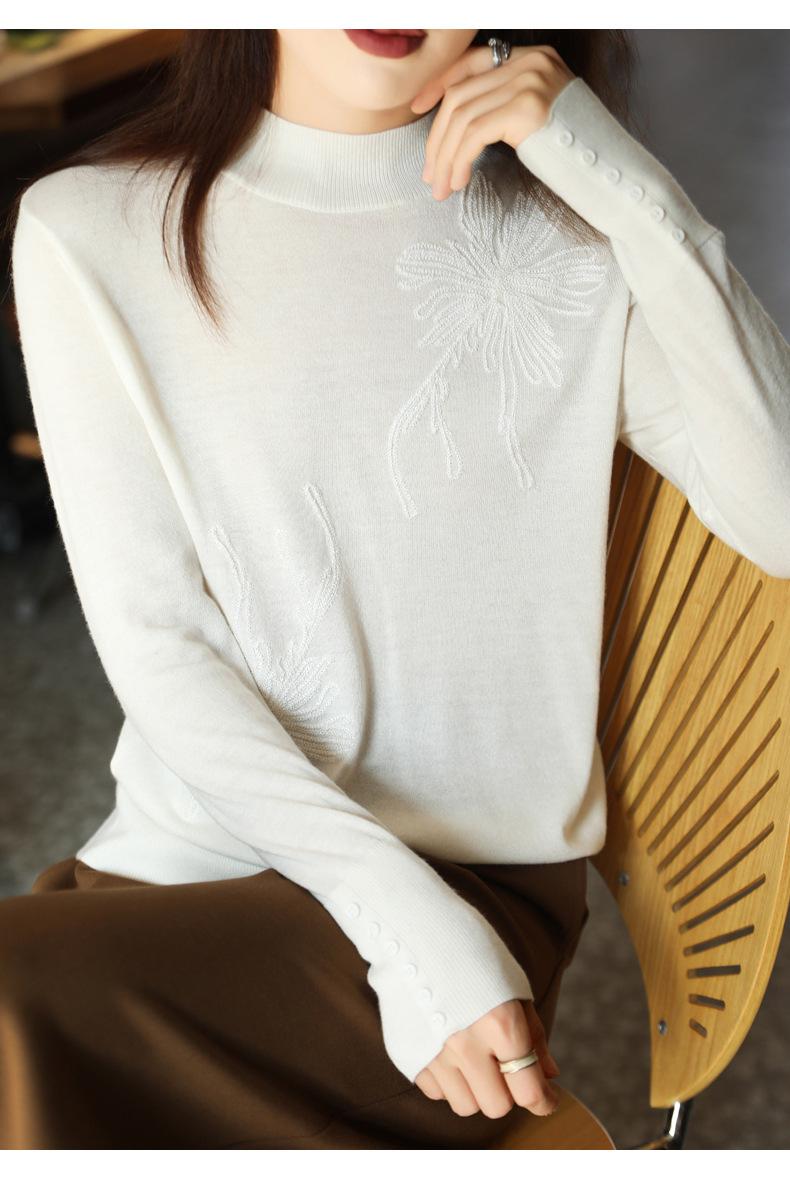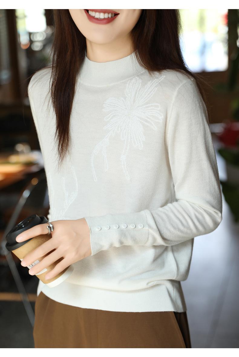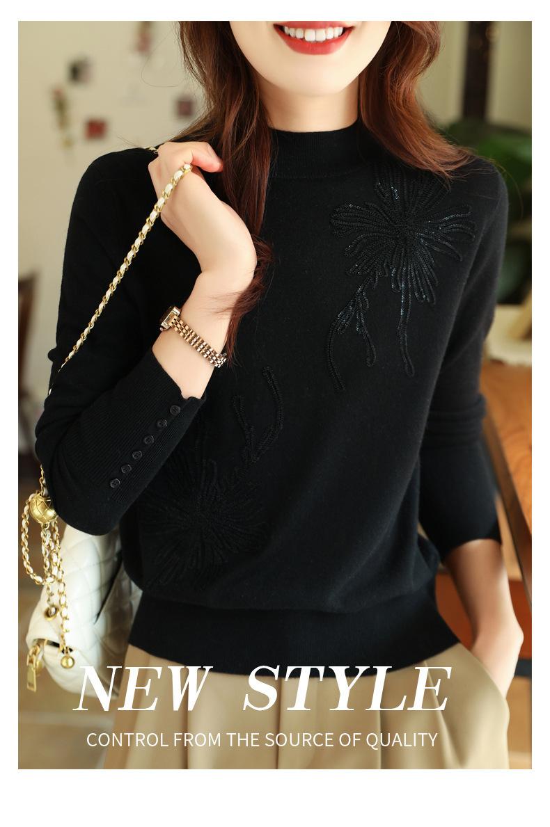 Suéter de Punto de Manga Larga de Alta Calidad Bordado Pesado para Mujer, Jersey de Cuello Semialto Suave y Cómodo, Base Versátil, Suéter Ajustado