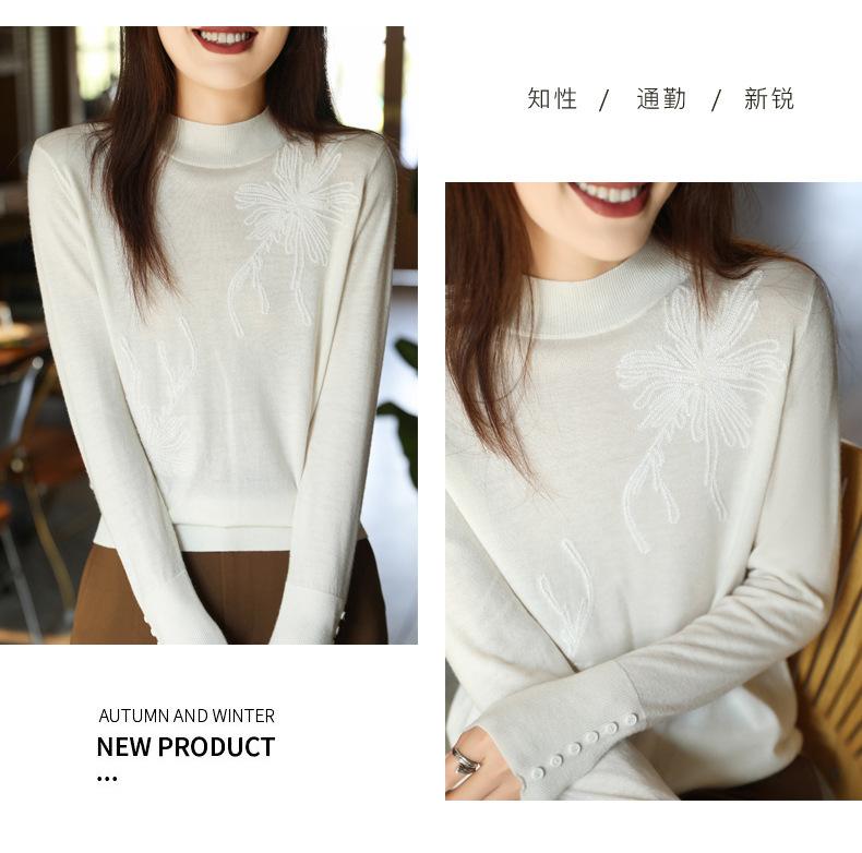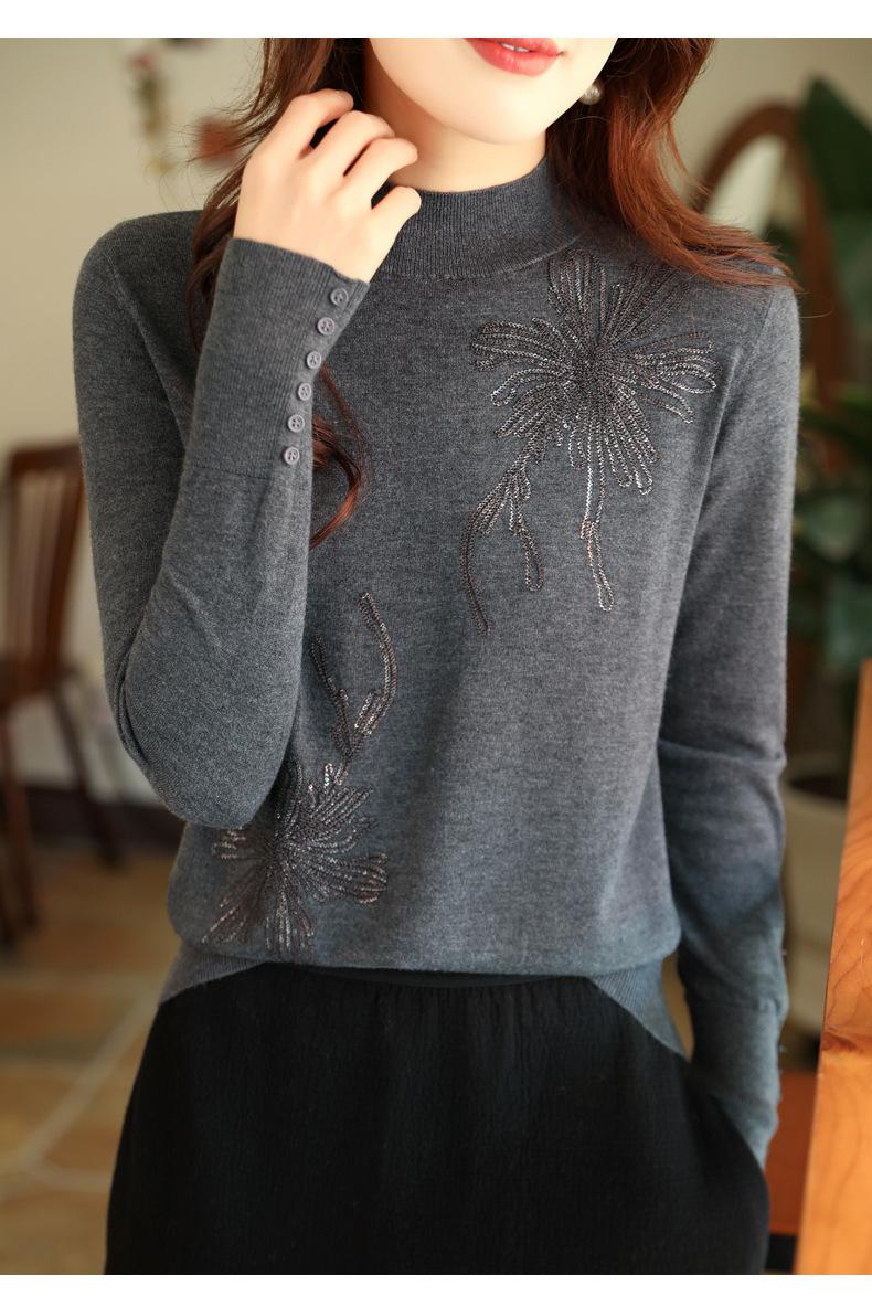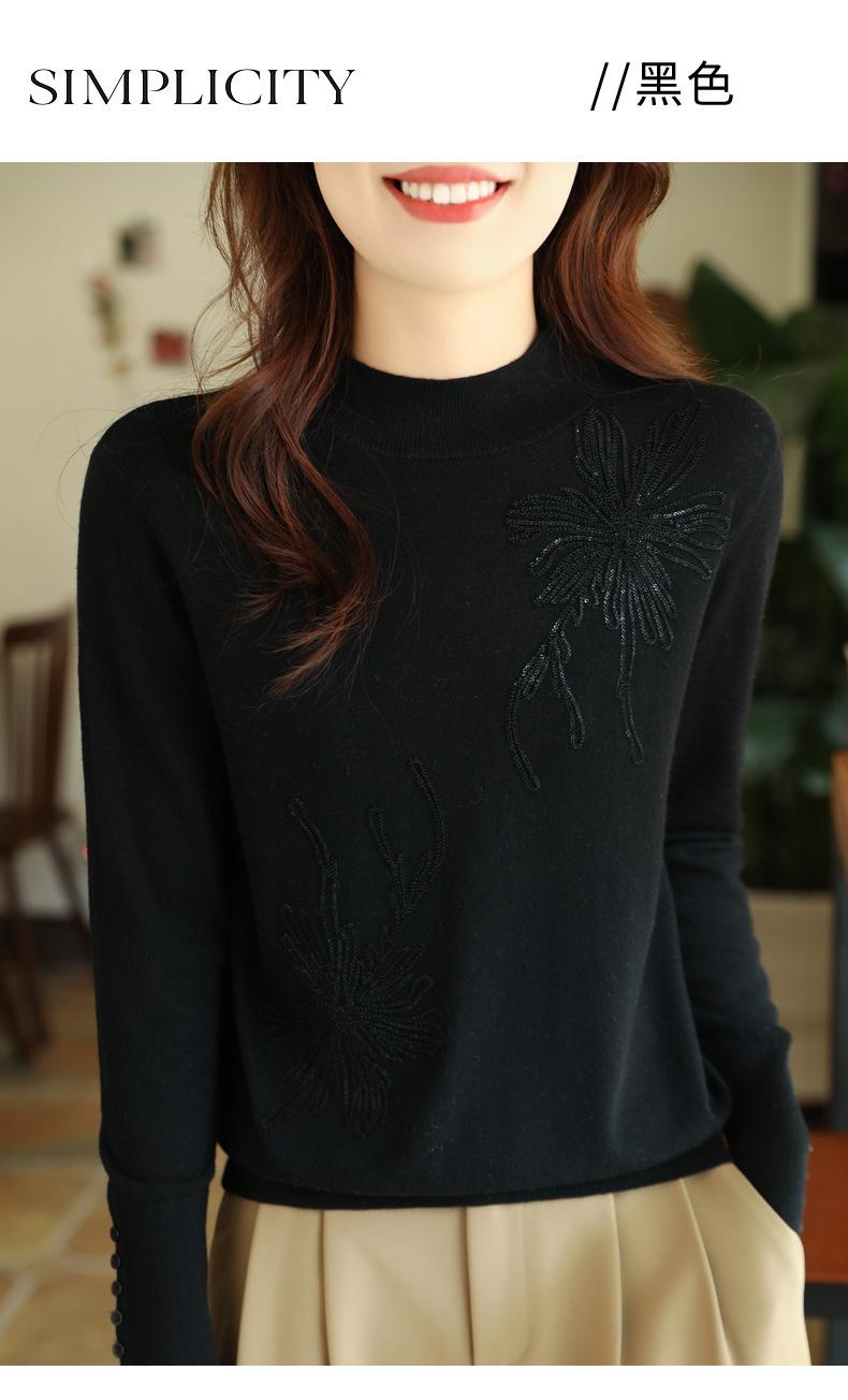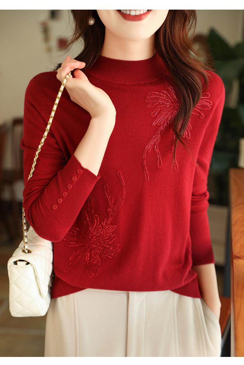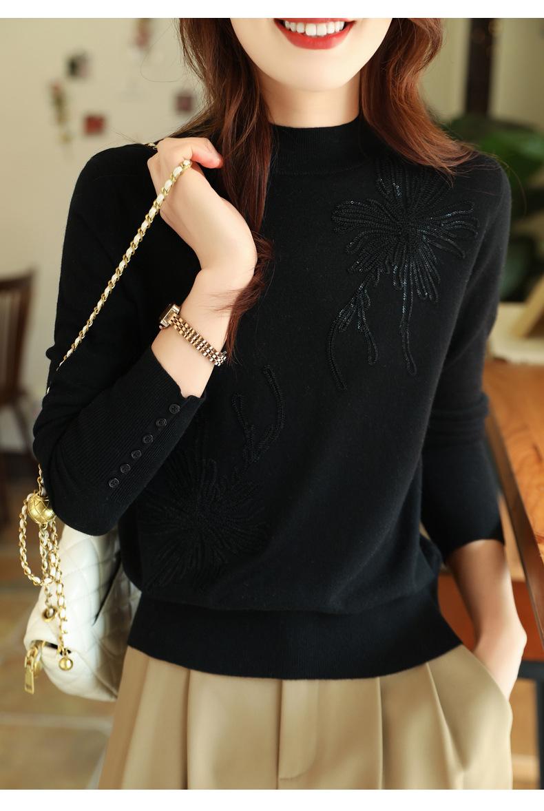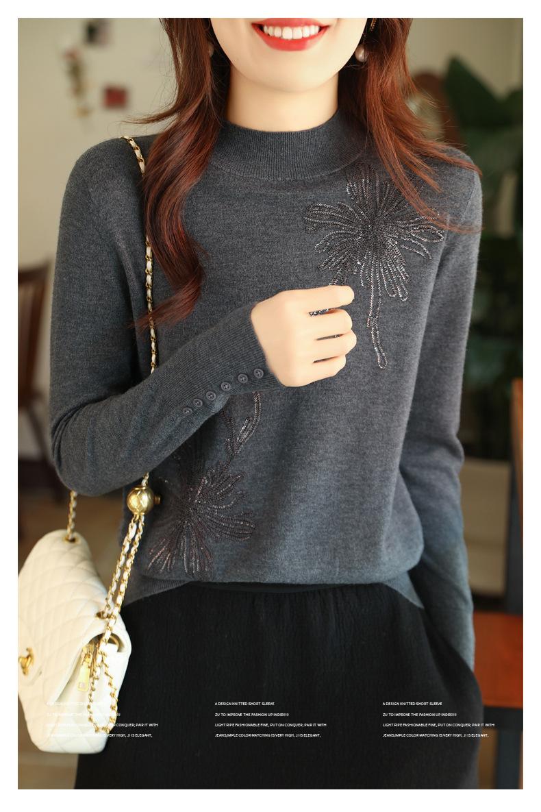 Suéter de Punto de Manga Larga de Alta Calidad Bordado Pesado para Mujer, Jersey de Cuello Semialto Suave y Cómodo, Base Versátil, Suéter Ajustado