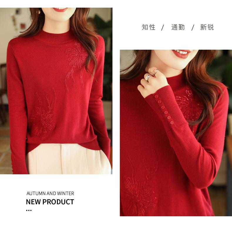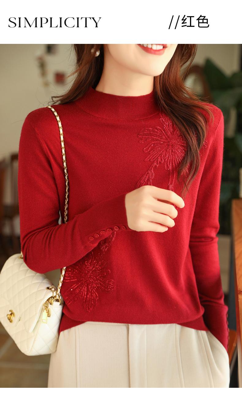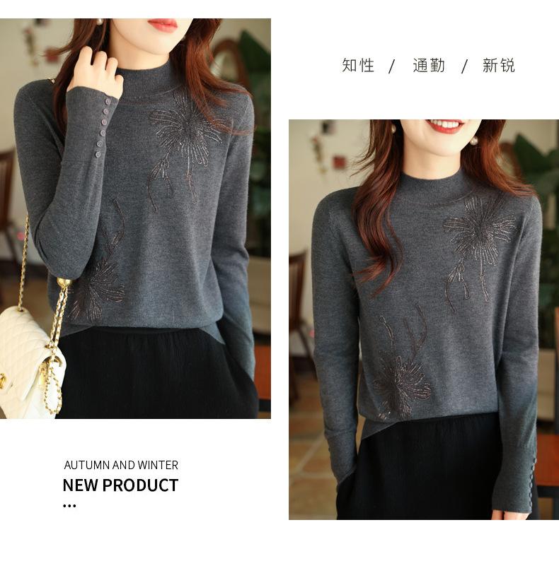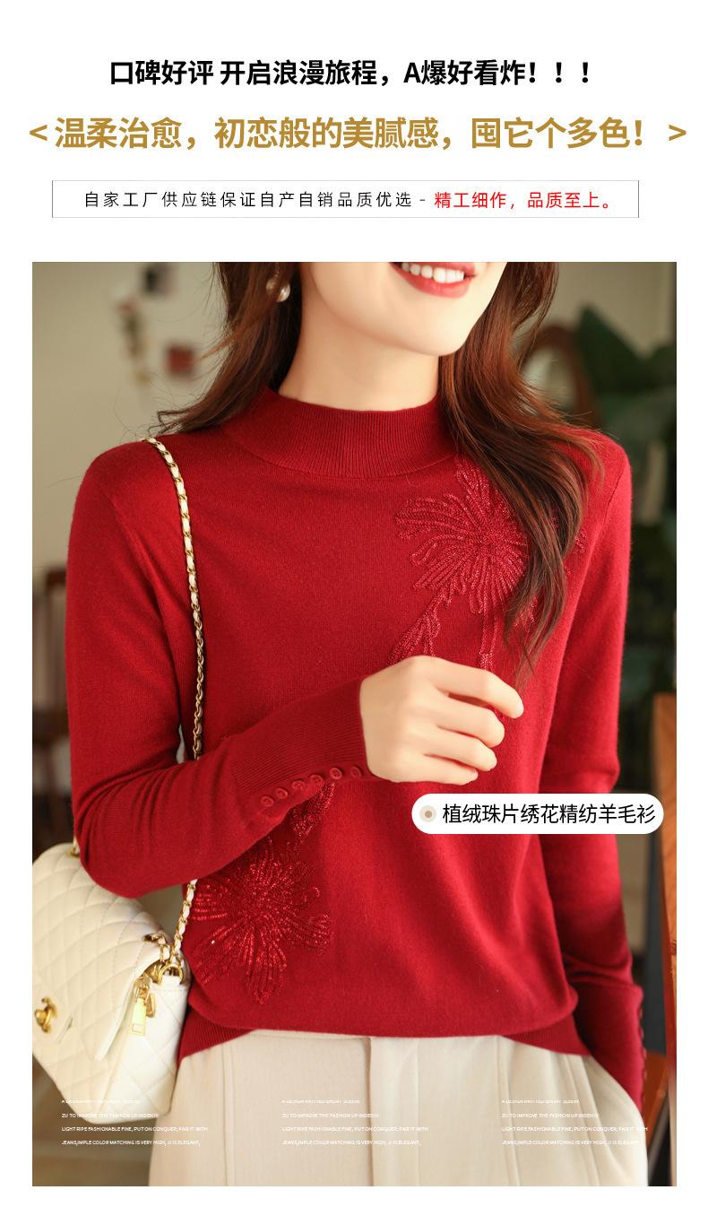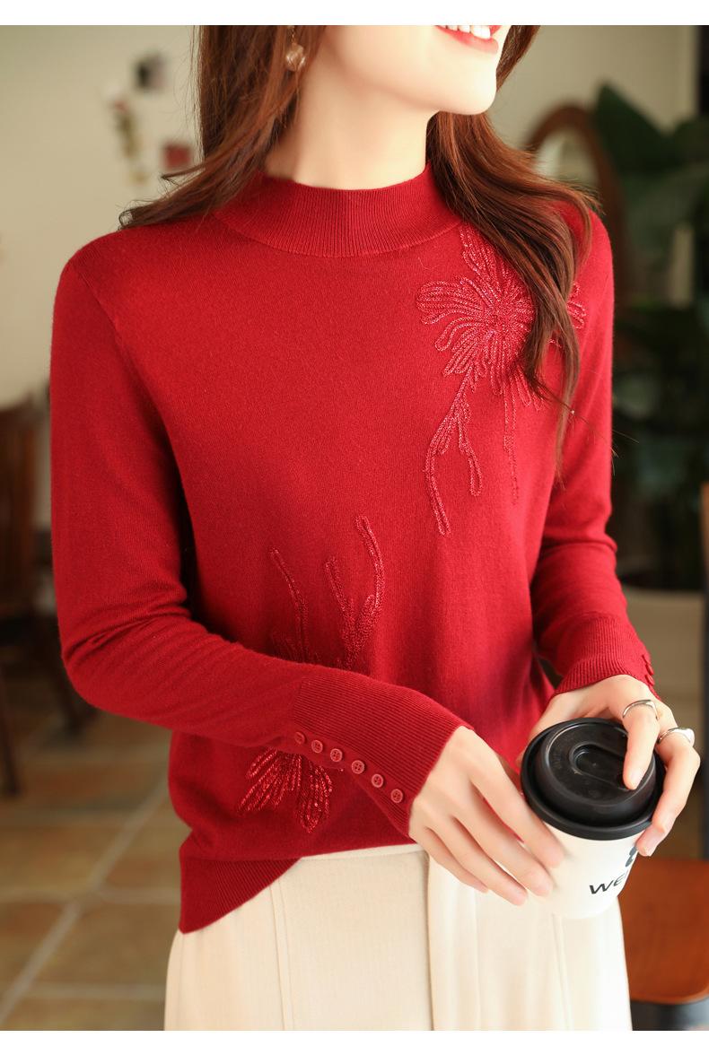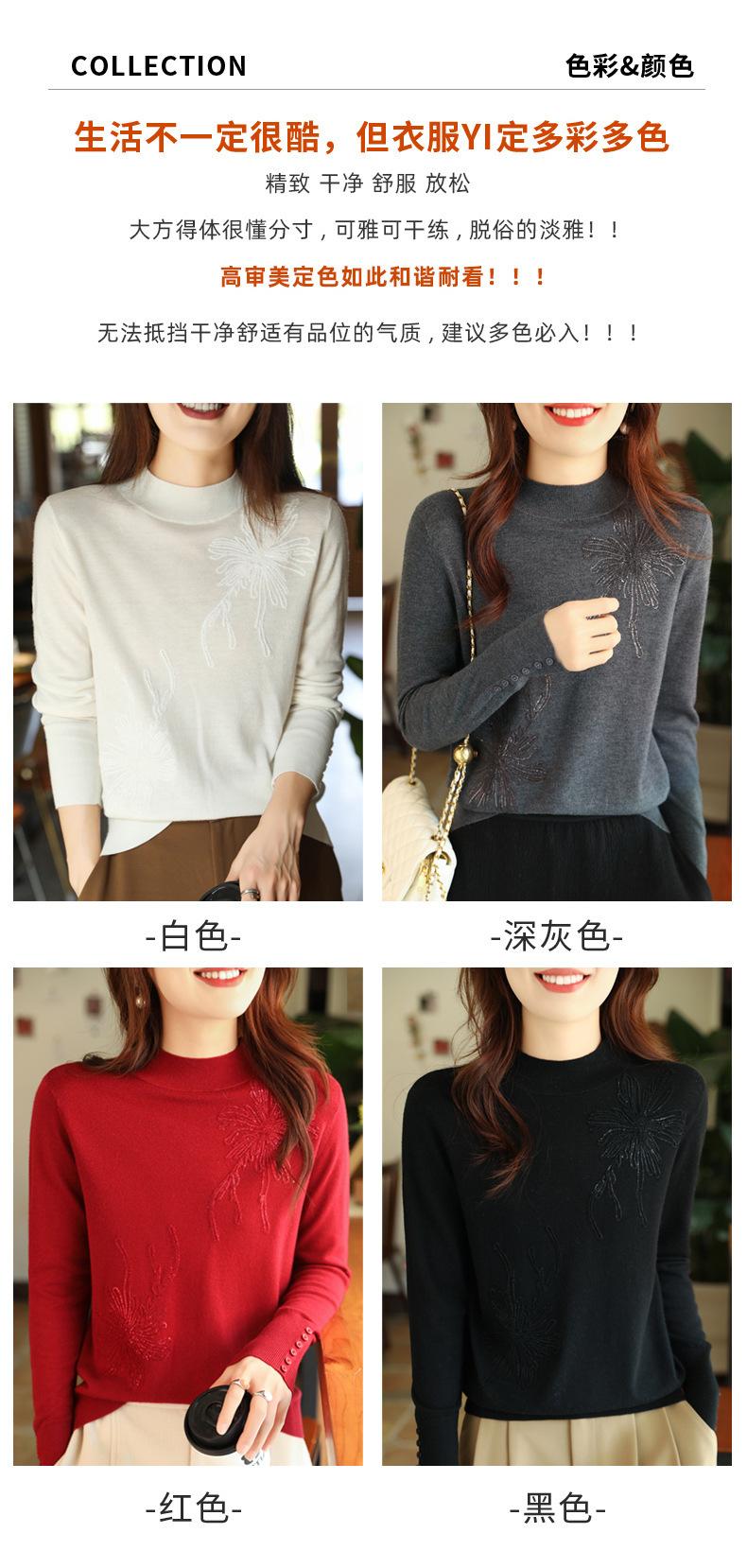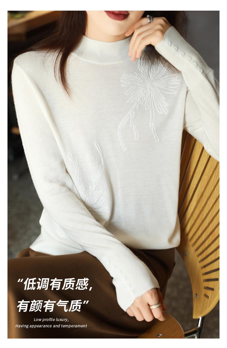 Suéter de Punto de Manga Larga de Alta Calidad Bordado Pesado para Mujer, Jersey de Cuello Semialto Suave y Cómodo, Base Versátil, Suéter Ajustado
