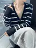 Cárdigan de cachemira a rayas para otoño e invierno, suéter corto con cuello en V para mujer, suéter holgado de lana, top de moda