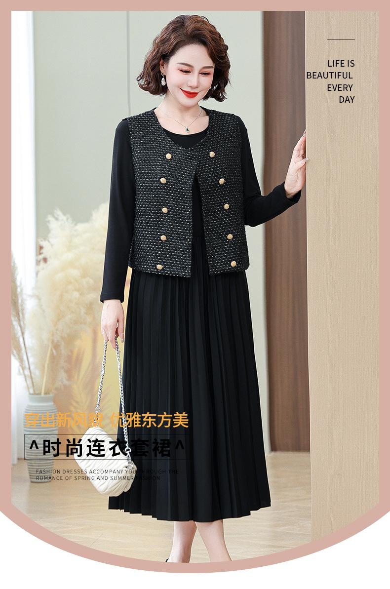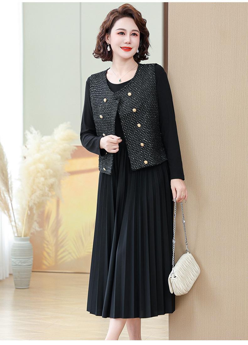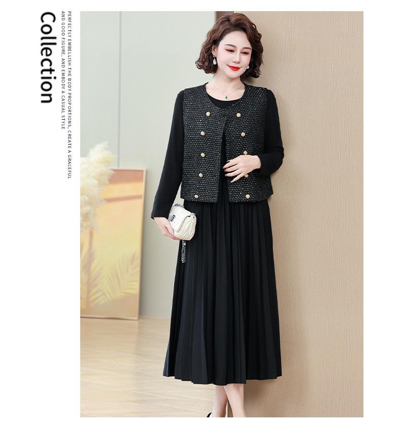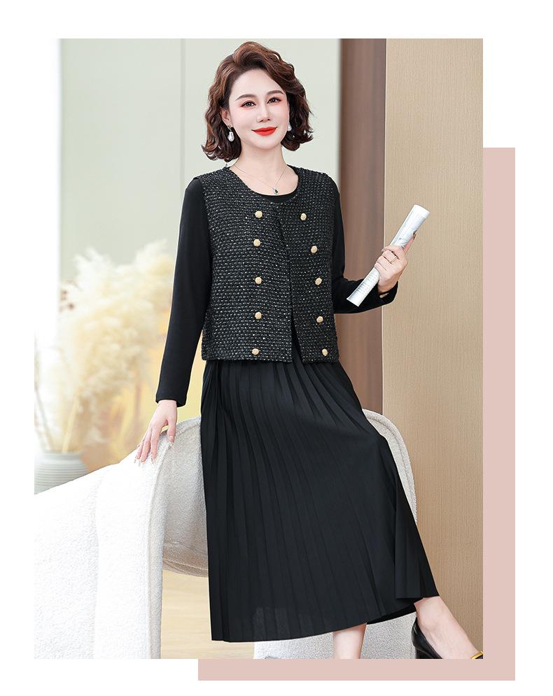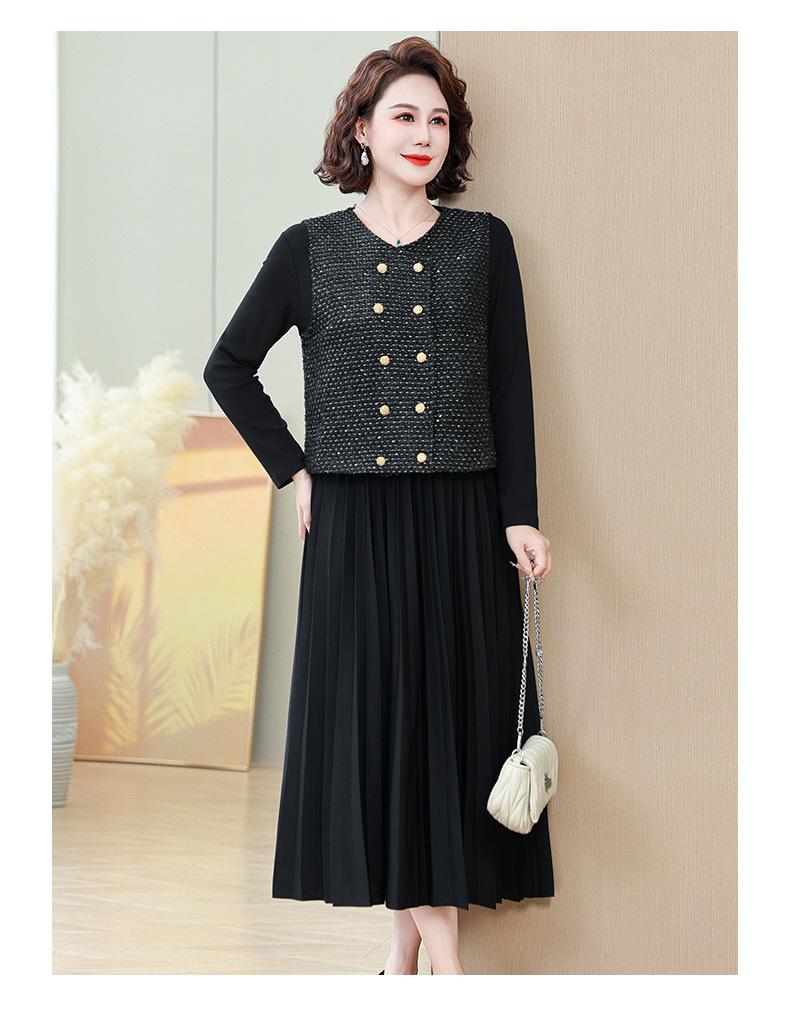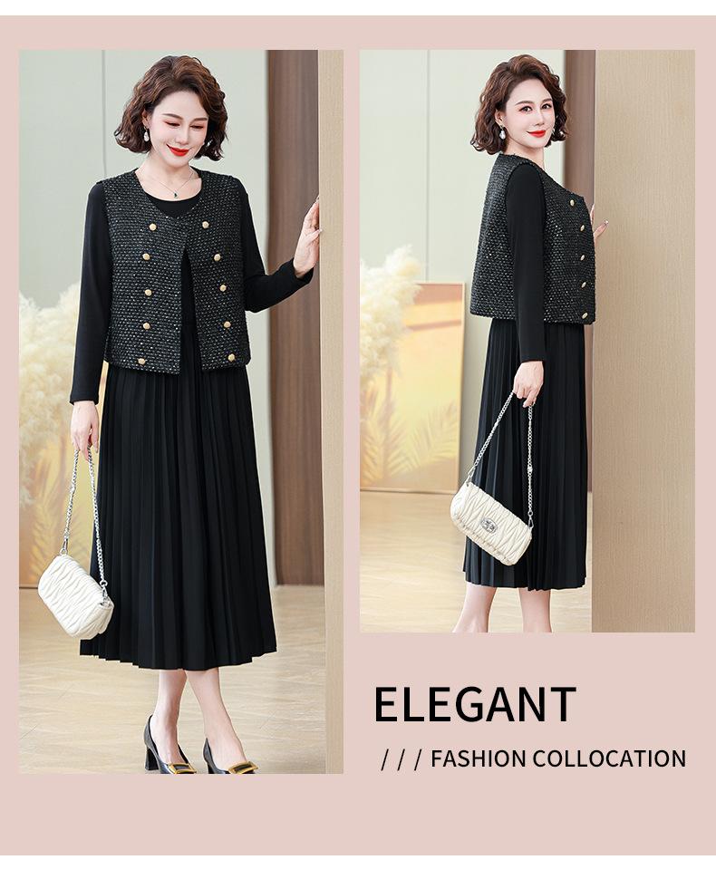 Traje de Vestido Negro de Manga Larga Otoño Ropa de Mujer Estilo Chanel Chaleco Chaqueta Falda Conjunto de Dos Piezas para Madre de Mediana Edad