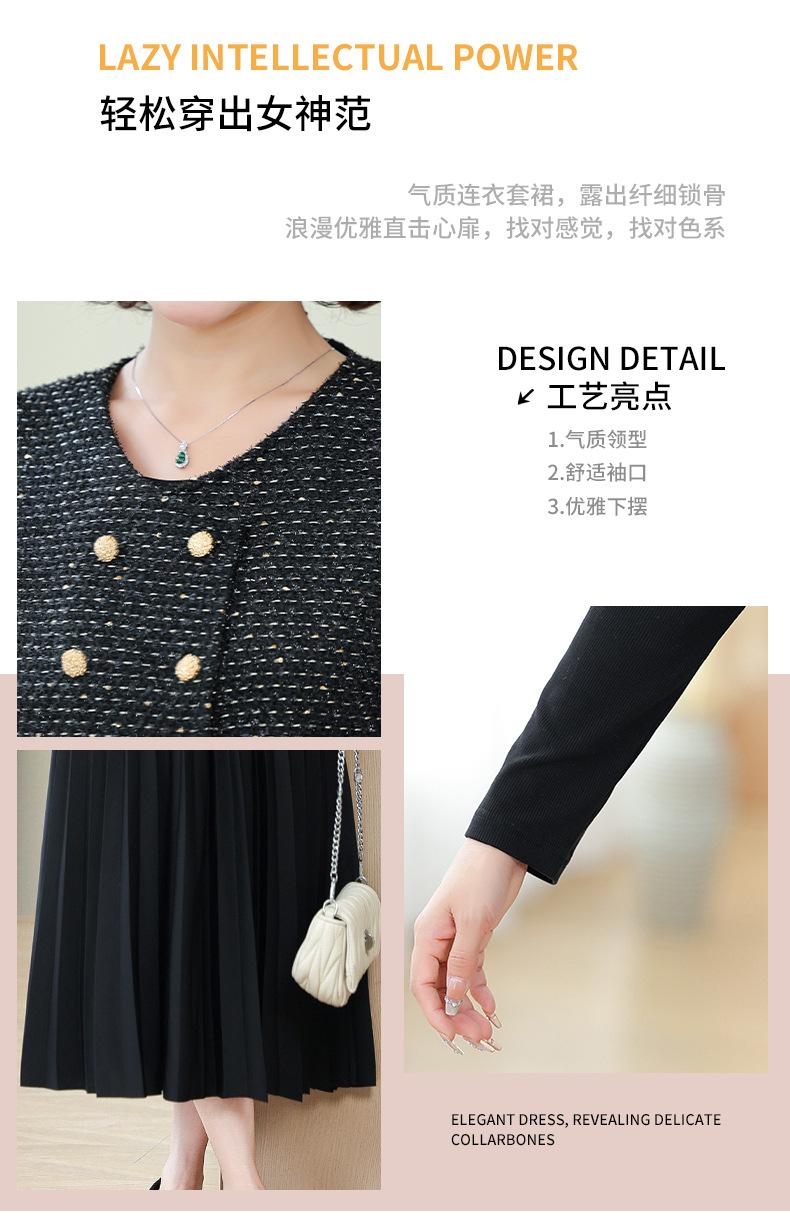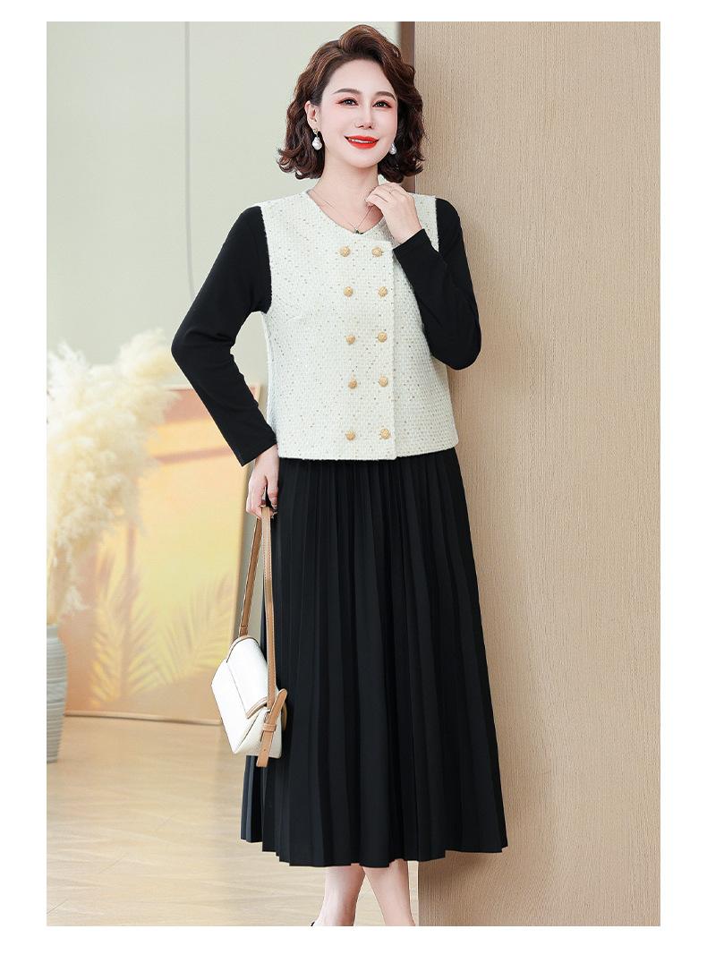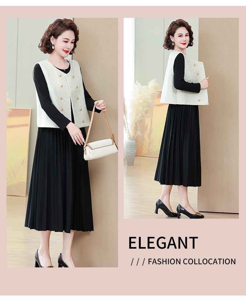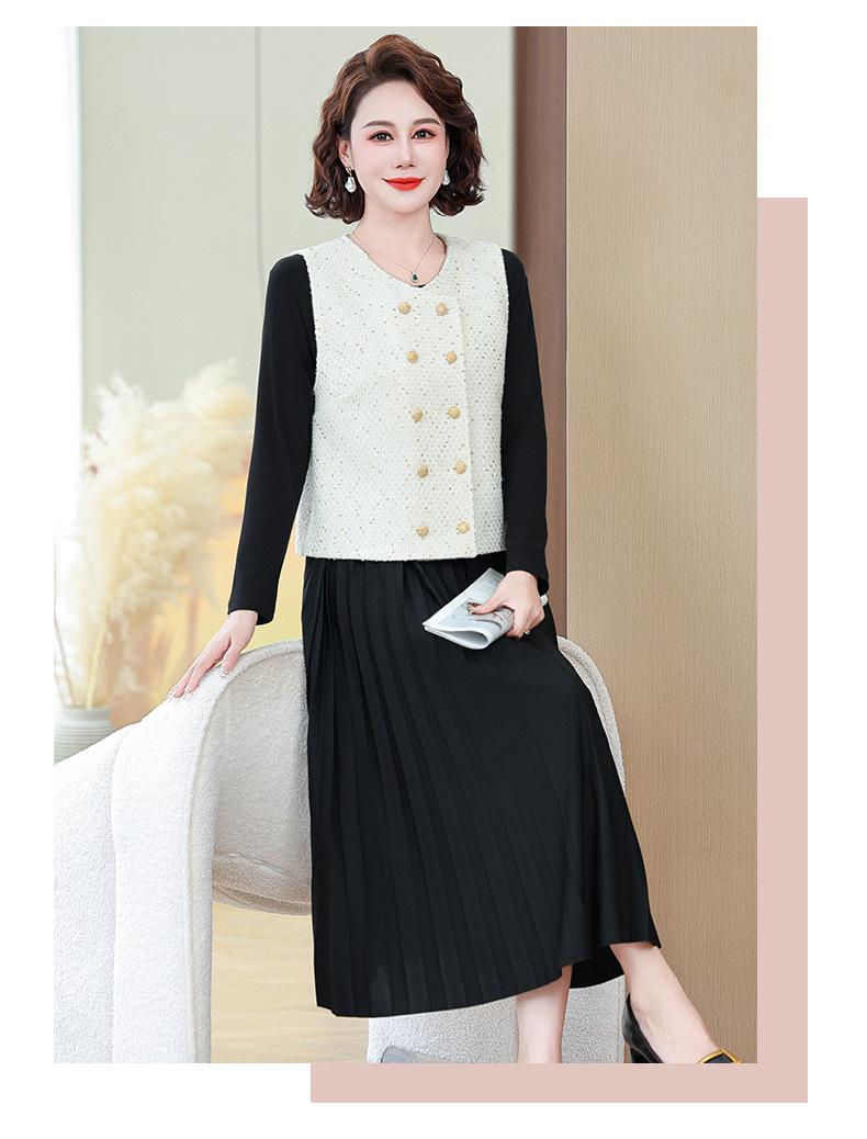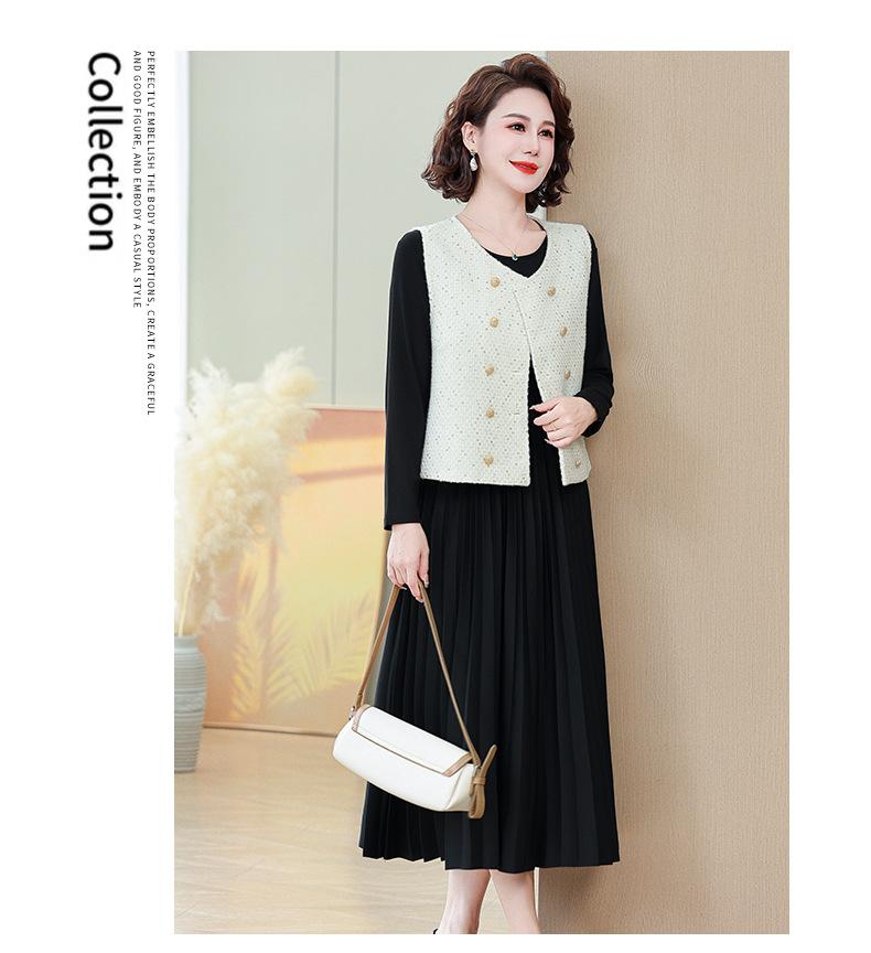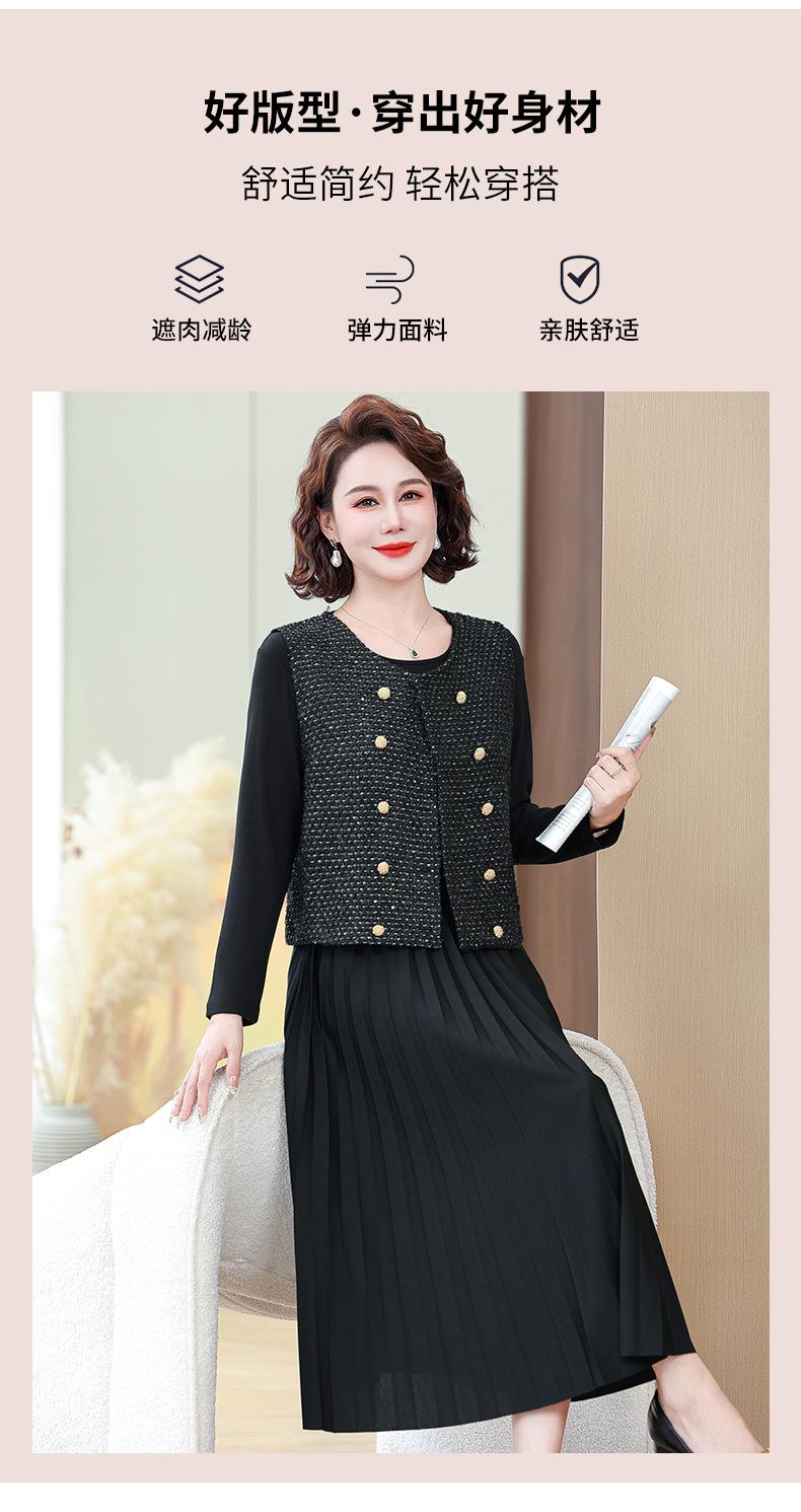 Traje de Vestido Negro de Manga Larga Otoño Ropa de Mujer Estilo Chanel Chaleco Chaqueta Falda Conjunto de Dos Piezas para Madre de Mediana Edad