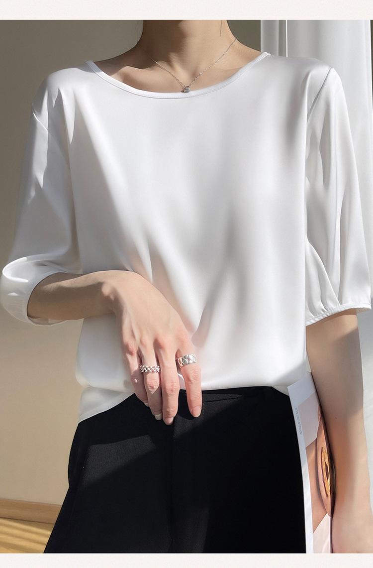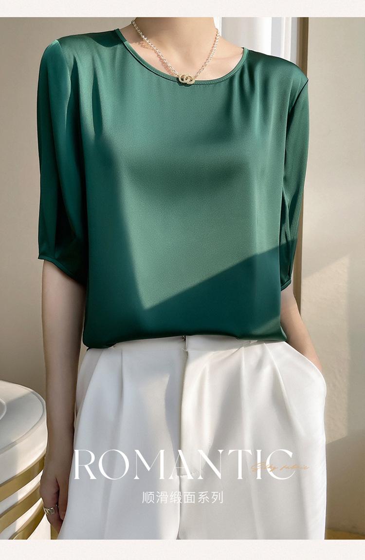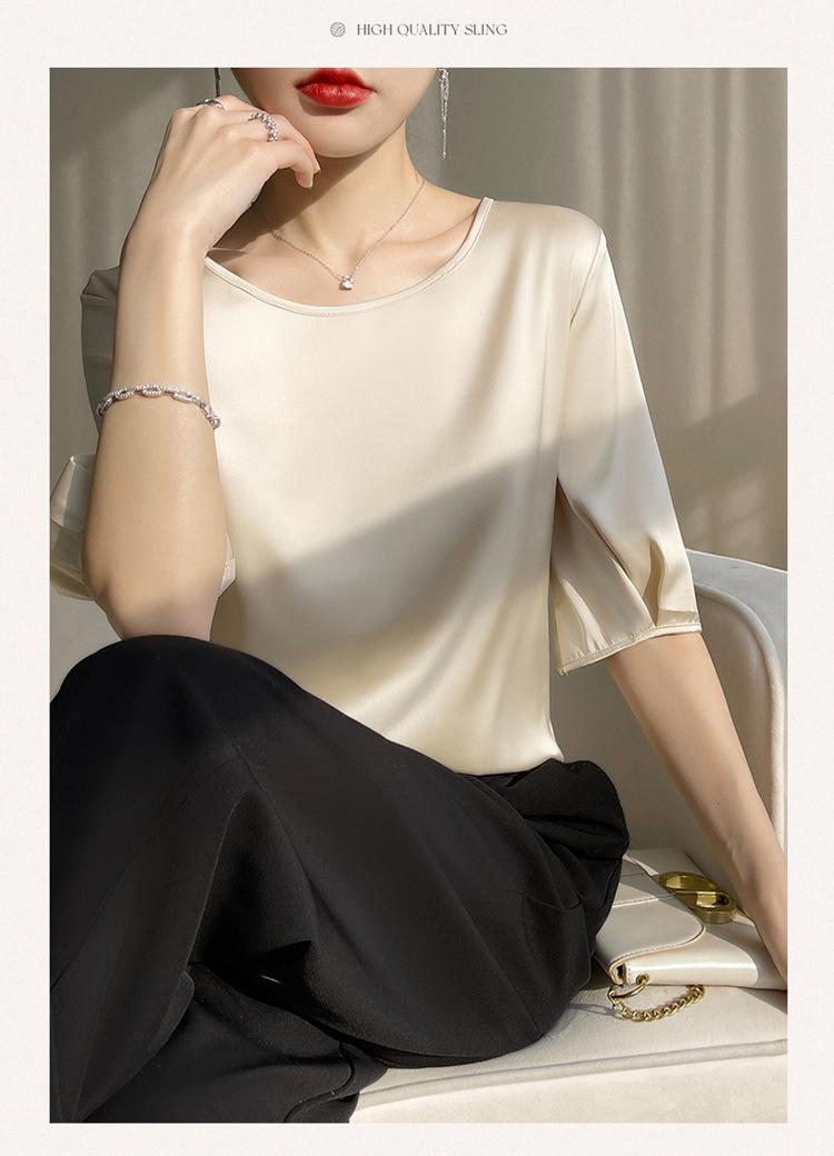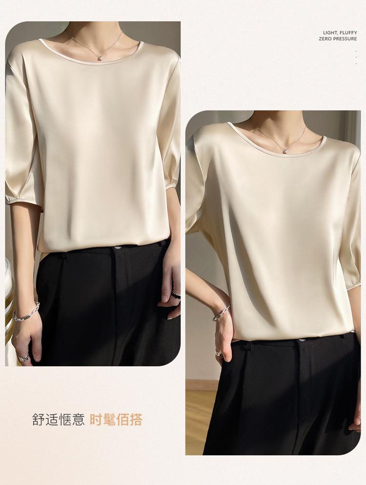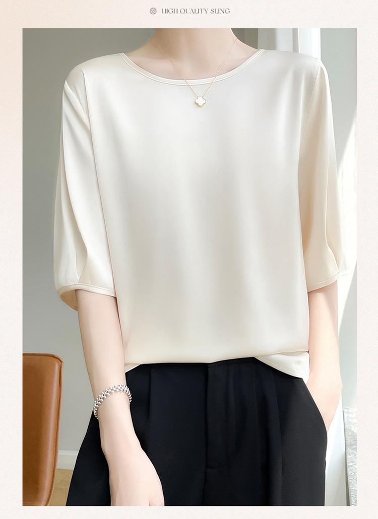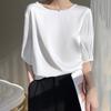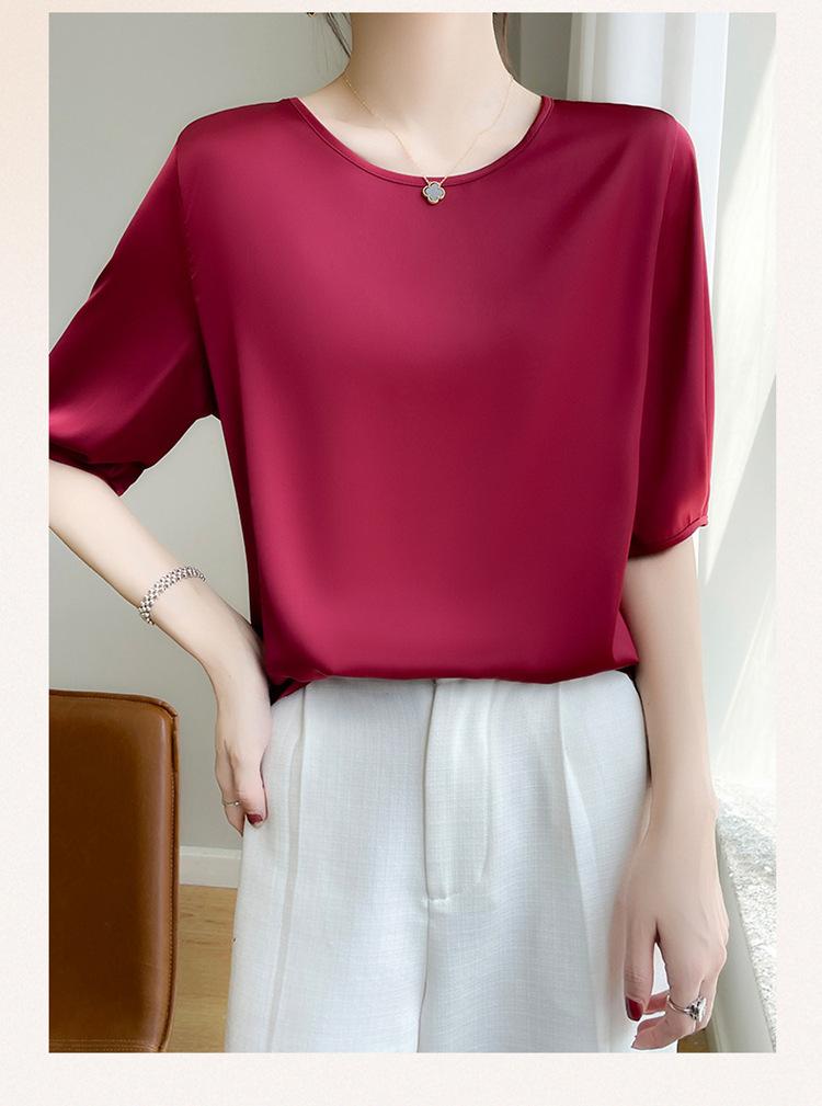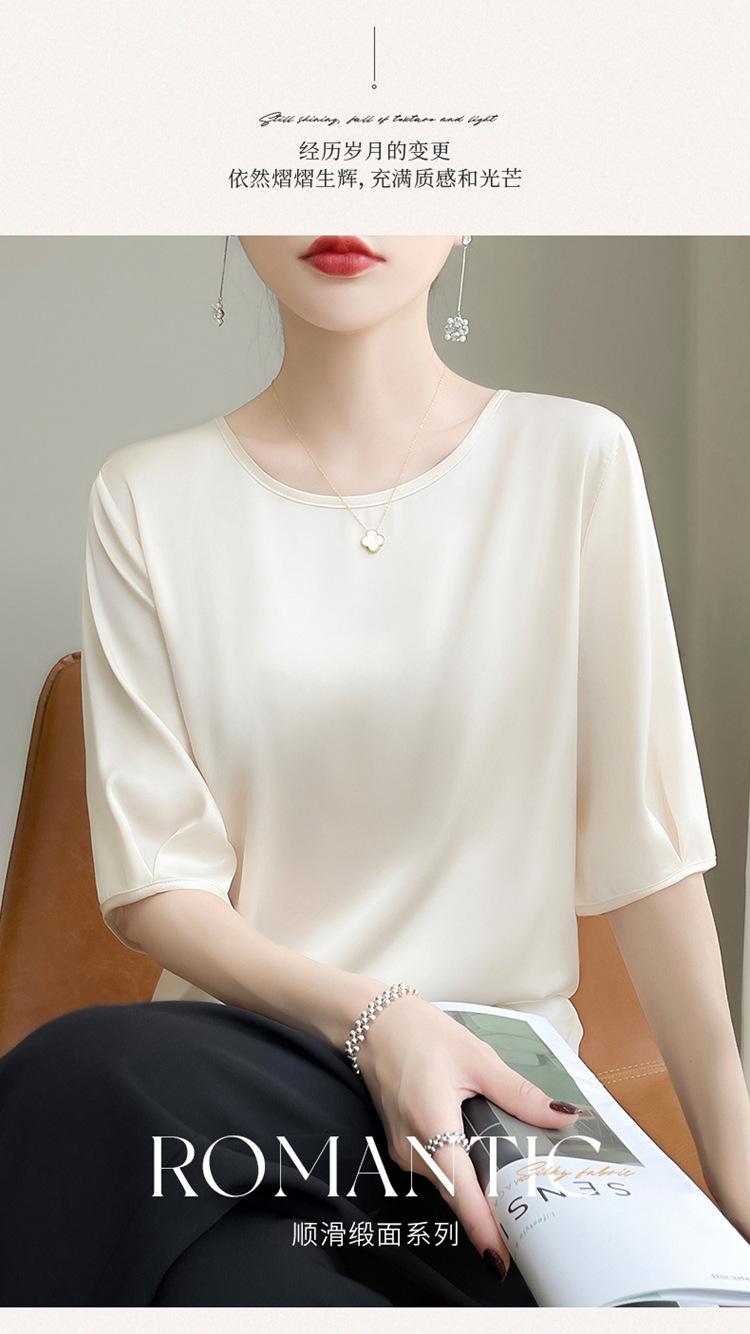 Camiseta de seda transpirable para mujer, primavera y verano 2024, cuello redondo, holgada, de satén acético, de color liso, combinable con todo.