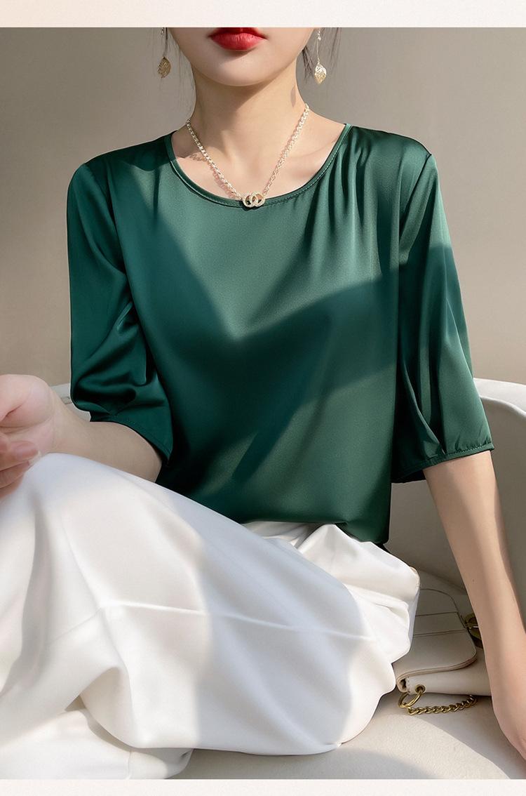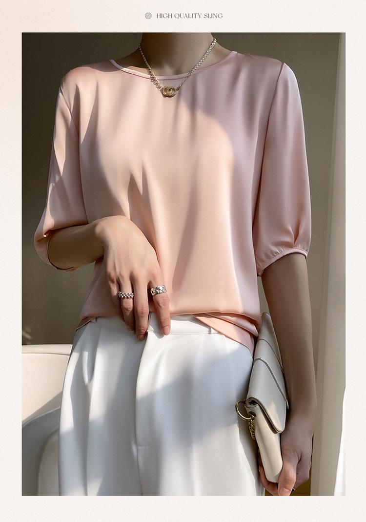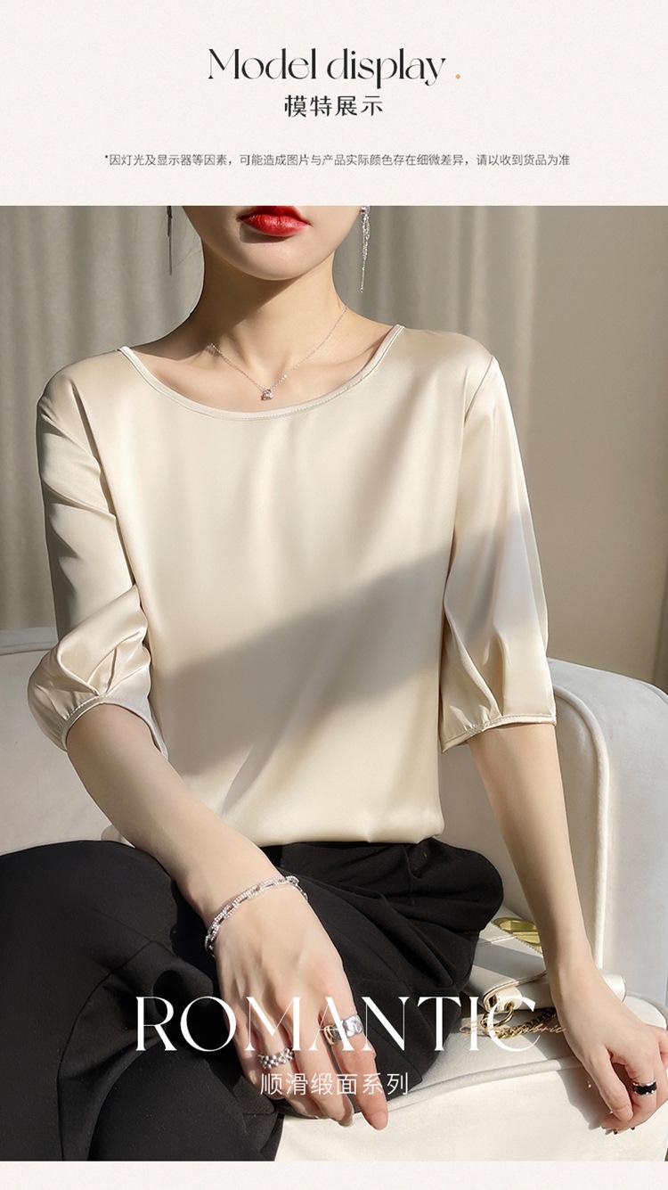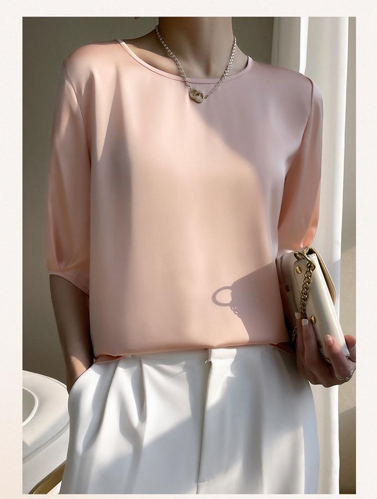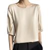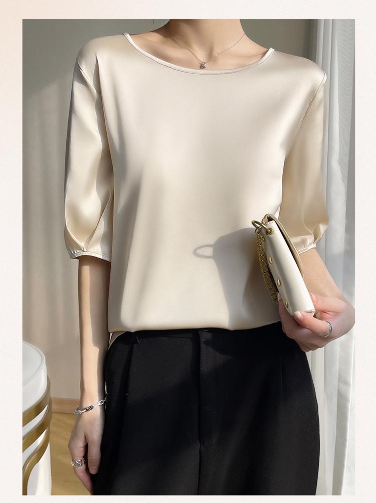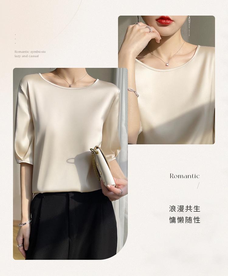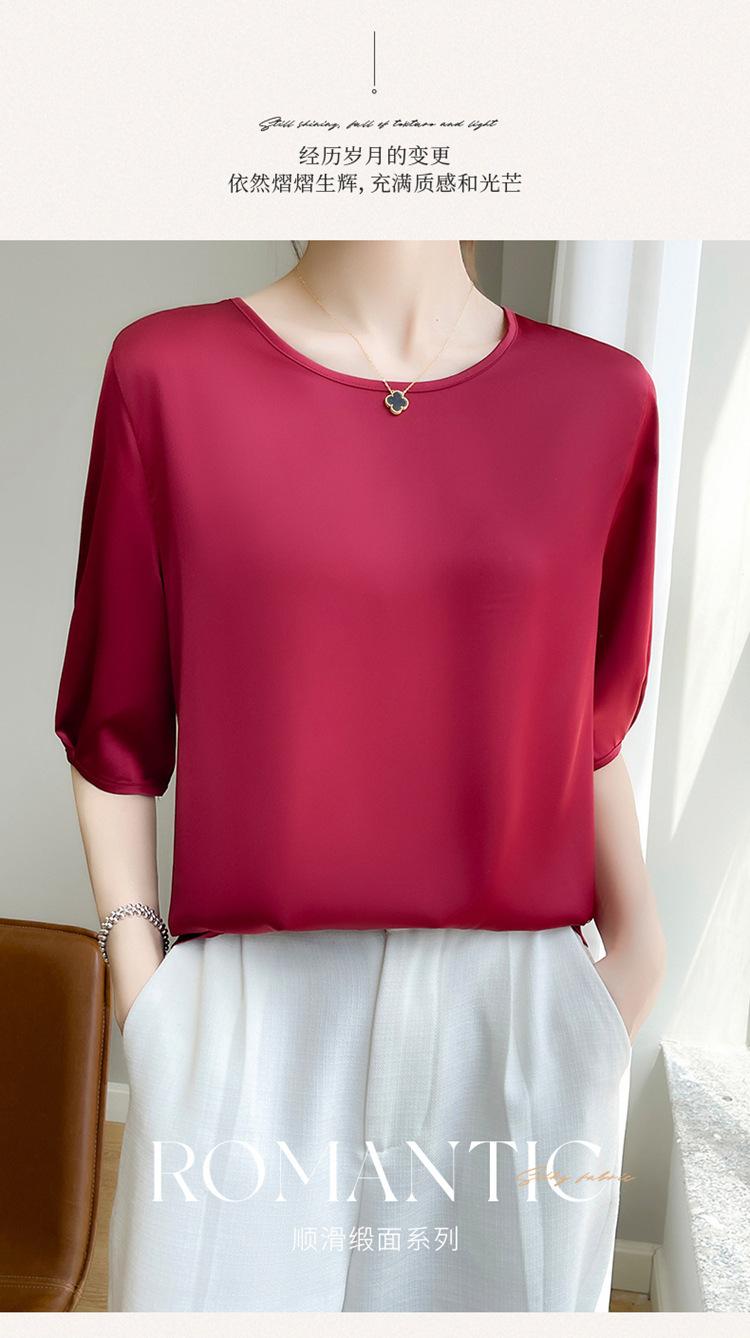 Camiseta de seda transpirable para mujer, primavera y verano 2024, cuello redondo, holgada, de satén acético, de color liso, combinable con todo.