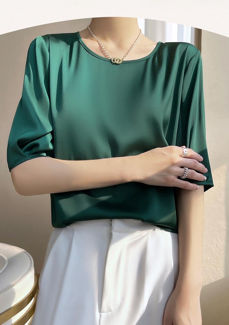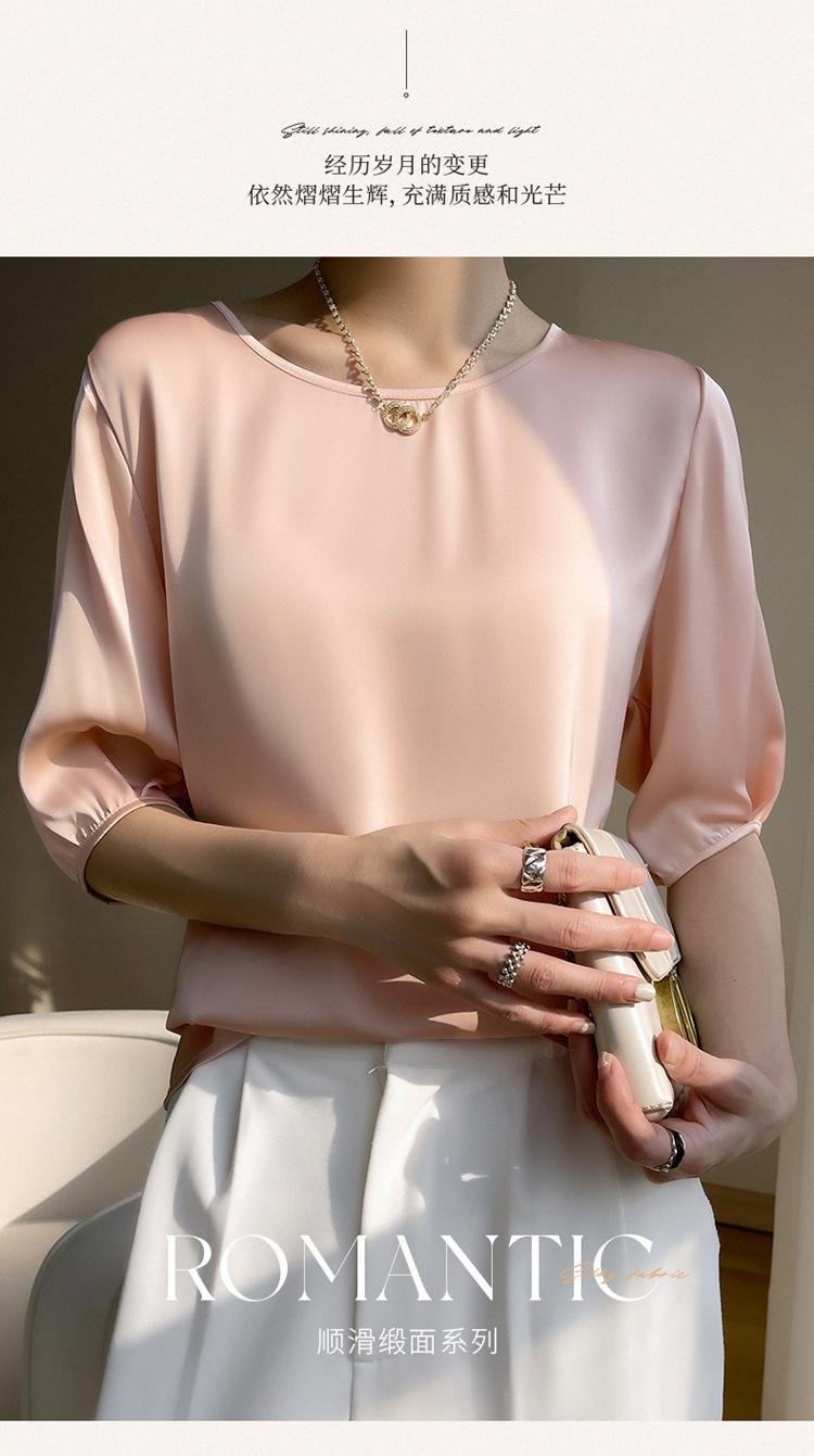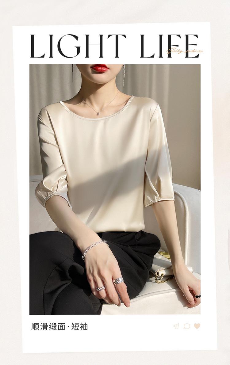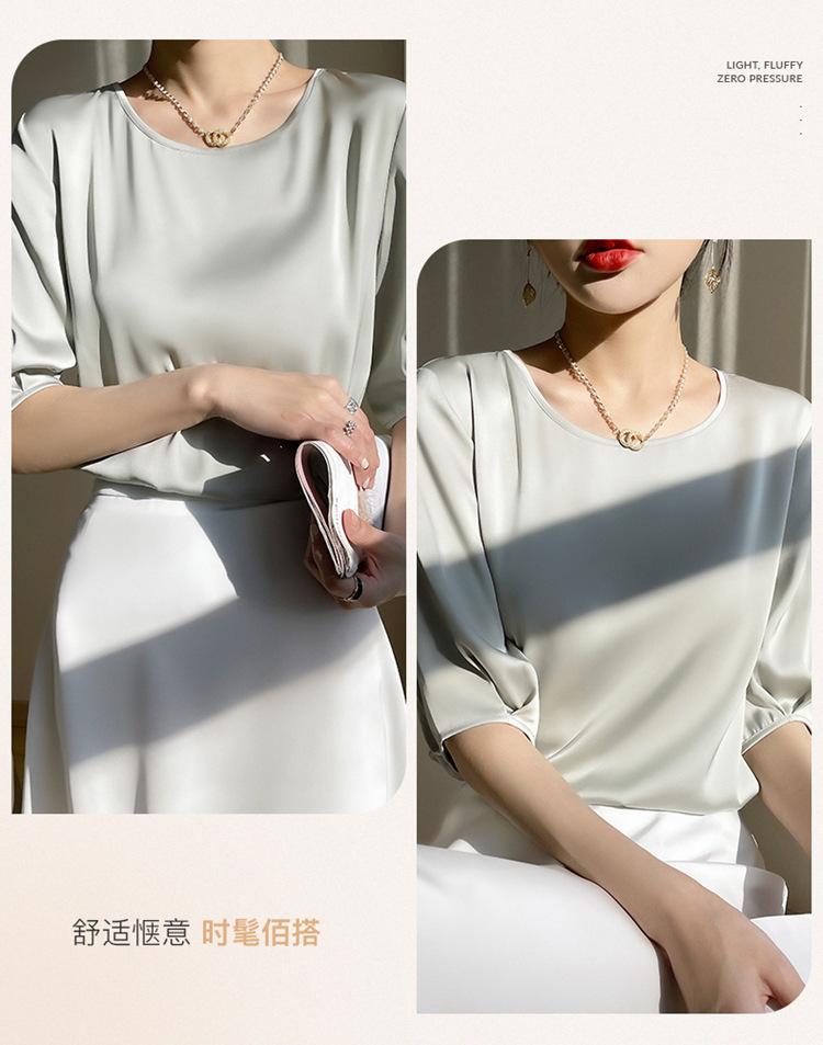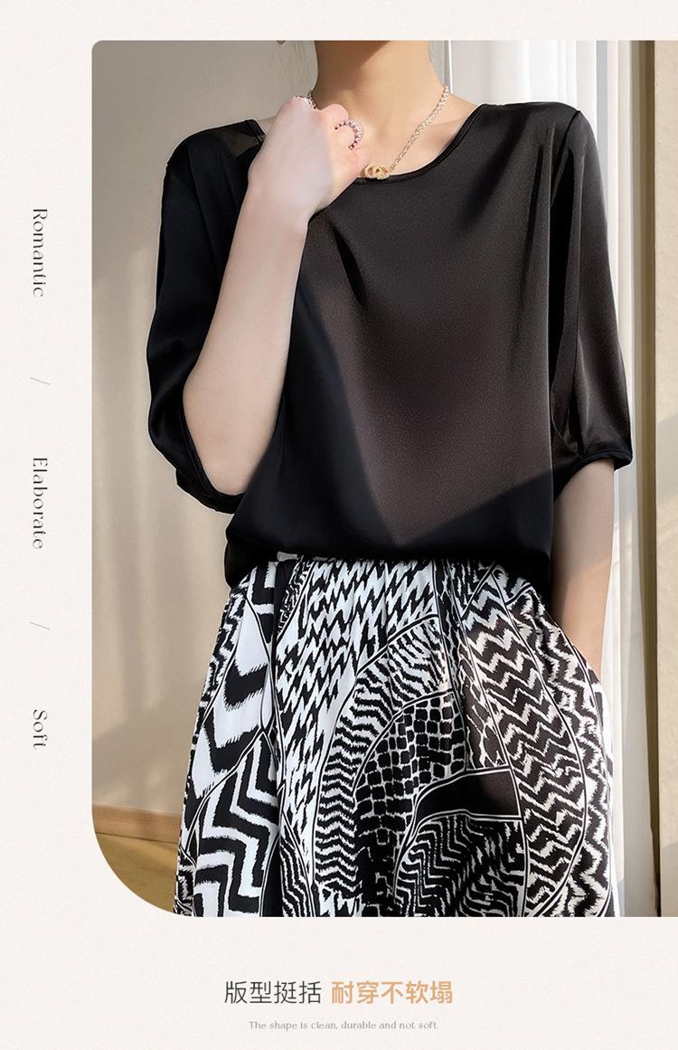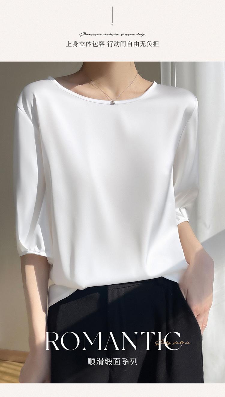 Camiseta de seda transpirable para mujer, primavera y verano 2024, cuello redondo, holgada, de satén acético, de color liso, combinable con todo.