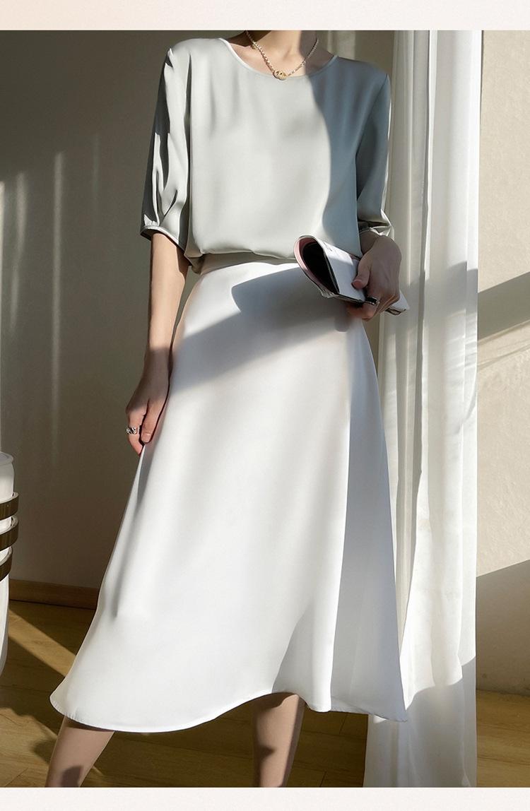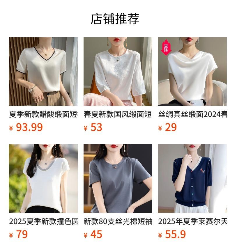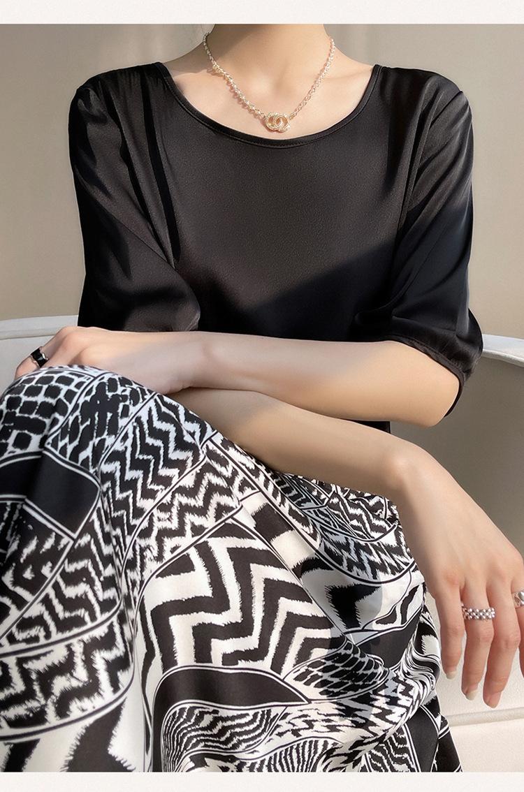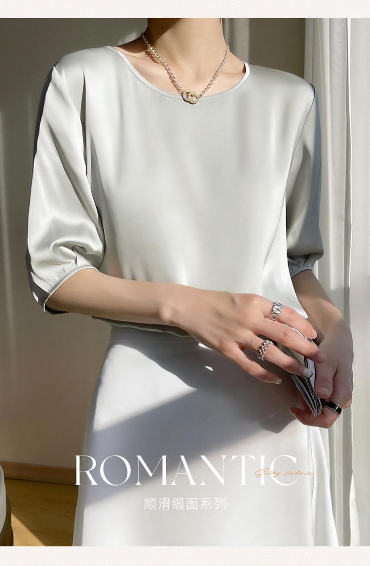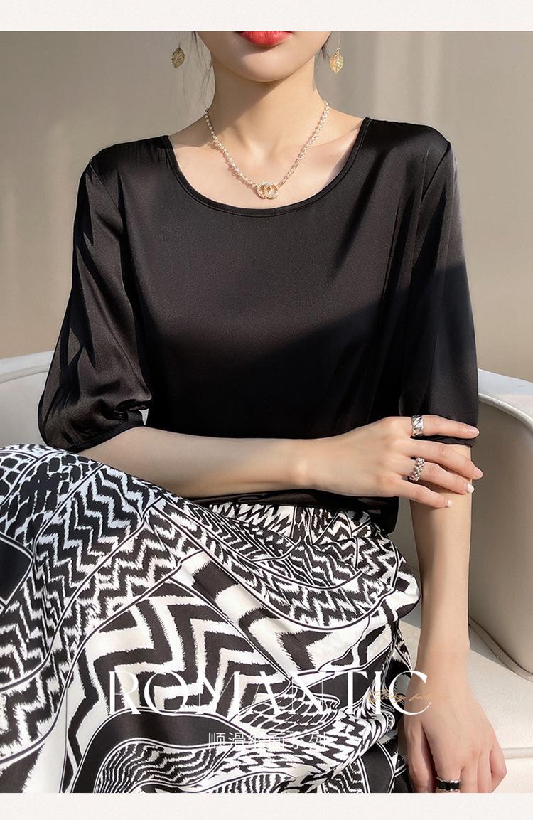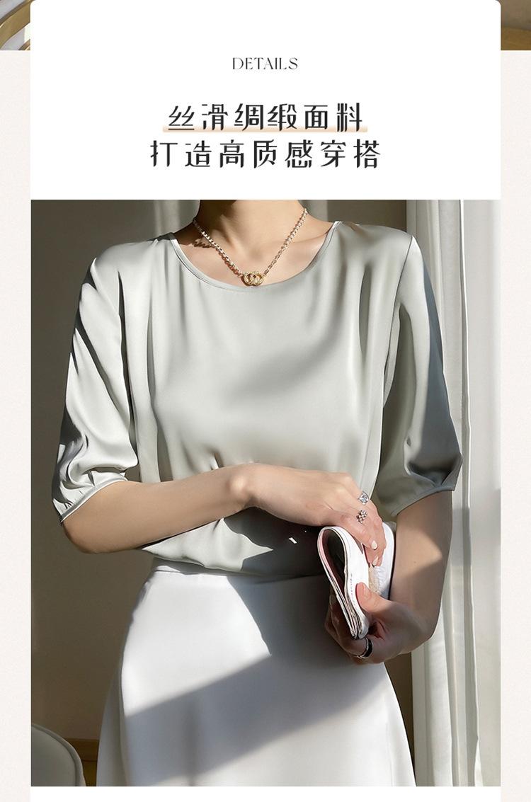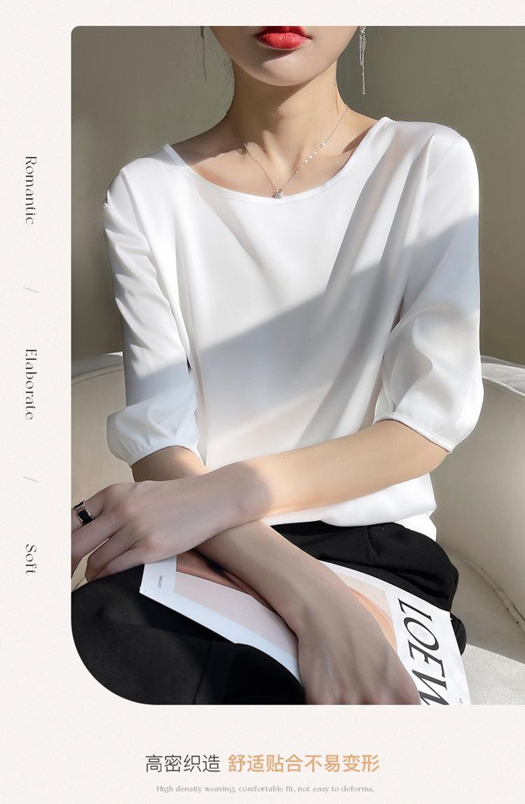 Camiseta de seda transpirable para mujer, primavera y verano 2024, cuello redondo, holgada, de satén acético, de color liso, combinable con todo.