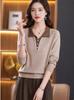Suéter de punto con solapa para mujer, cuello en V, falso jersey de dos piezas, otoño e invierno 2024, nueva camisa básica, atuendo elegante para mujer, combina con todo.