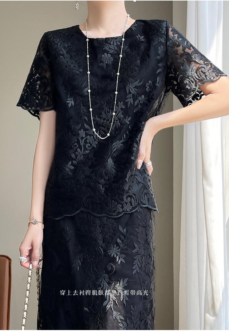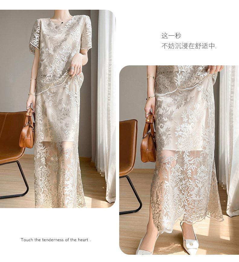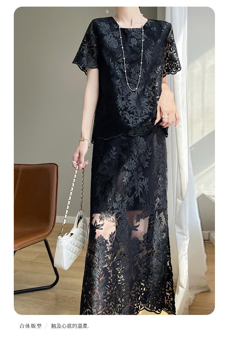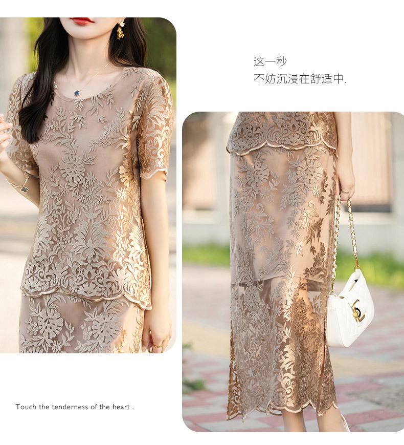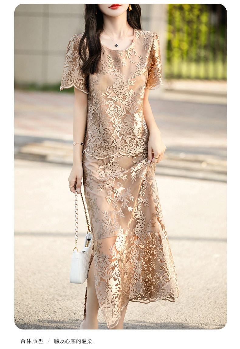 Traje de Falda con Abertura Lateral de Satén de Ácido Acético de Verano Fino de Manga Media con Encaje Bordado de Estilo Moderno y Elegante para Mujer