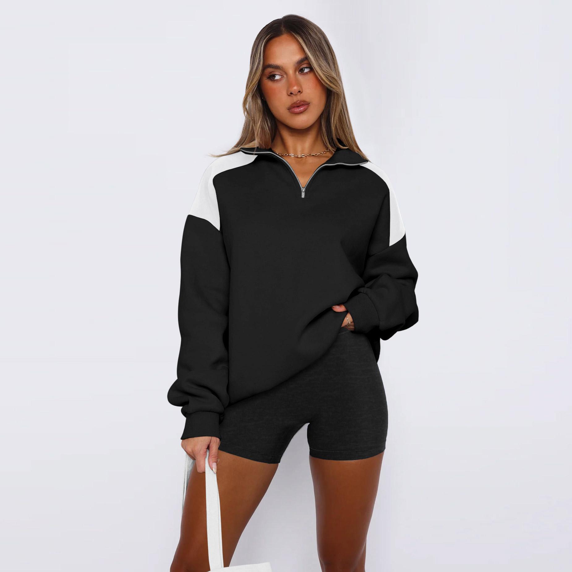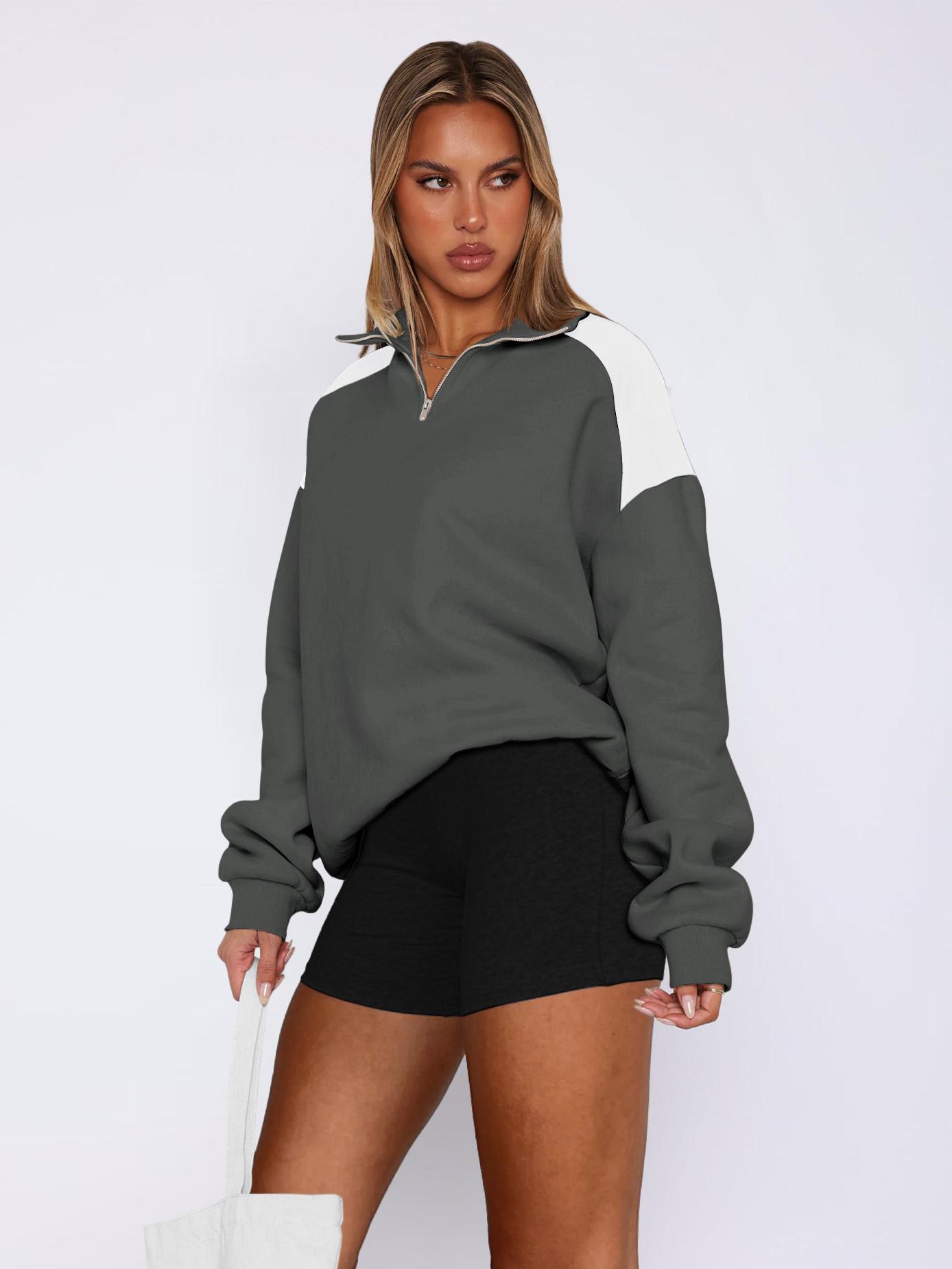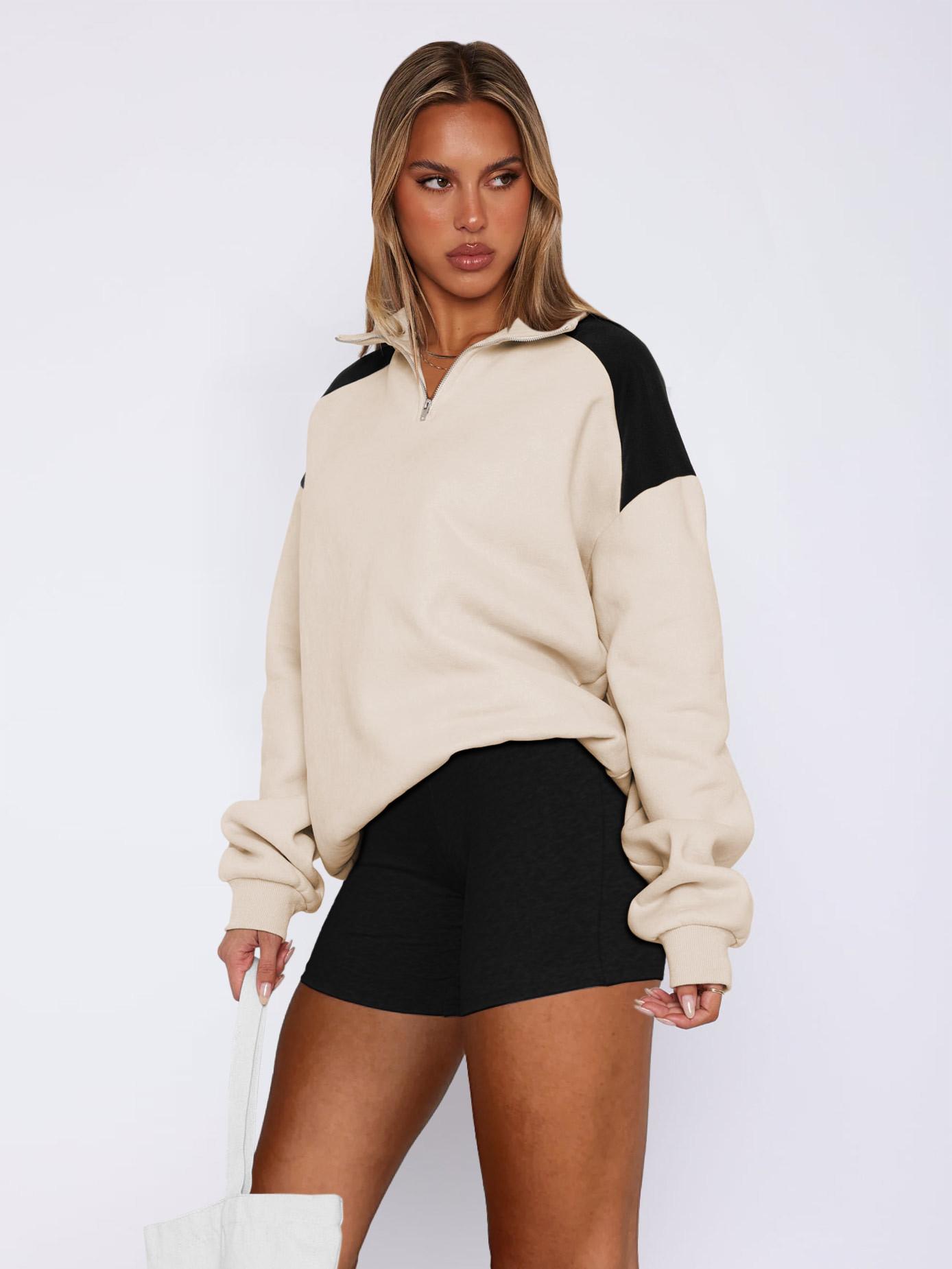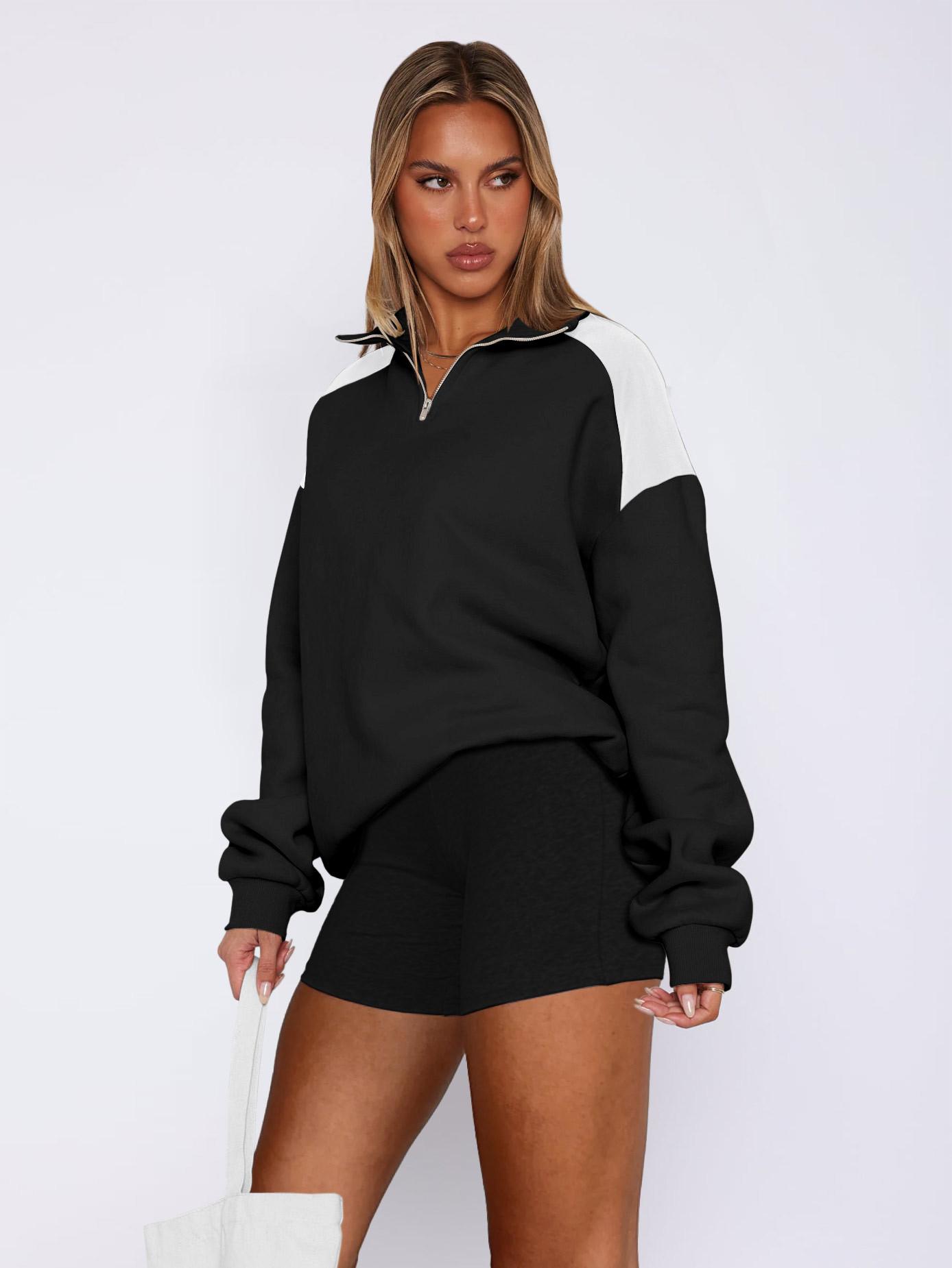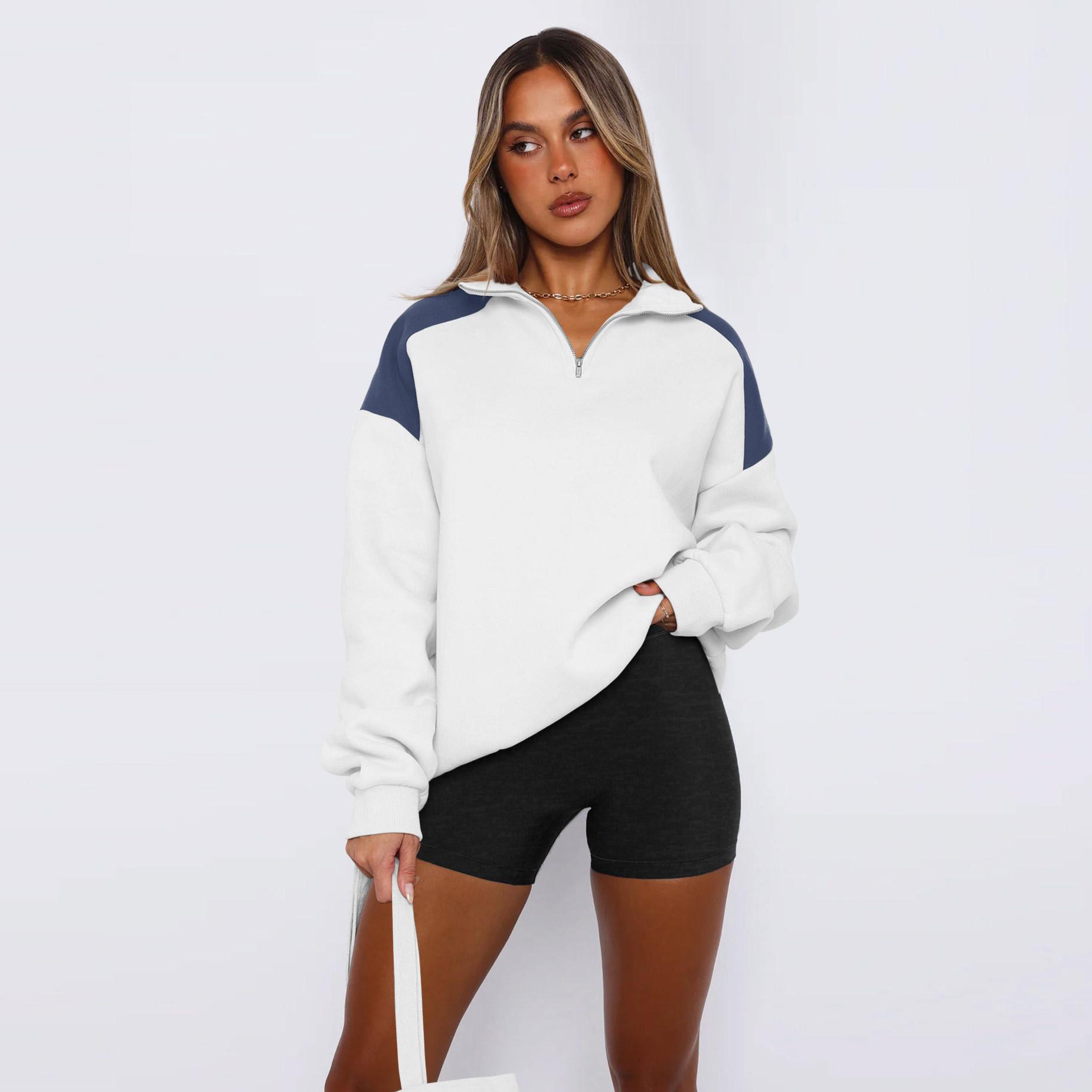 2025 Otoño e Invierno Transfronterizo Retro Color en Contraste Cuello Polo Media Cremallera Sudadera Holgada Diseño Moderno Top de Manga Larga