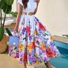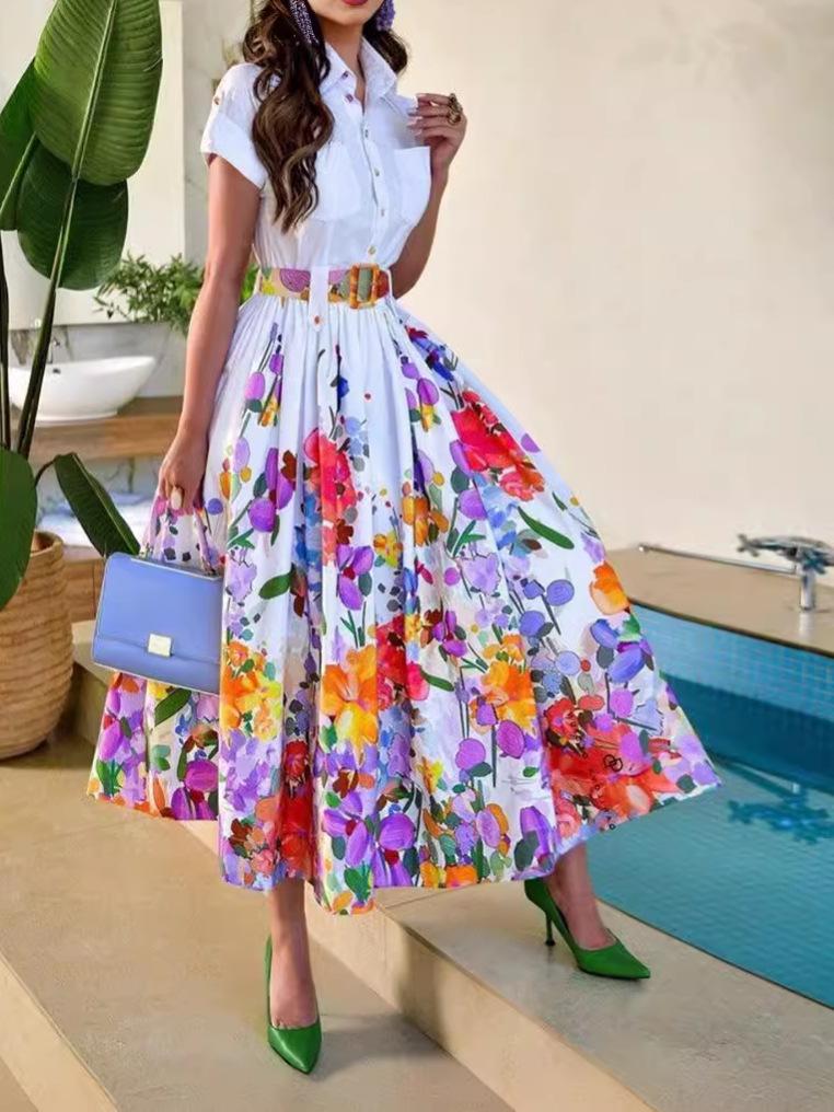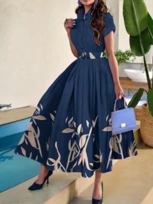 Vestido de manga corta con botones y cinturón, estampado floral, cuello camisero grande, estilo europeo y americano, 2024