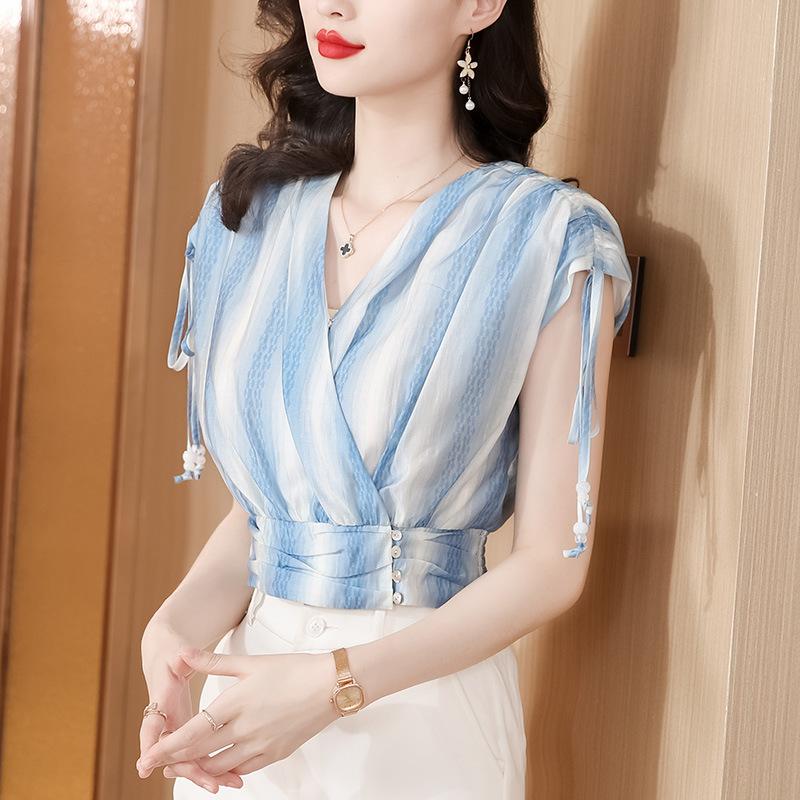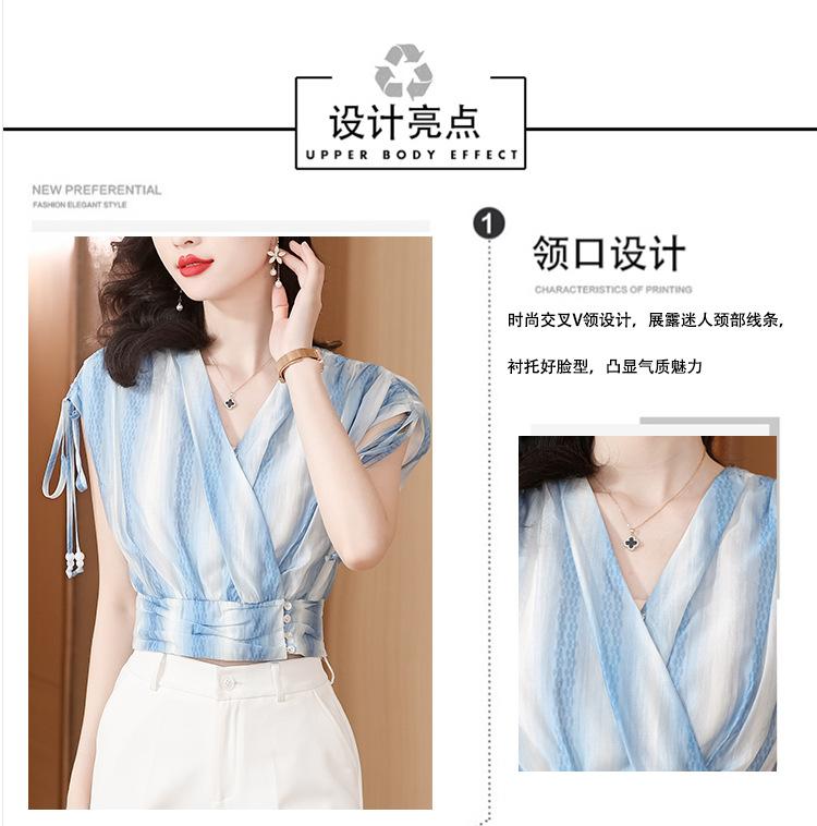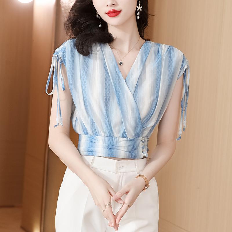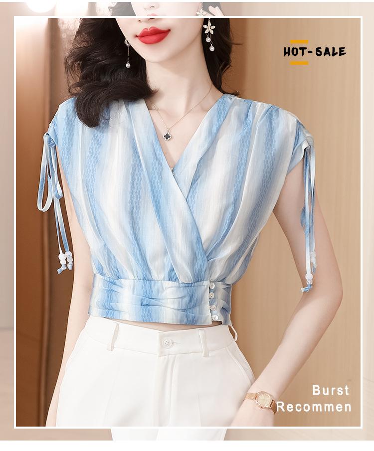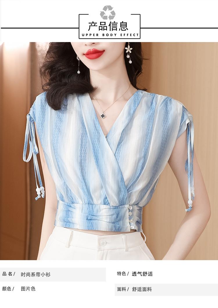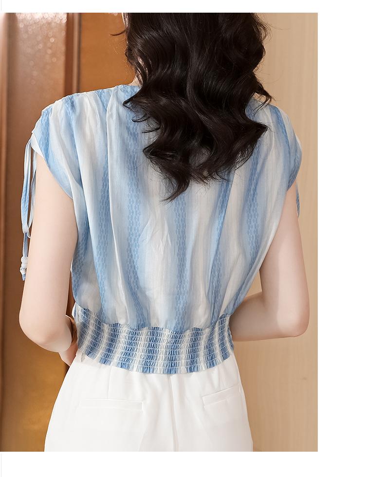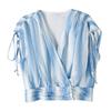 Diseño Estilo Francés Cuello en V con Cordones Camisa Corta para Mujer 2024 Verano Nueva Moda Reductor de Edad Top Rayado Azul