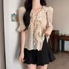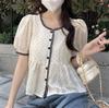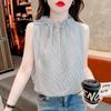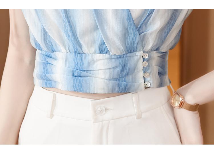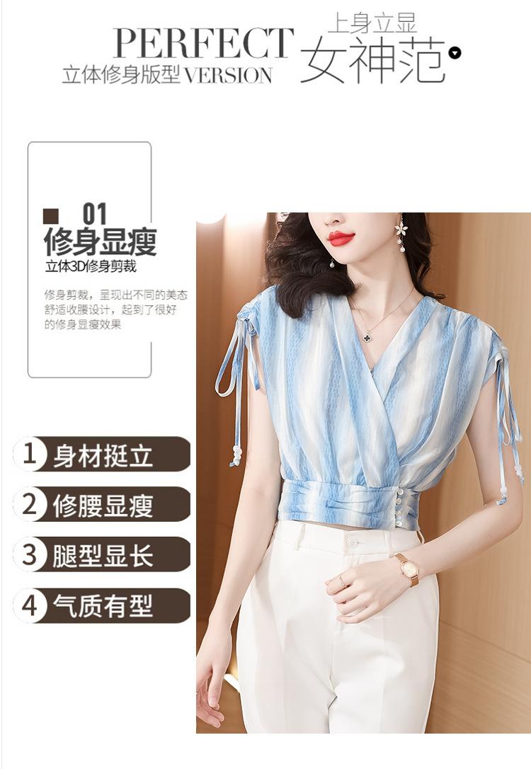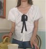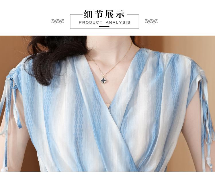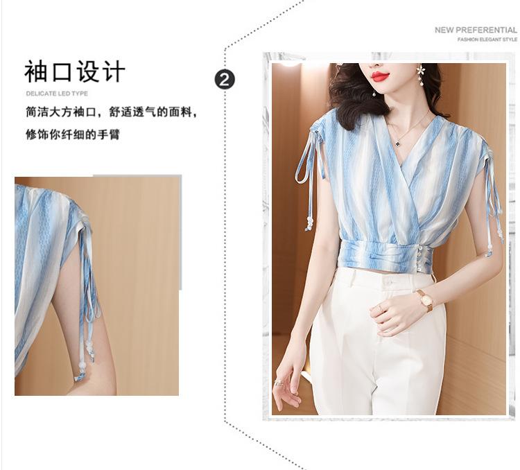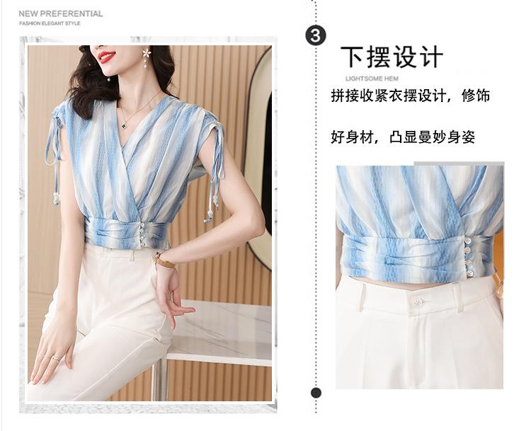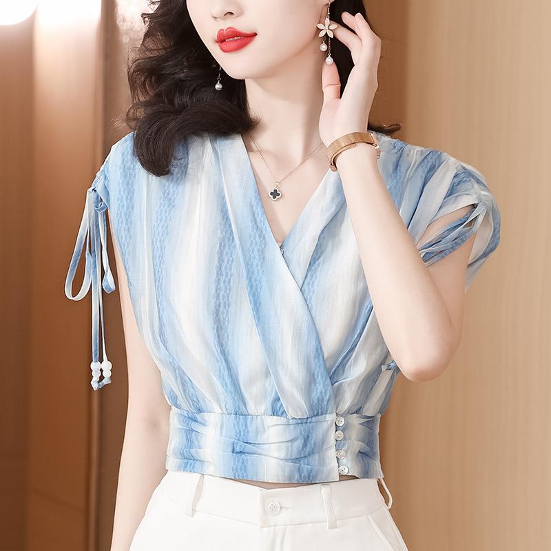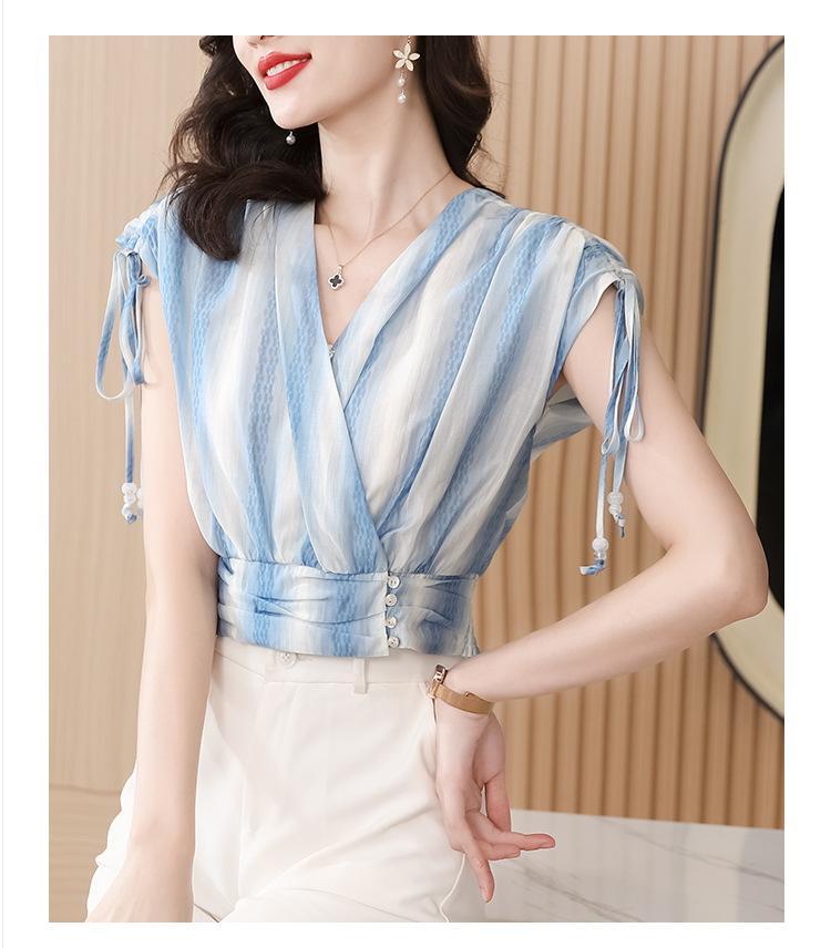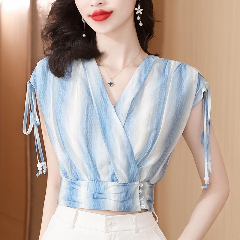 Diseño Estilo Francés Cuello en V con Cordones Camisa Corta para Mujer 2024 Verano Nueva Moda Reductor de Edad Top Rayado Azul