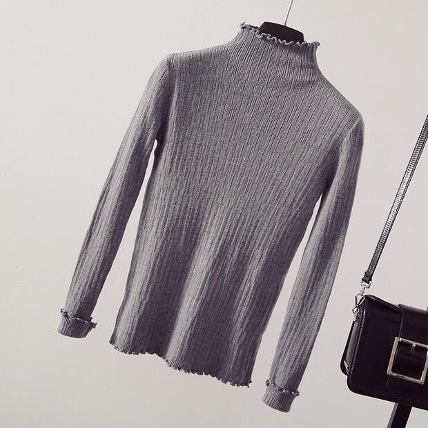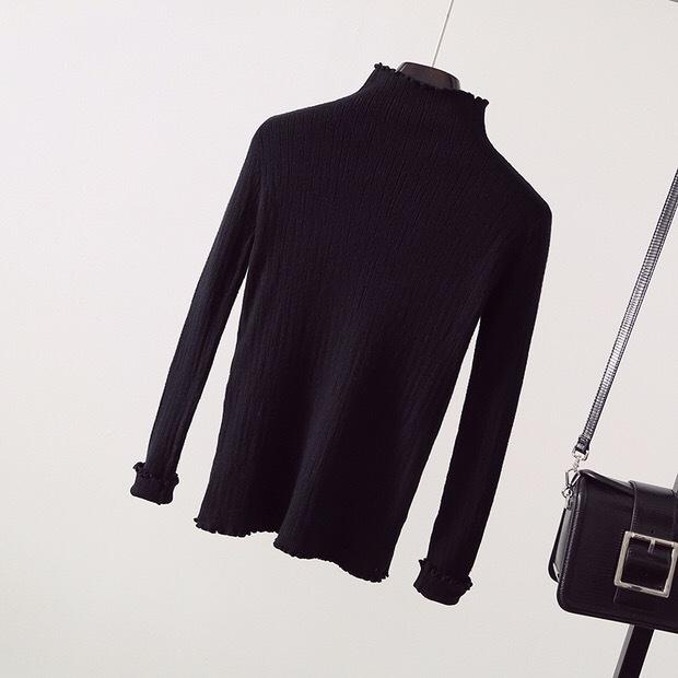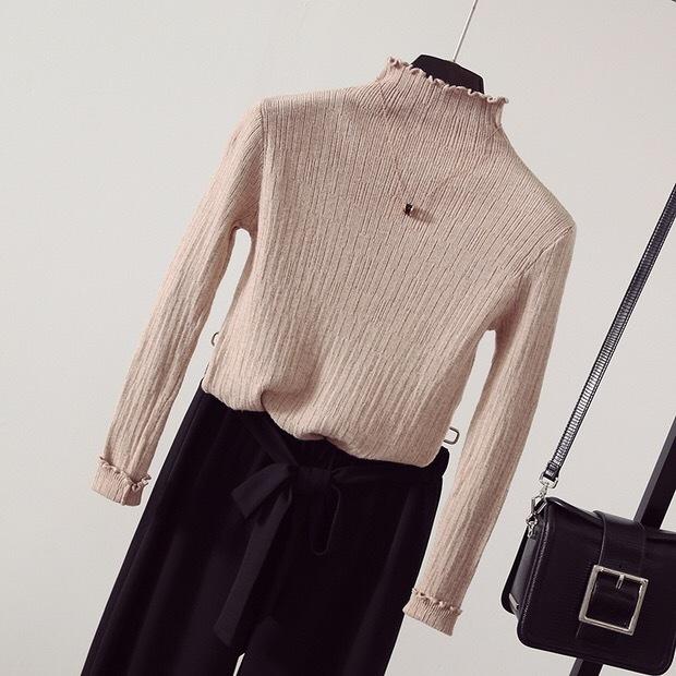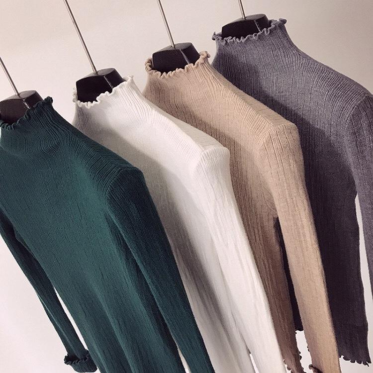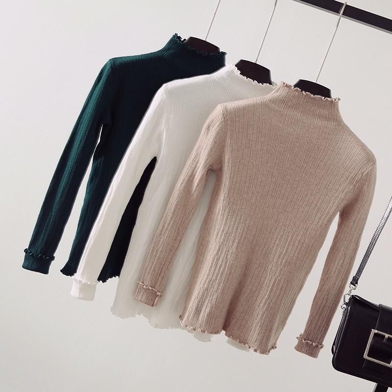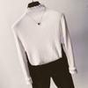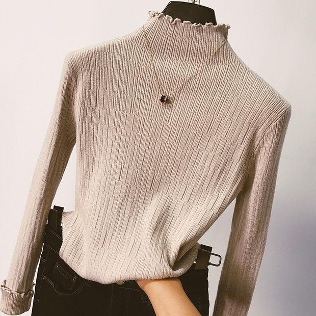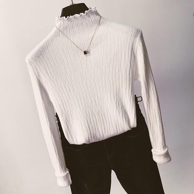 Suéter de punto ajustado blanco de otoño e invierno, nuevo, con cuello medio, manga larga, hilo, jersey para mujer, camisa con borde en la oreja que combina con todo.