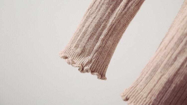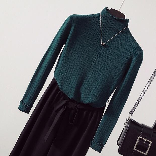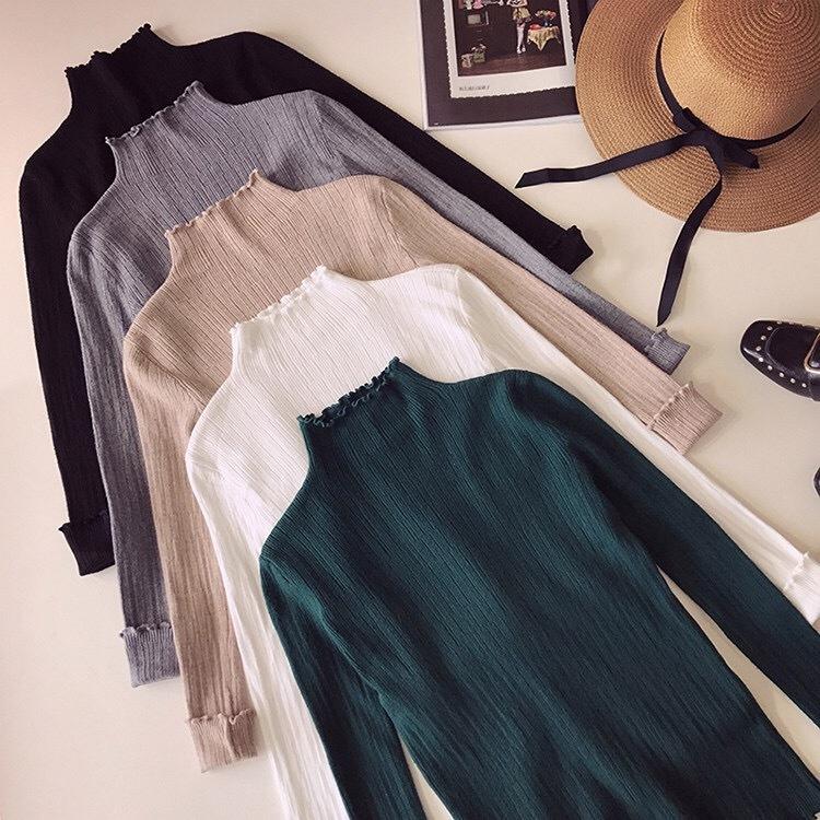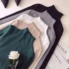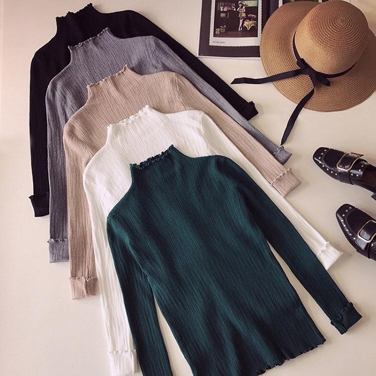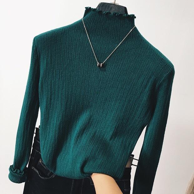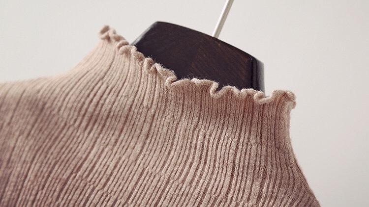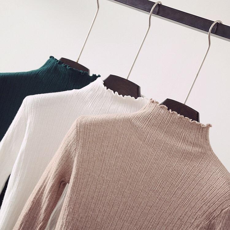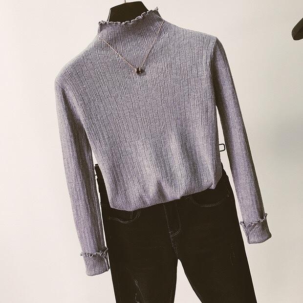 Suéter de punto ajustado blanco de otoño e invierno, nuevo, con cuello medio, manga larga, hilo, jersey para mujer, camisa con borde en la oreja que combina con todo.