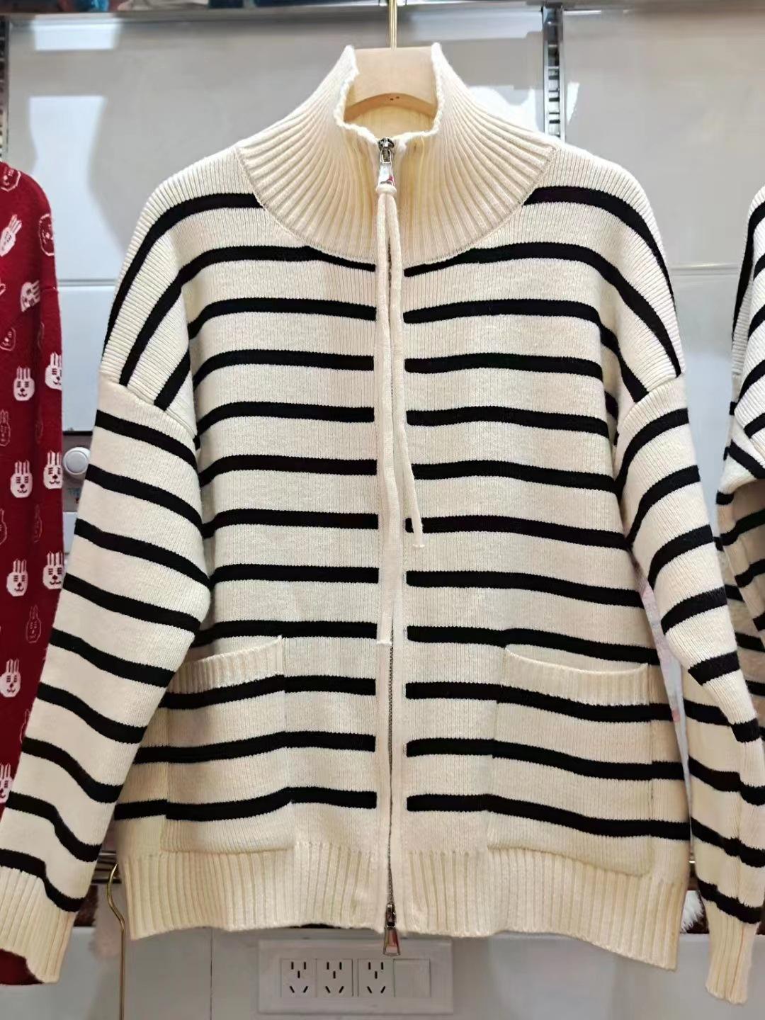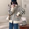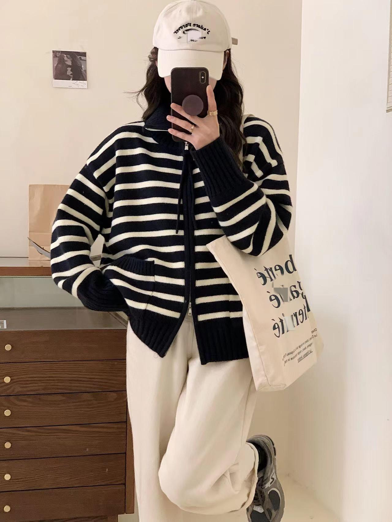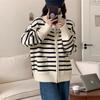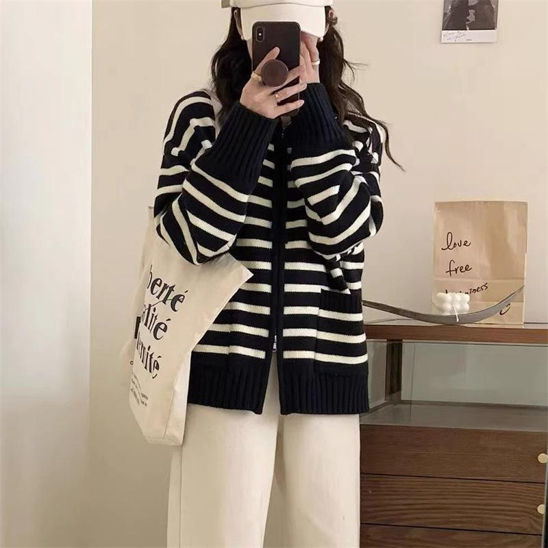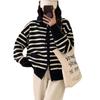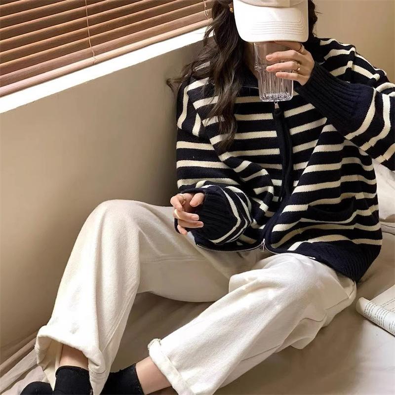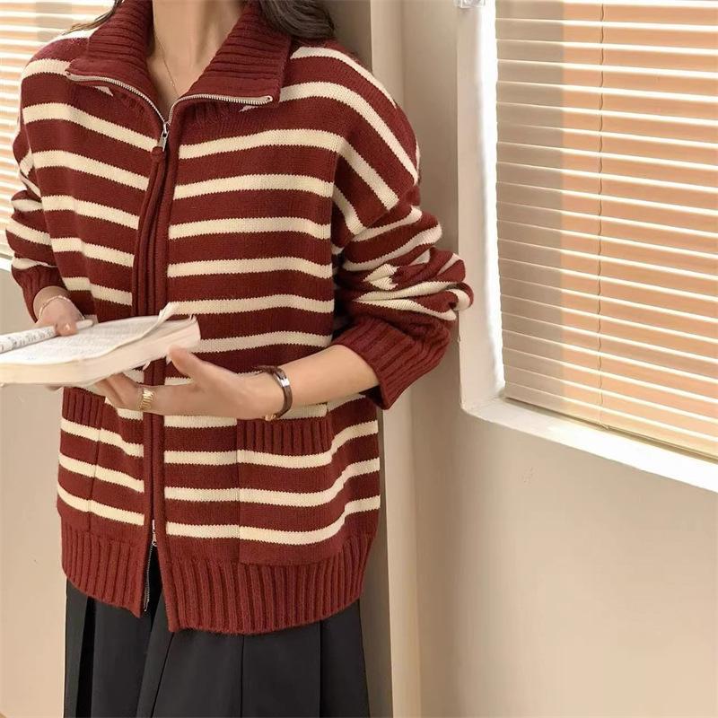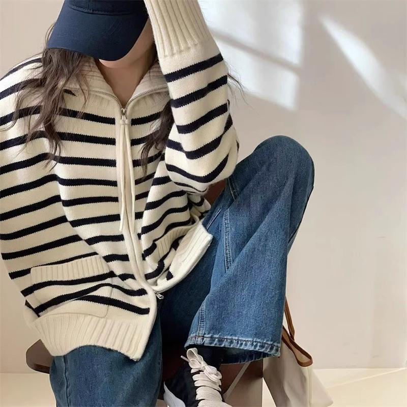 Cárdigan de punto con solapa a rayas de color contrastante de estilo coreano para mujer, nueva moda de otoño e invierno 2024, abrigo de suéter con cremallera que combina con todo para mujer