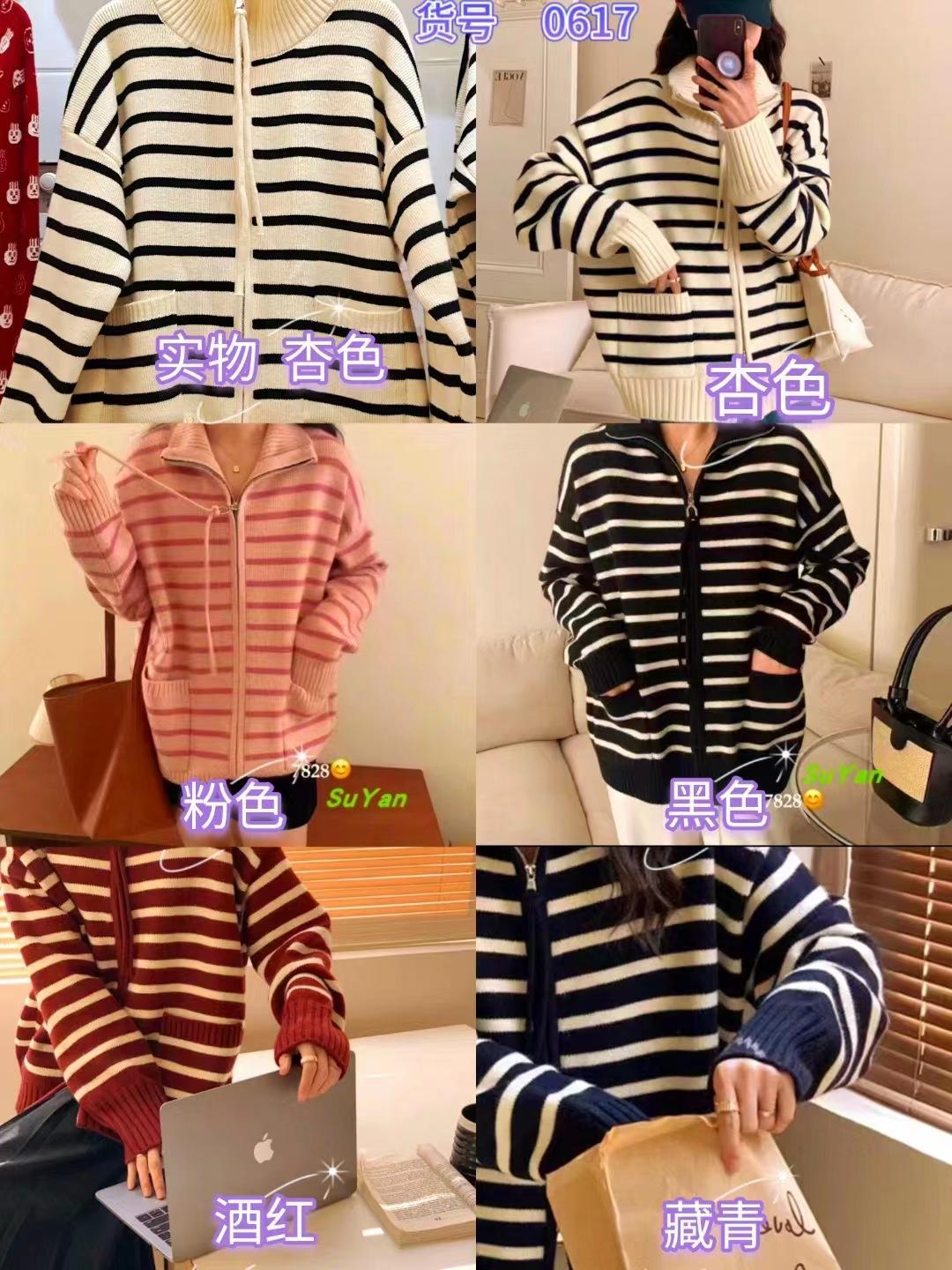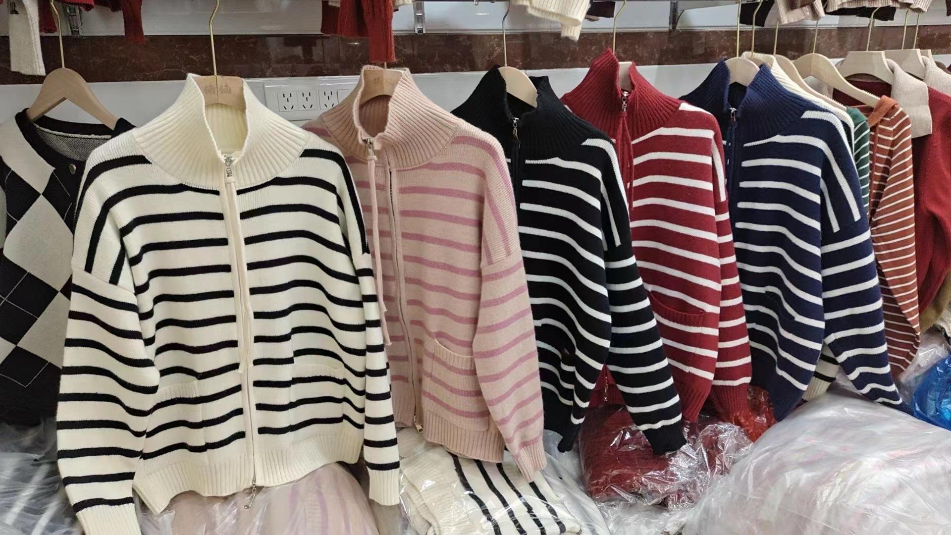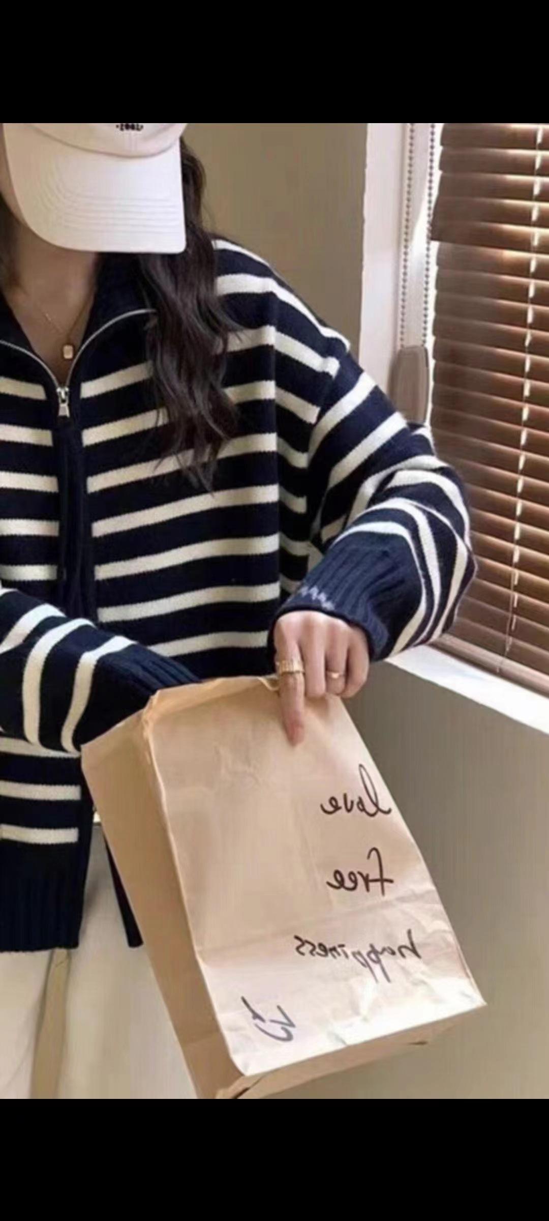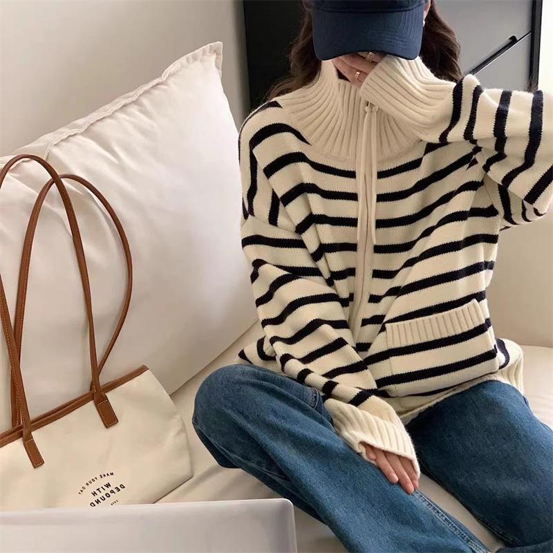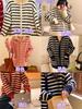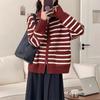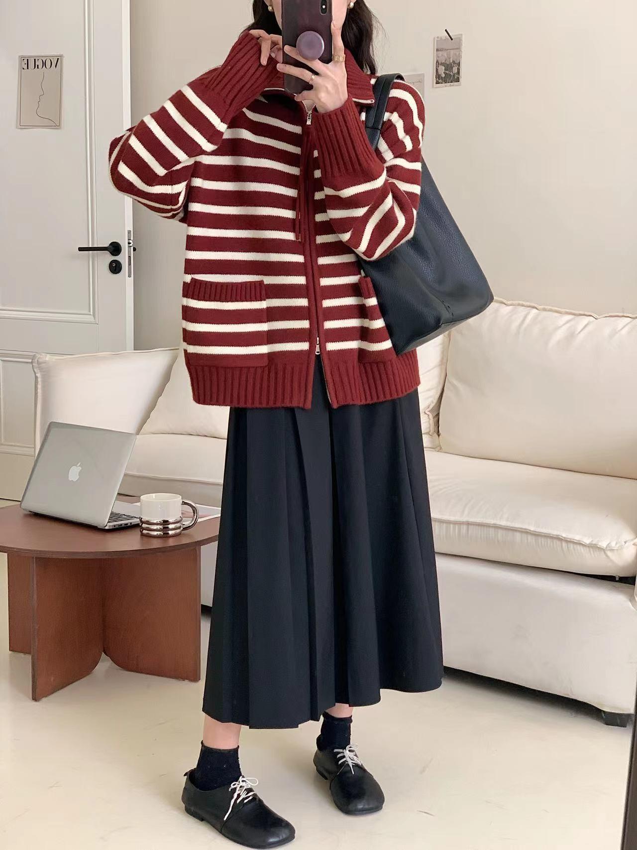 Cárdigan de punto con solapa a rayas de color contrastante de estilo coreano para mujer, nueva moda de otoño e invierno 2024, abrigo de suéter con cremallera que combina con todo para mujer