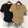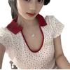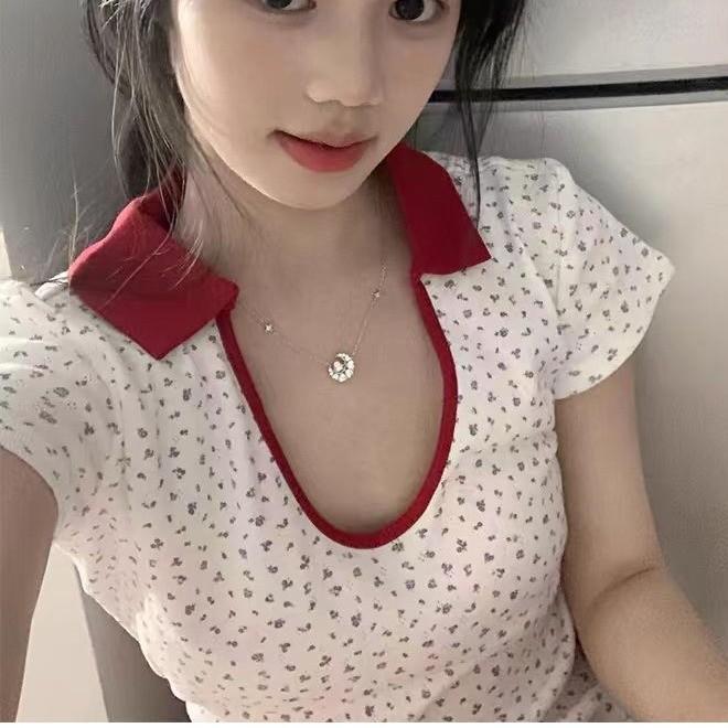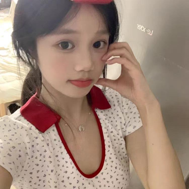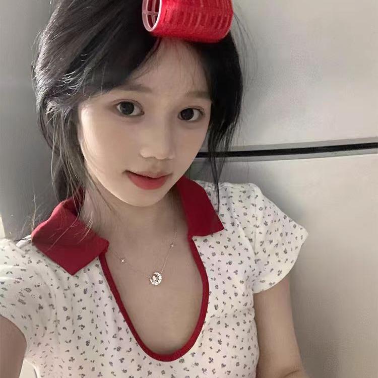 Top de verano ajustado con cuello en V y estampado floral blanco de manga corta para mujer, estilo americano, estilo Hong Kong, tendencia elegante.