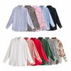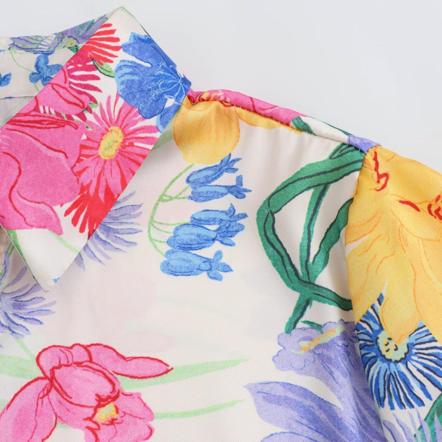 Exportación de ropa femenina de estilo europeo y americano, nueva camisa holgada de manga larga decorada con bolsillo y solapa de seda satinada con estampado floral retro americano.