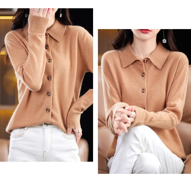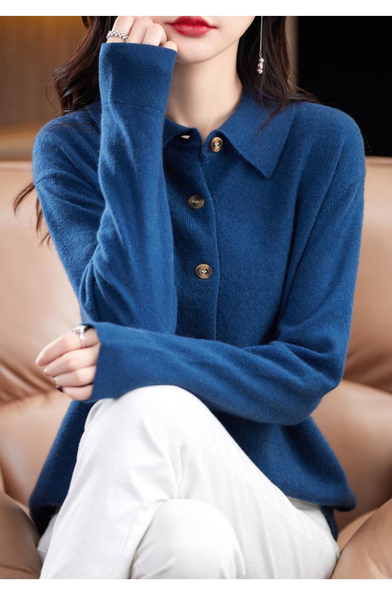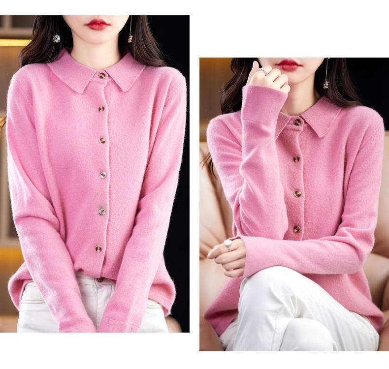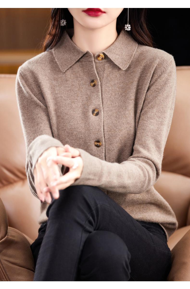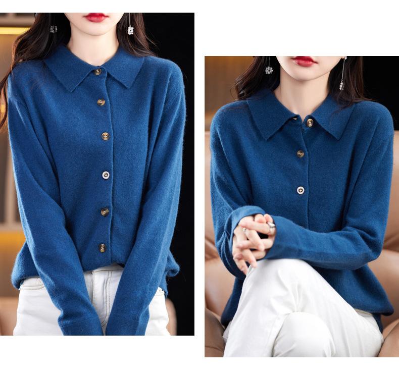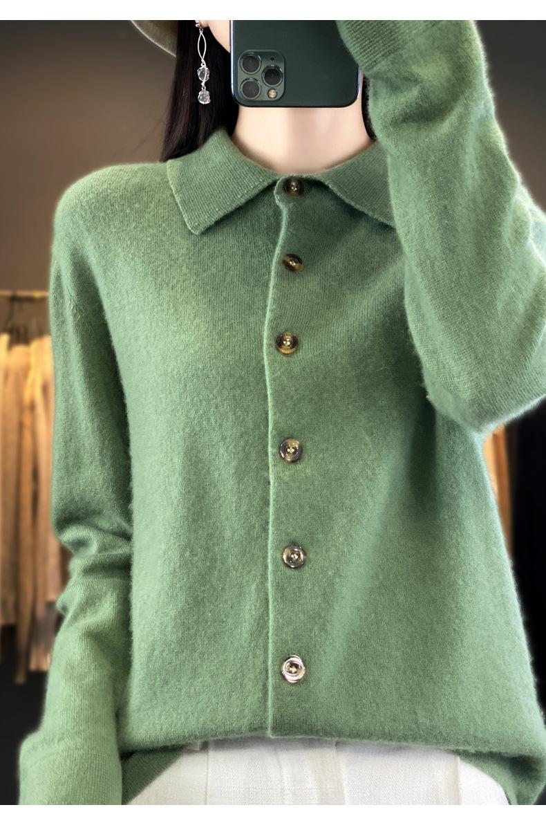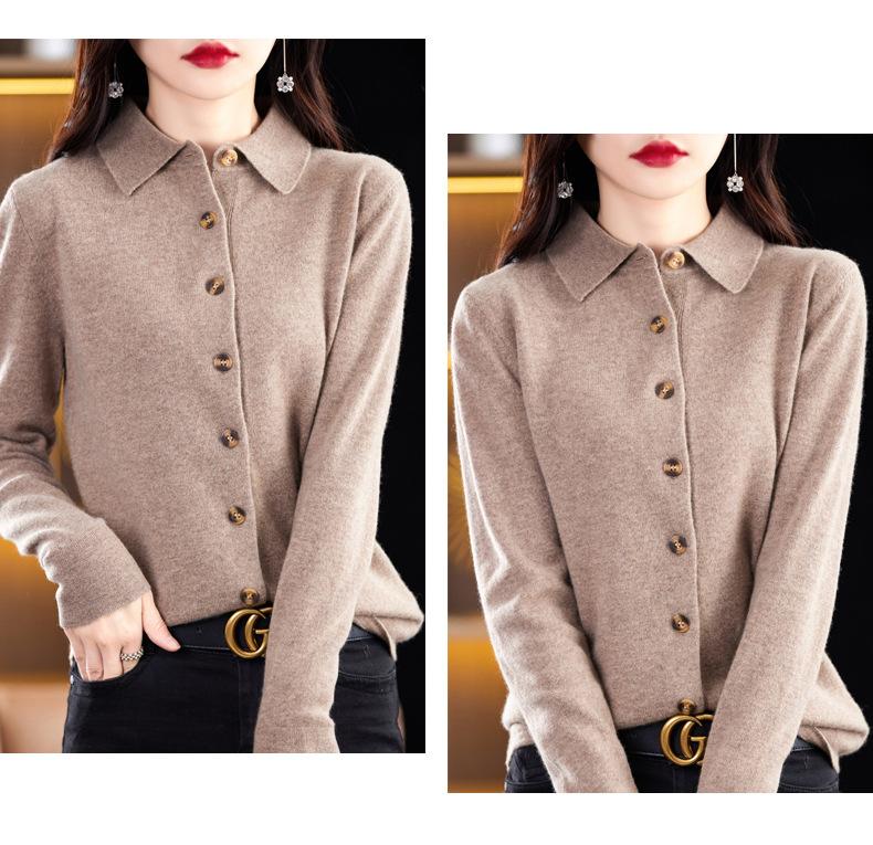 Cárdigan de Punto Elegante con Cuello POLO de Manga Larga para Mujer Andy Velvet Color Sólido Hebilla Casual Sencillo Suave Ceroso Chaqueta Base