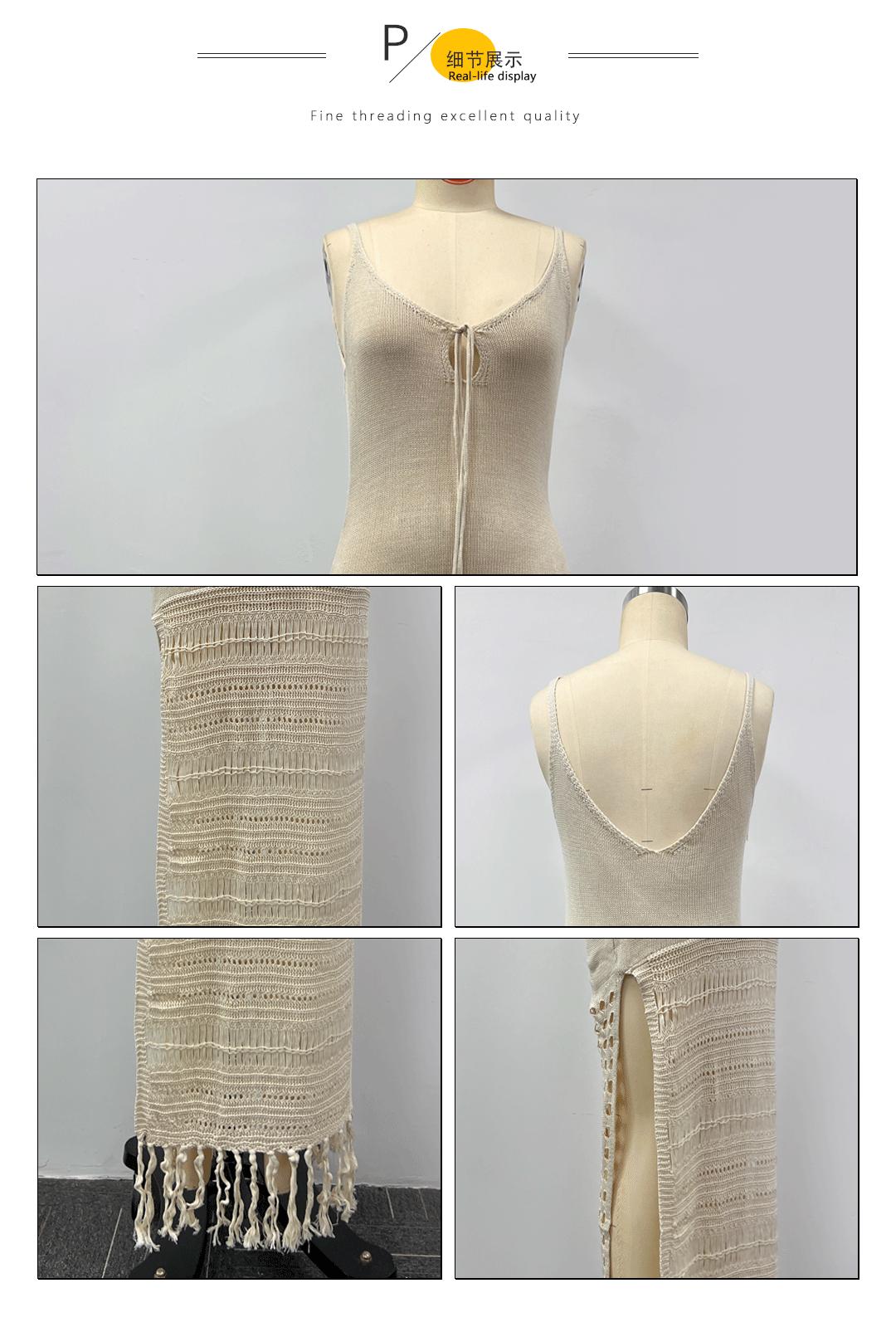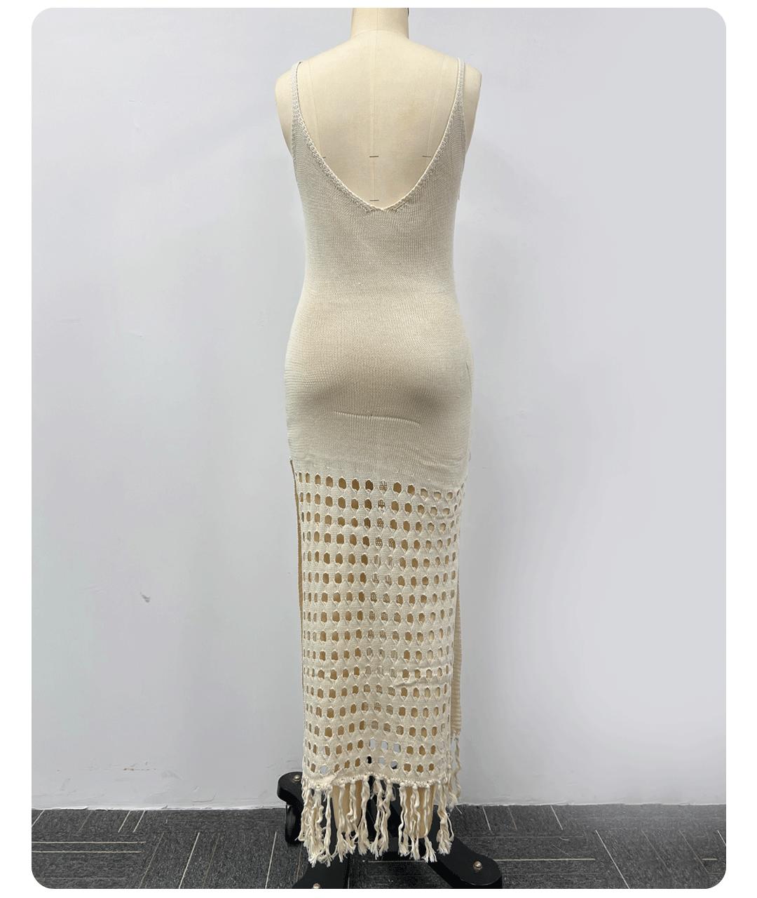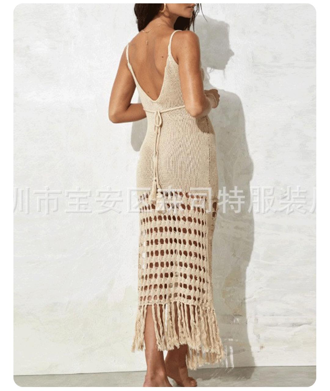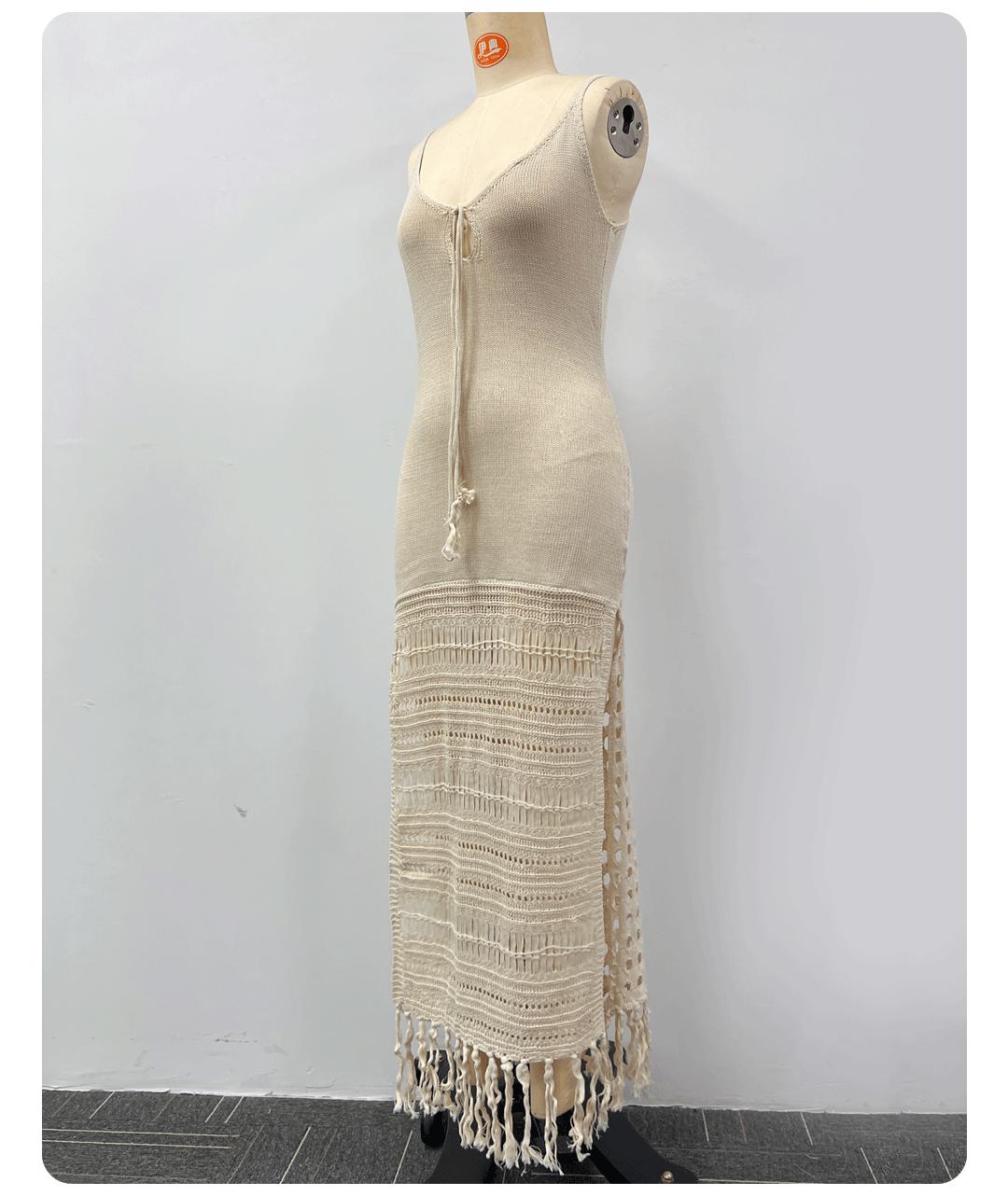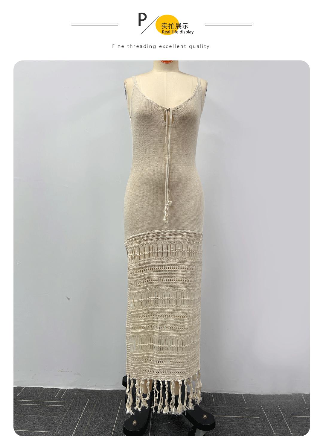 Vacaciones de Playa Grupo Tirantes Cuello en V Transfronterizo Falda Larga con Borlas de Crochet Blusa de Punto con Aberturas Vestido sin Mangas