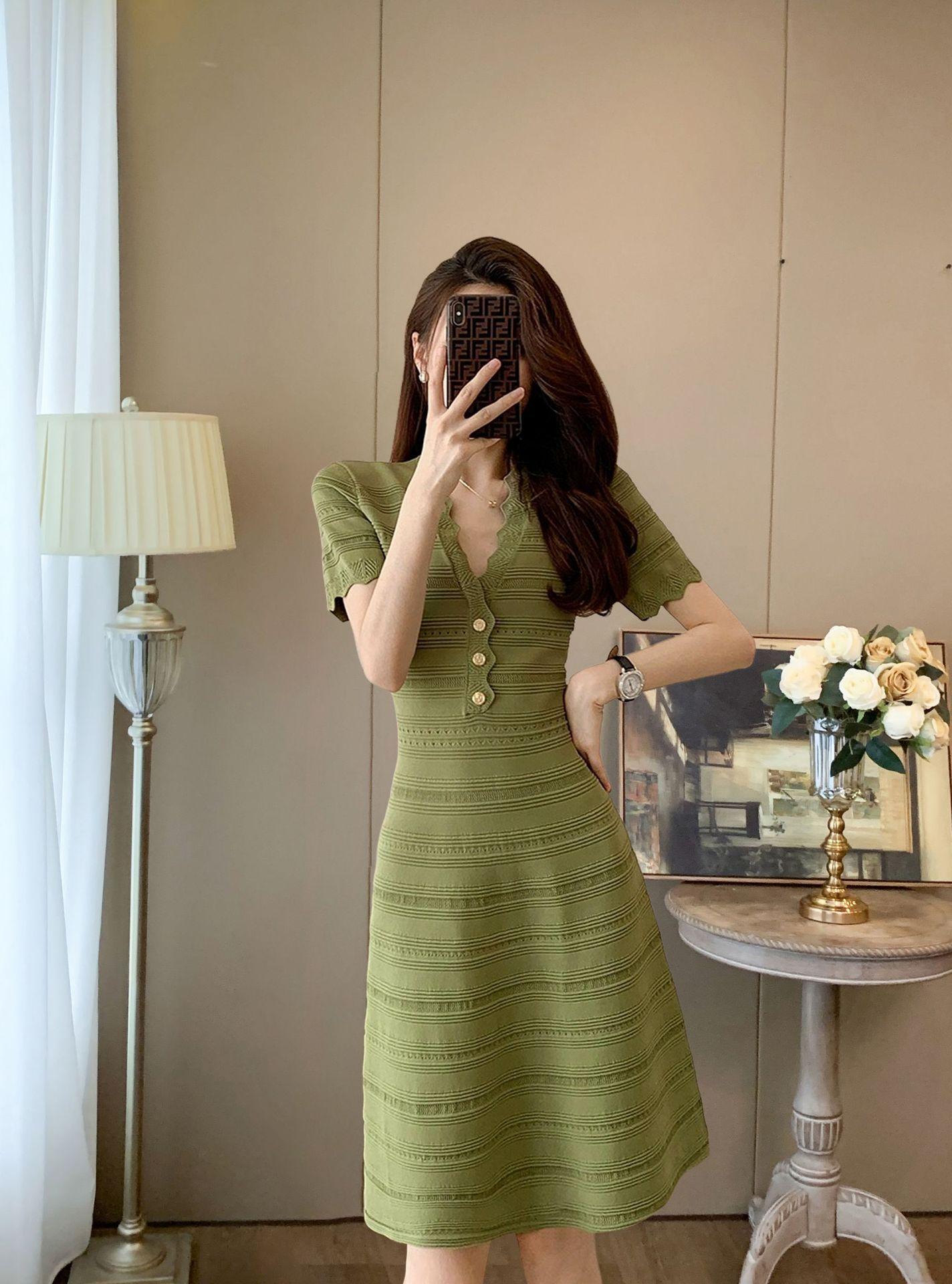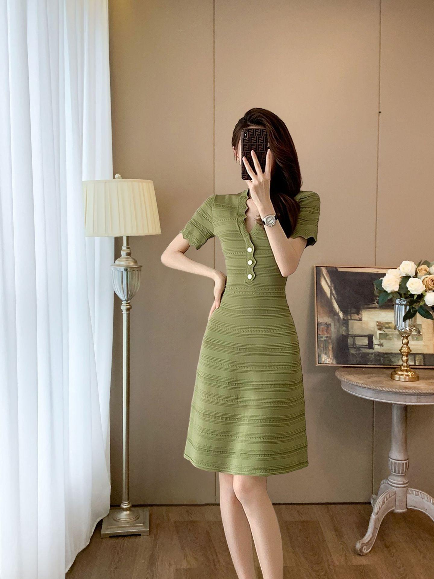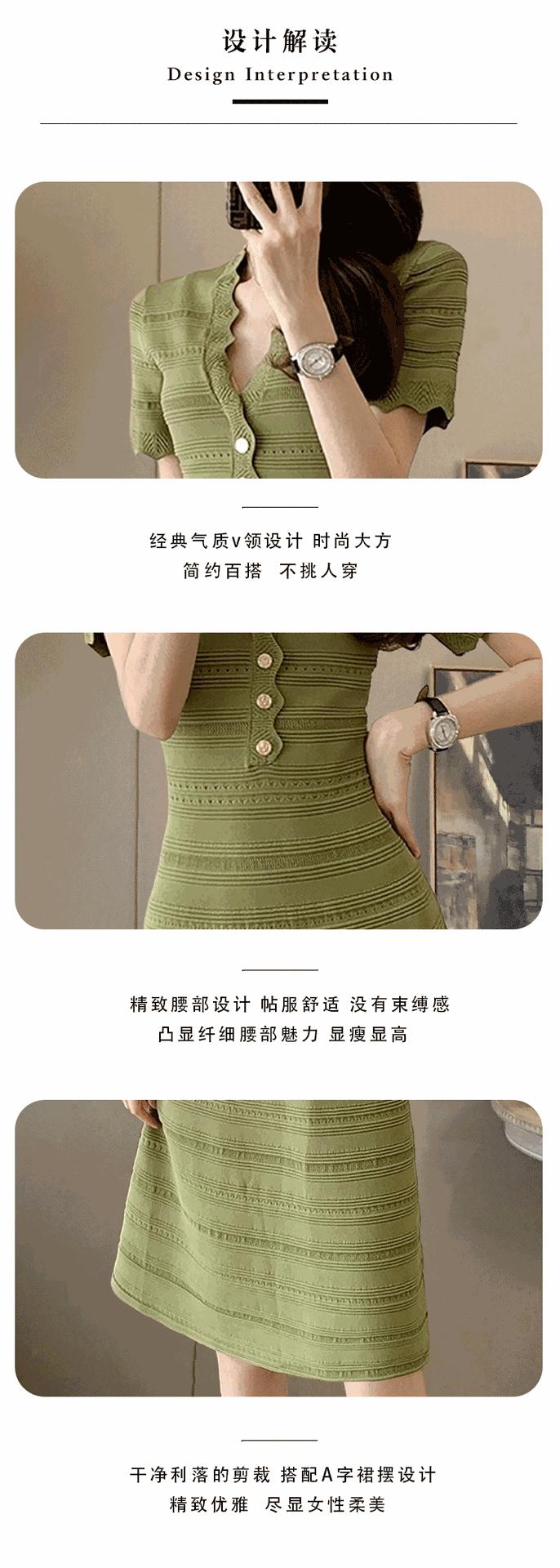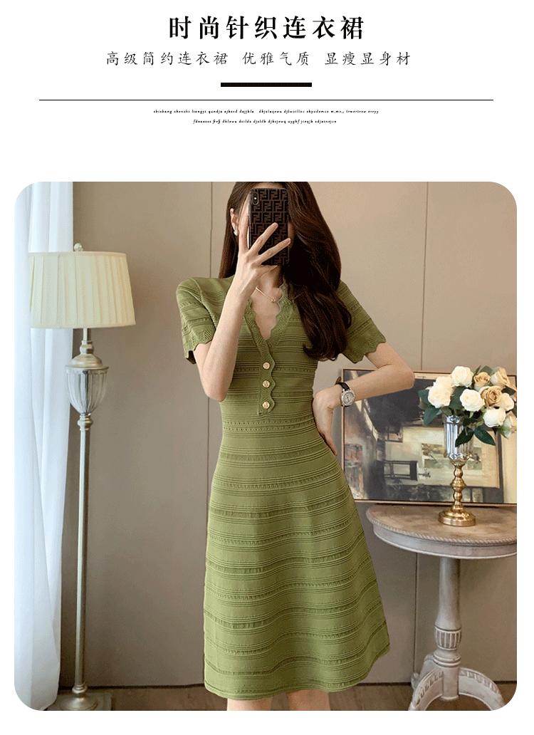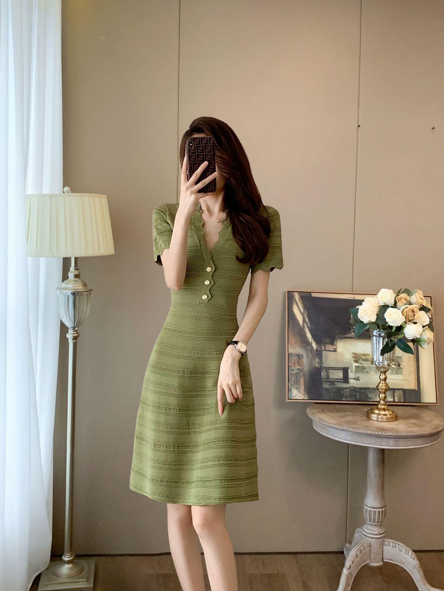 Vestido Elegante Francés de Lujo Accesible de Alta Gama 25 Nuevo Estilo de Primavera y Verano Ligero y Maduro Elegante Cintura Adelgazante Look Cuello en V Falda Línea A
