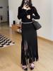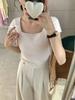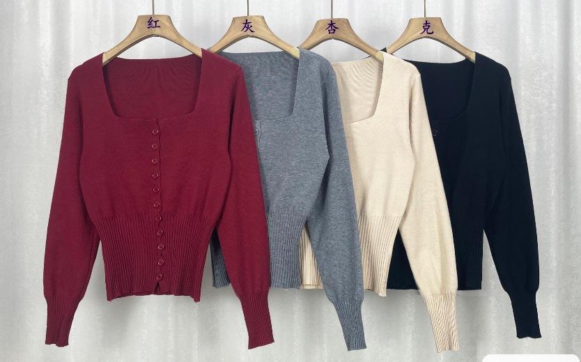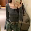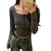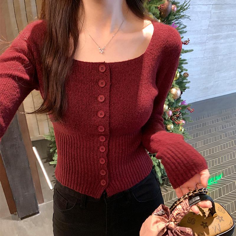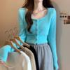 Punto de manga larga ajustado de cintura corta con cuello cuadrado para mujer Otoño e Invierno Nuevo Cárdigan pequeño Color puro Top de cintura alta