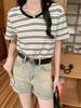 Camiseta de manga corta a rayas con escote en V y hombros descubiertos para mujer, verano 2024, nuevo diseño, camiseta holgada Sense Niche para personas pequeñas.