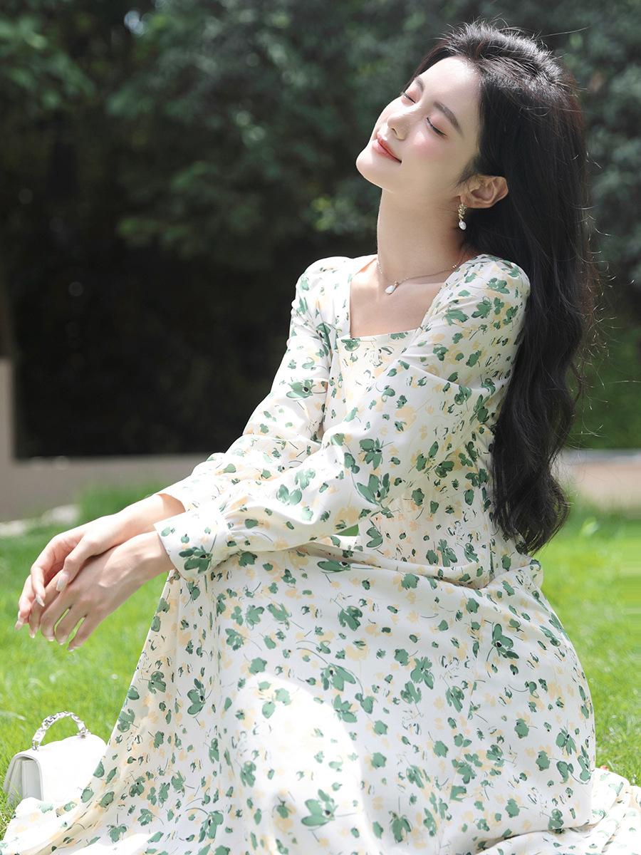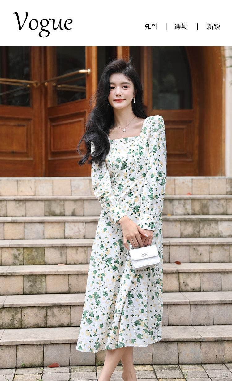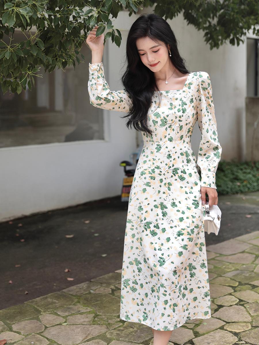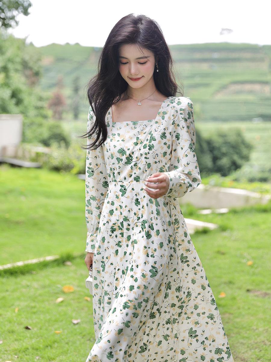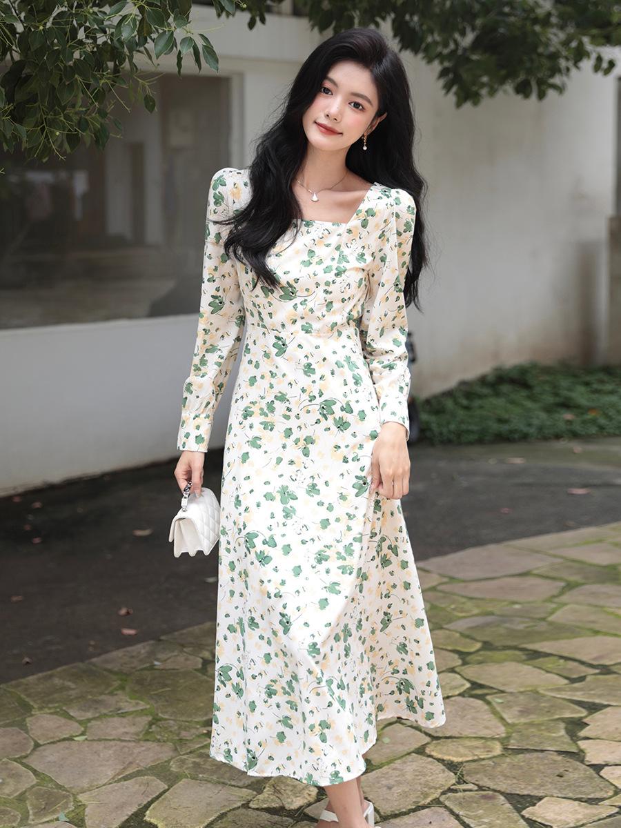 Vestido floral verde para mujer, otoño 2024, nuevo estilo coreano, elegante, cuello cuadrado, cintura adelgazante, manga larga, falda de línea A