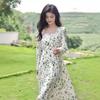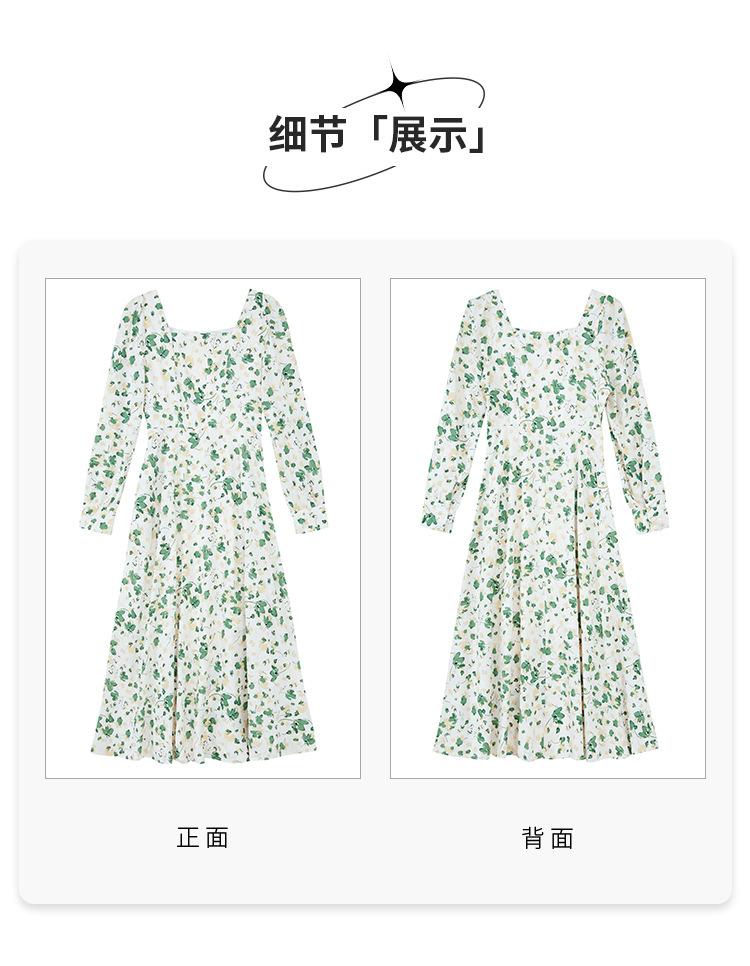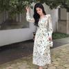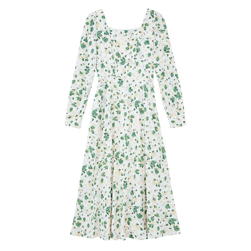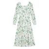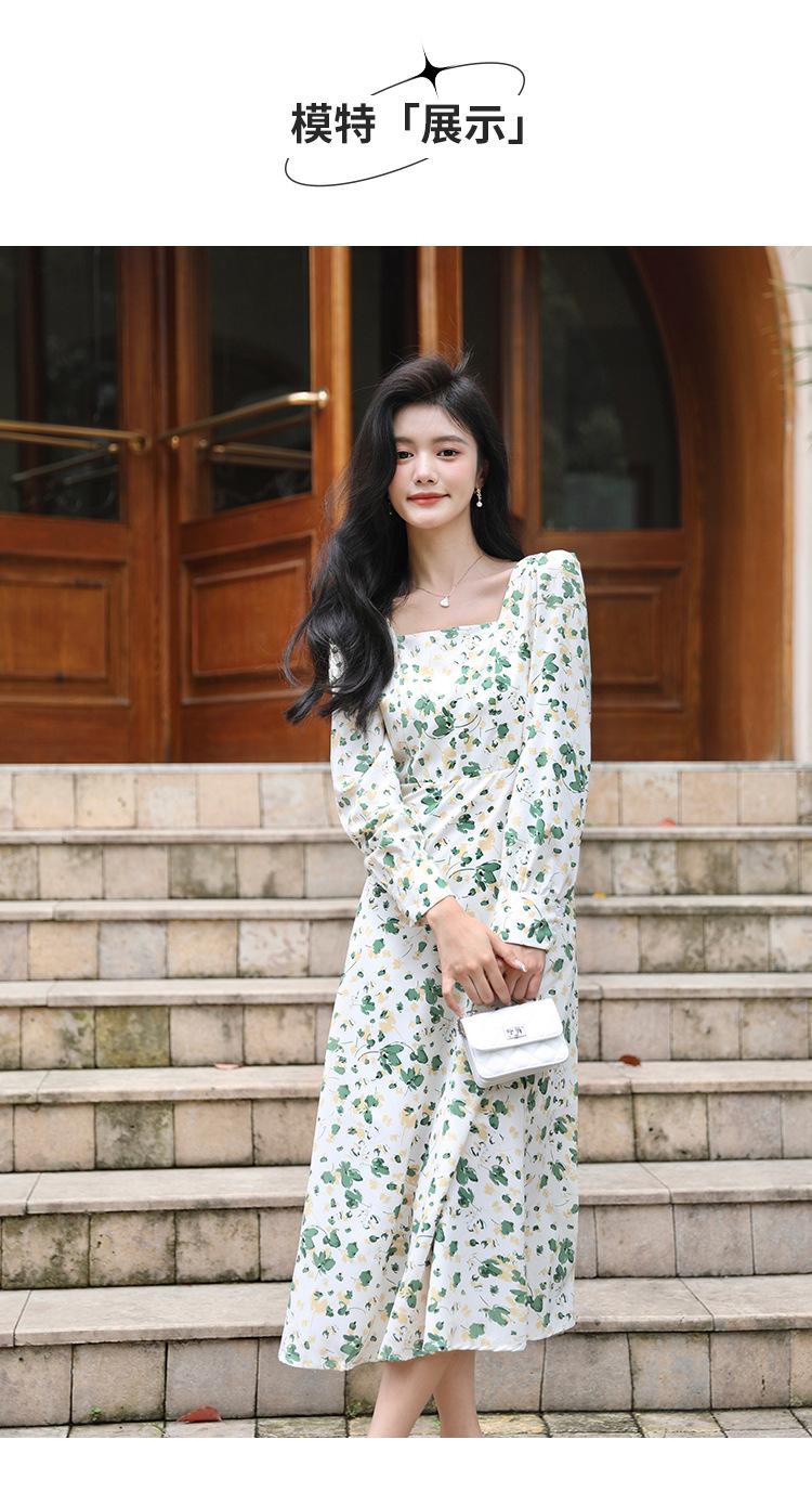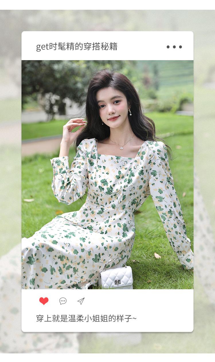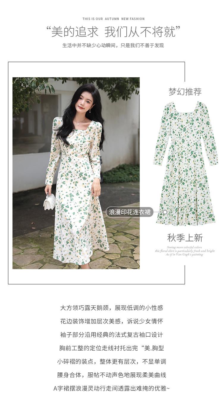 Vestido floral verde para mujer, otoño 2024, nuevo estilo coreano, elegante, cuello cuadrado, cintura adelgazante, manga larga, falda de línea A