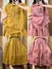 Traje de ramio Conjunto de dos piezas para mujer Verano 2024 Vintage Nicho Estampado Camisa de doble cara Camiseta Falda de talle alto
