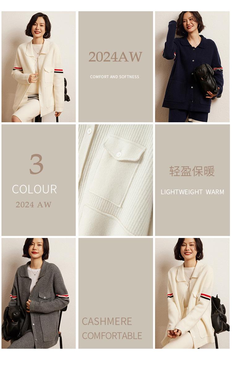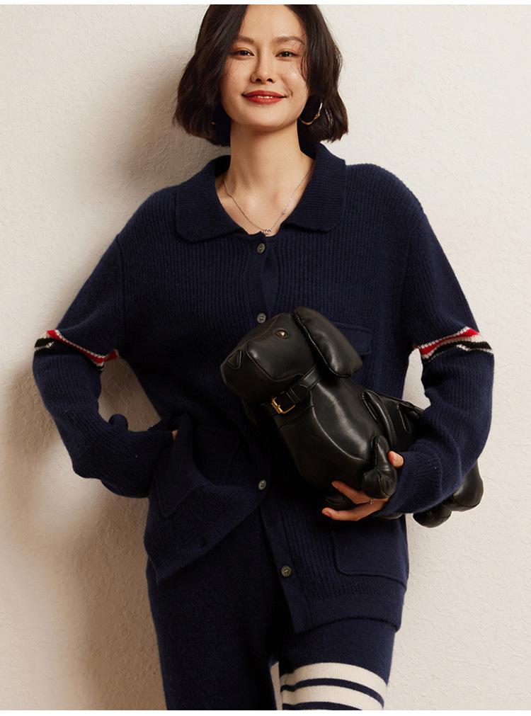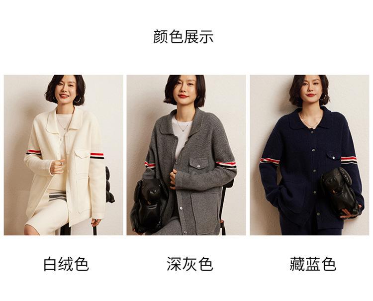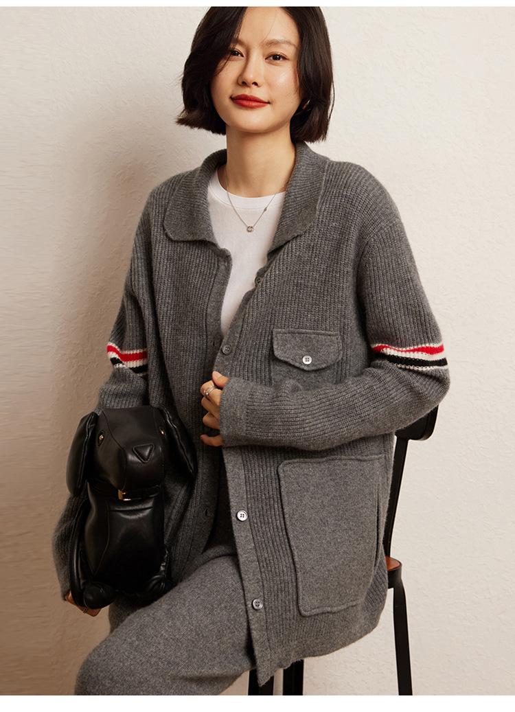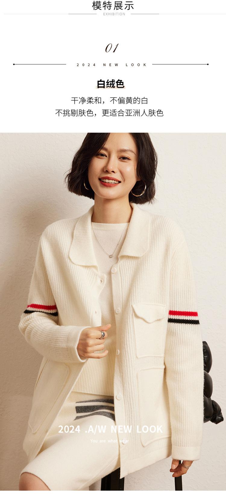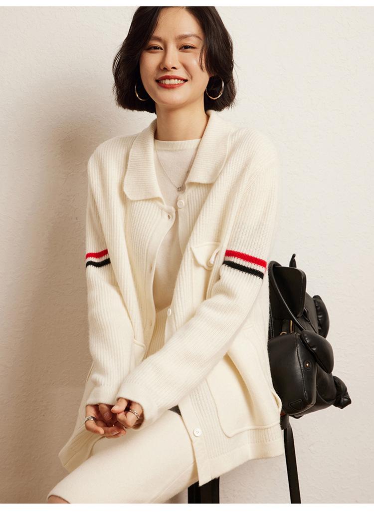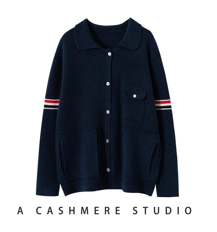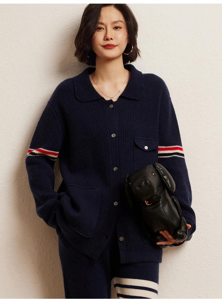 Cachemira de alta gama 2024 otoño e invierno nuevo suéter de punto para mujer con solapa corta, patchwork de color a rayas, estilo holgado y perezoso