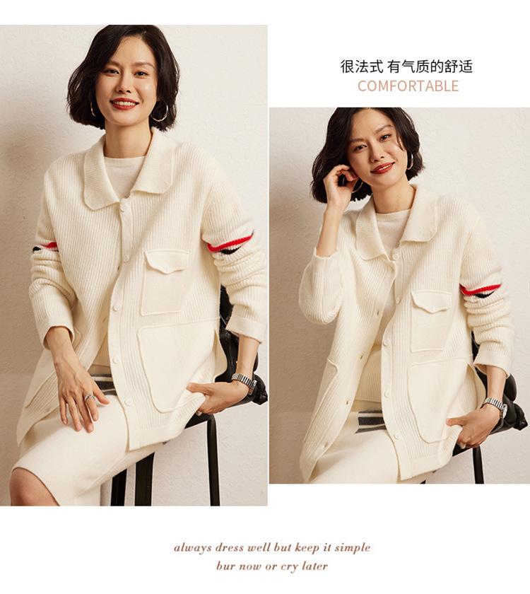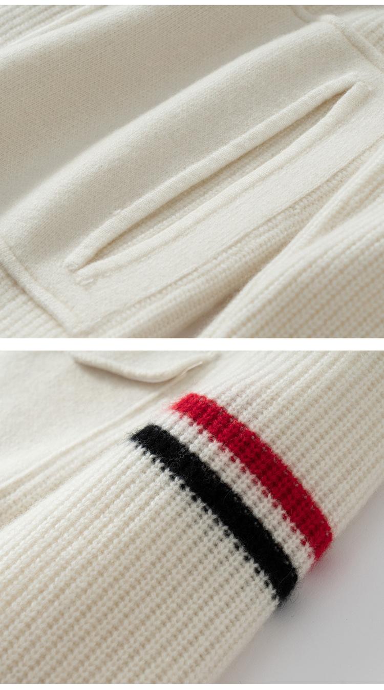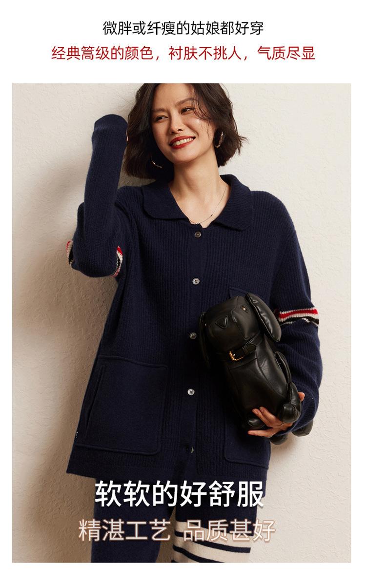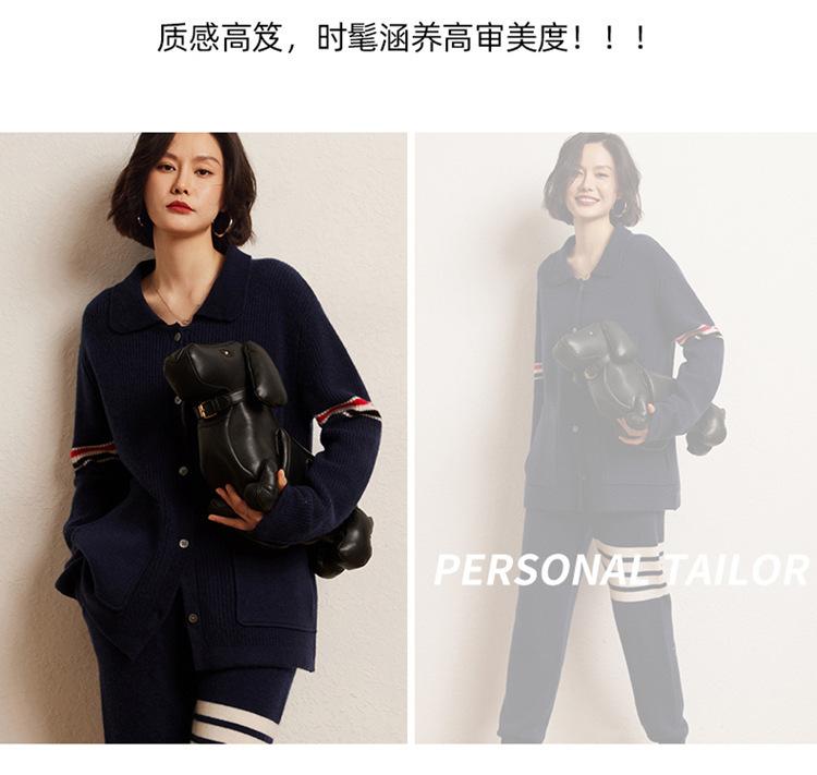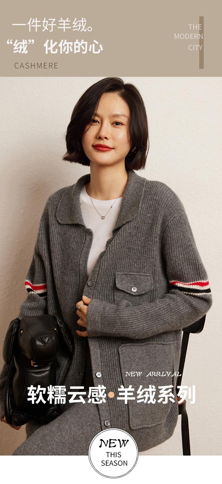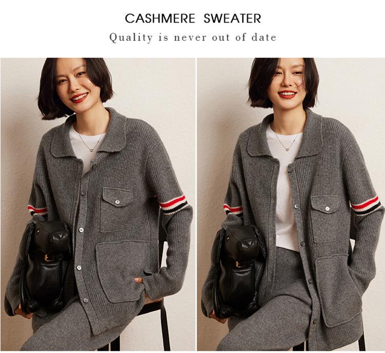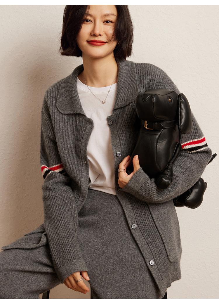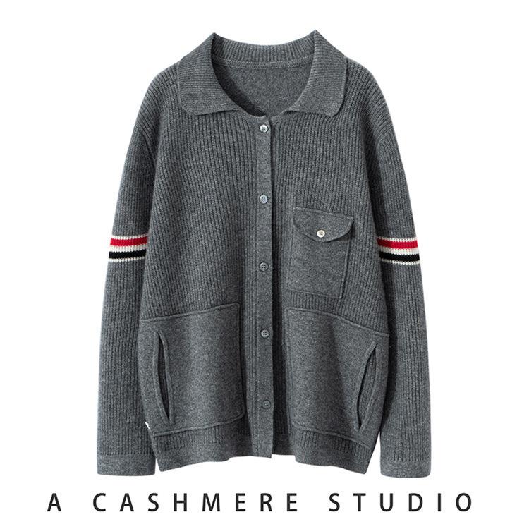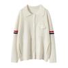 Cachemira de alta gama 2024 otoño e invierno nuevo suéter de punto para mujer con solapa corta, patchwork de color a rayas, estilo holgado y perezoso