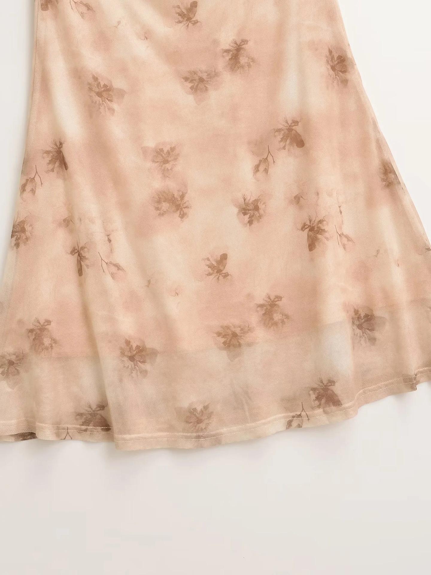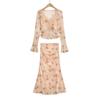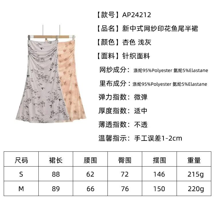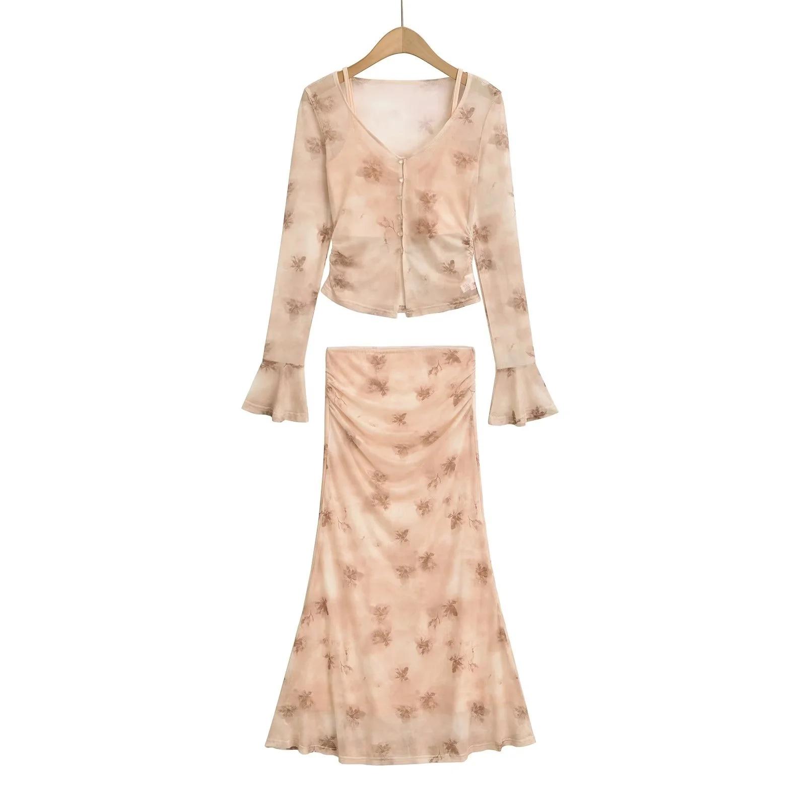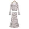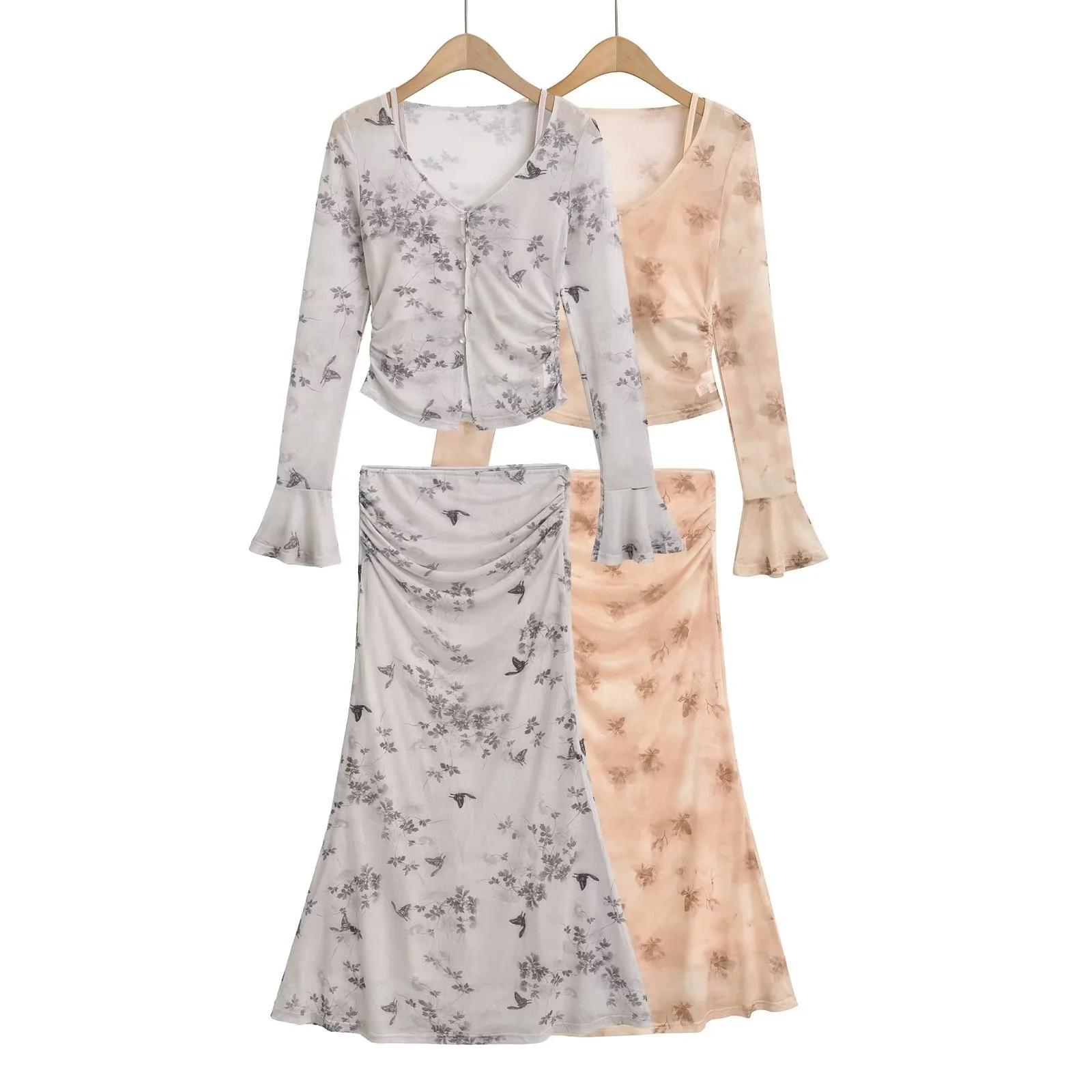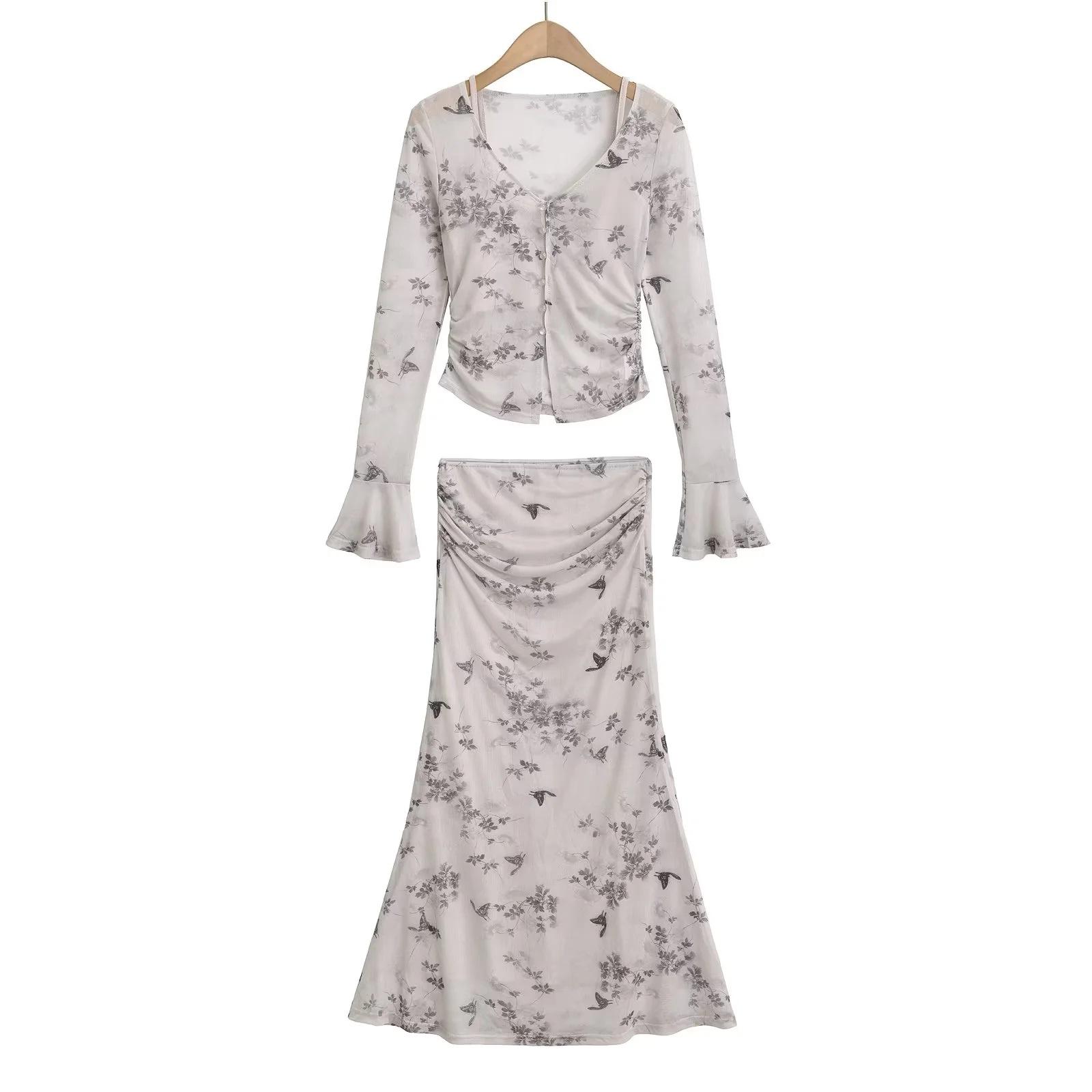 Nuevo Verano 2024 Spice Girl Vintage Top de Manga Trompeta con Costuras de Malla Falda de Cola de Pez de Cintura Alta Conjunto de Dos Piezas para Mujer