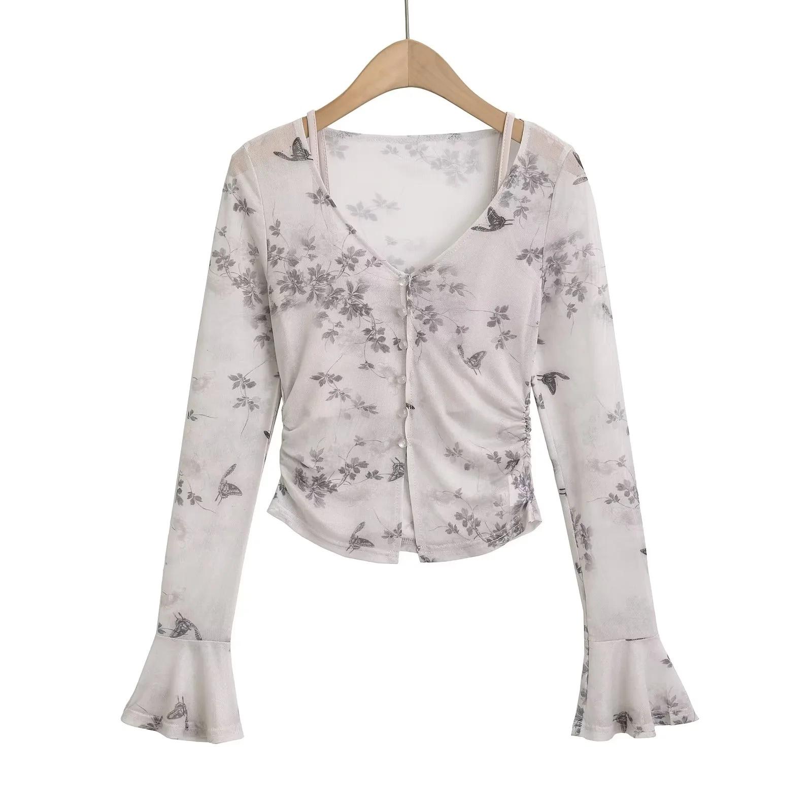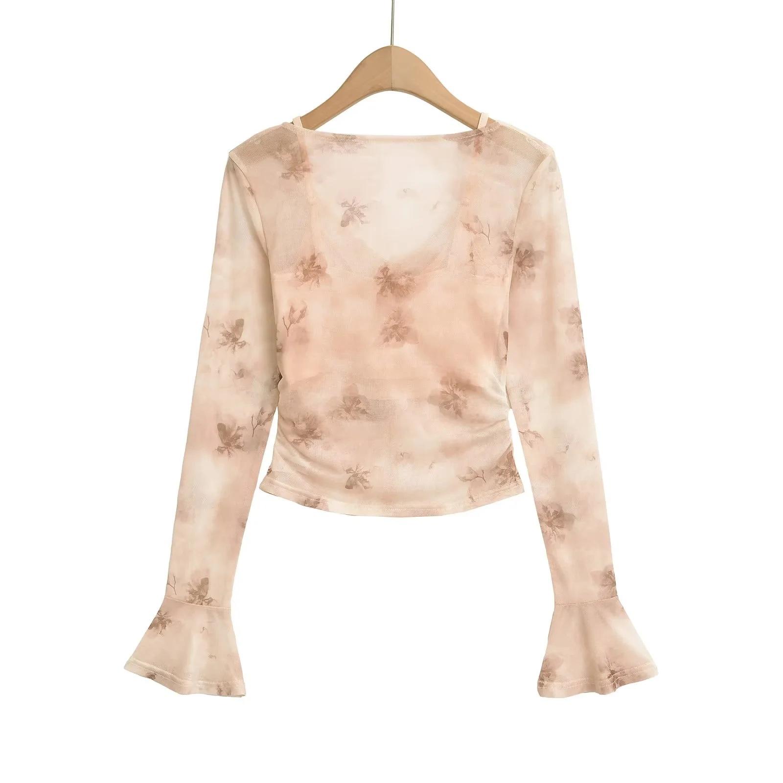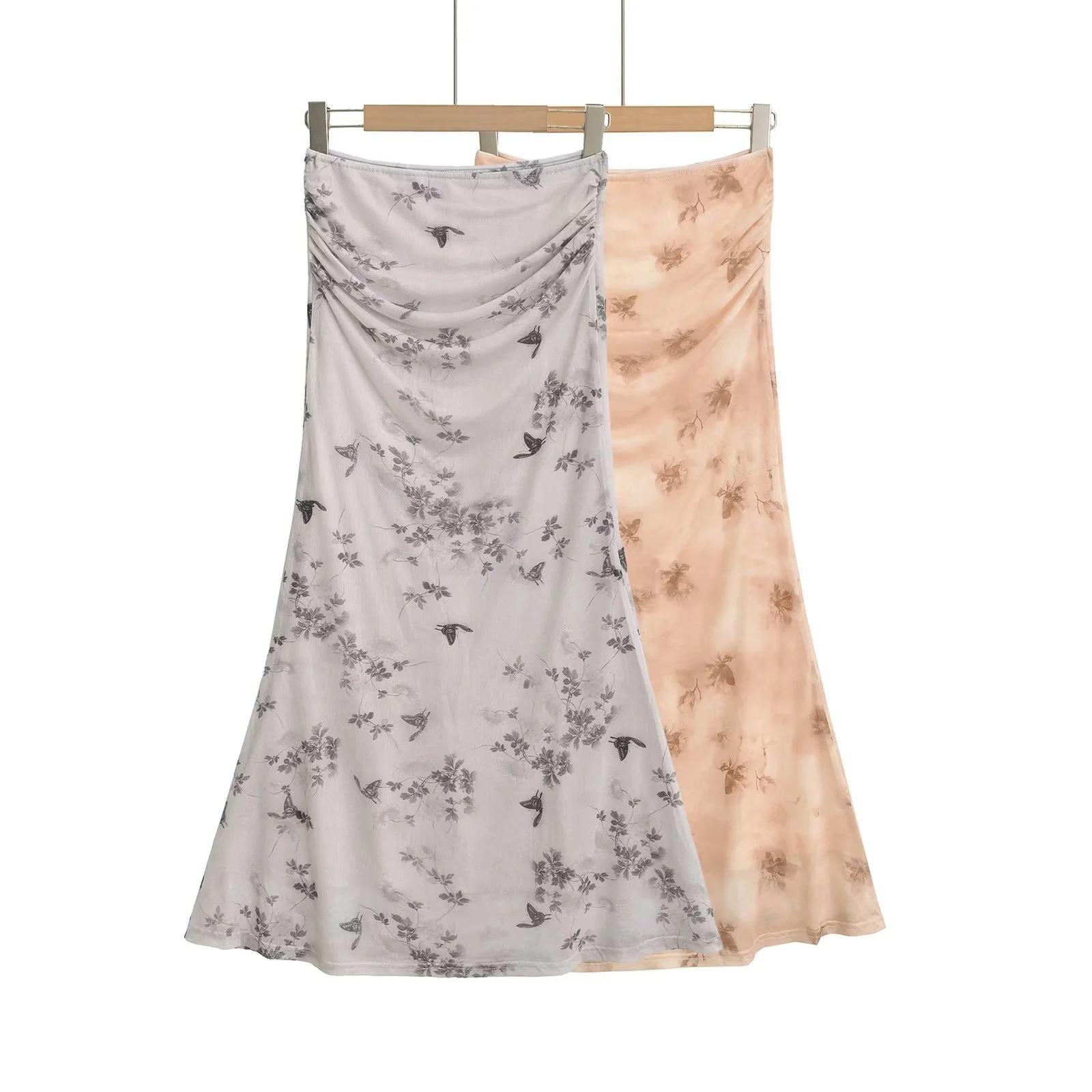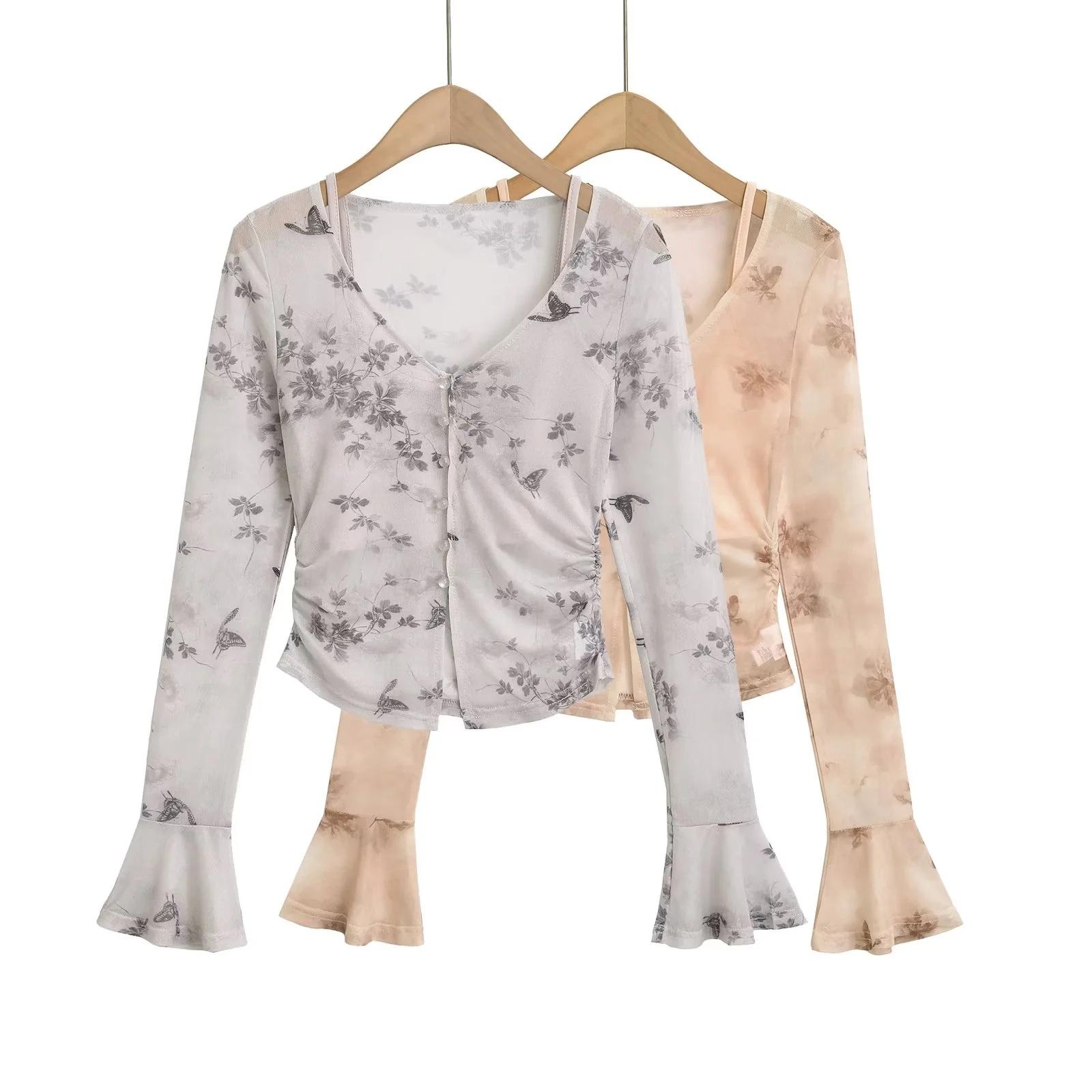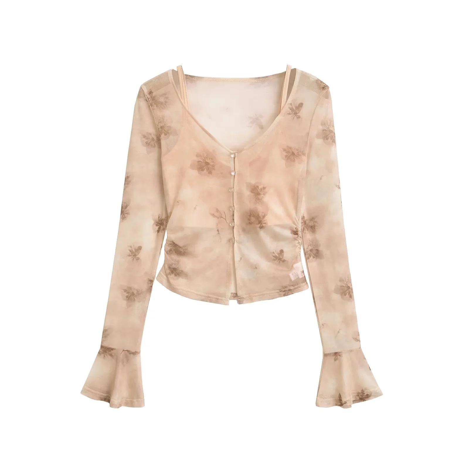 Nuevo Verano 2024 Spice Girl Vintage Top de Manga Trompeta con Costuras de Malla Falda de Cola de Pez de Cintura Alta Conjunto de Dos Piezas para Mujer